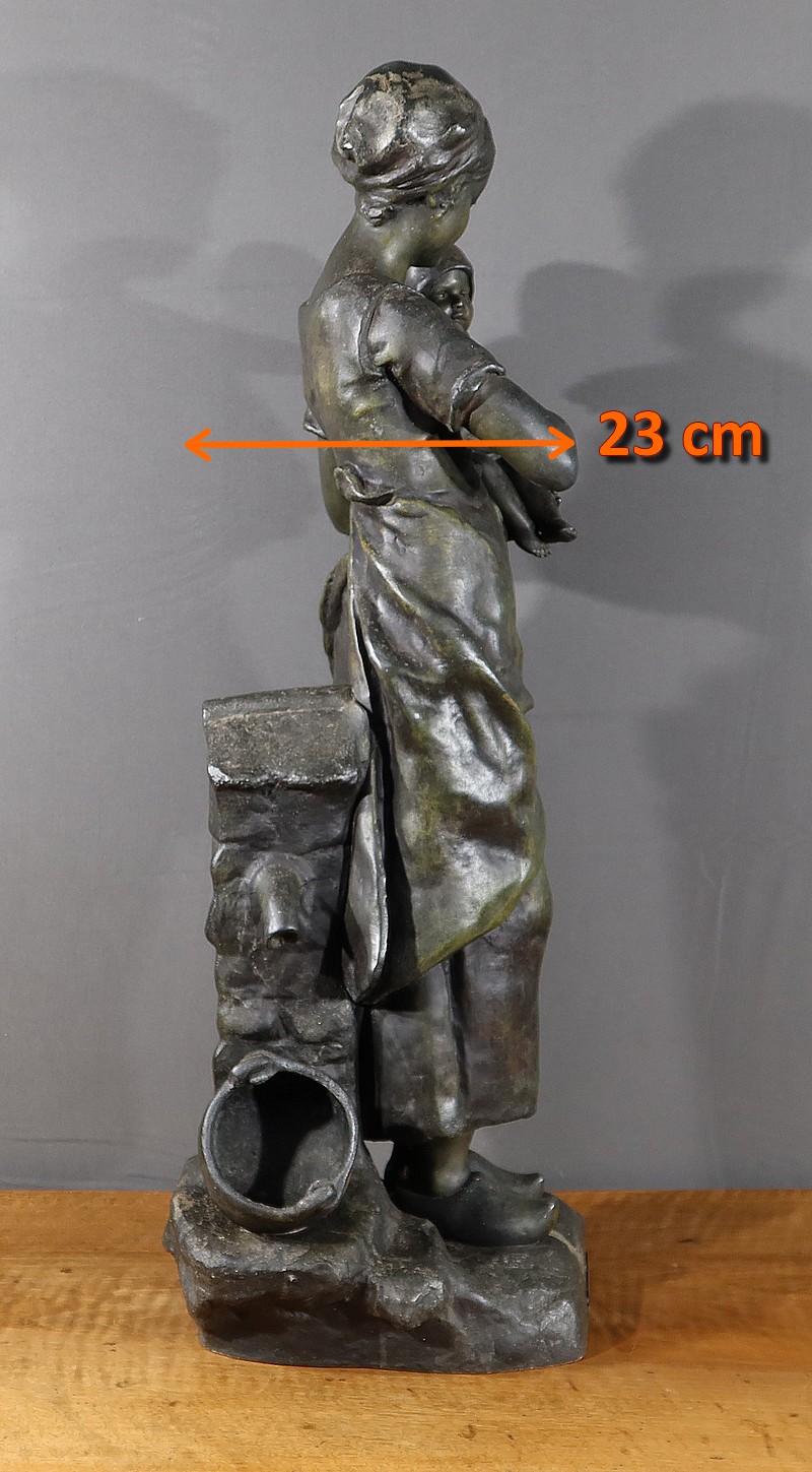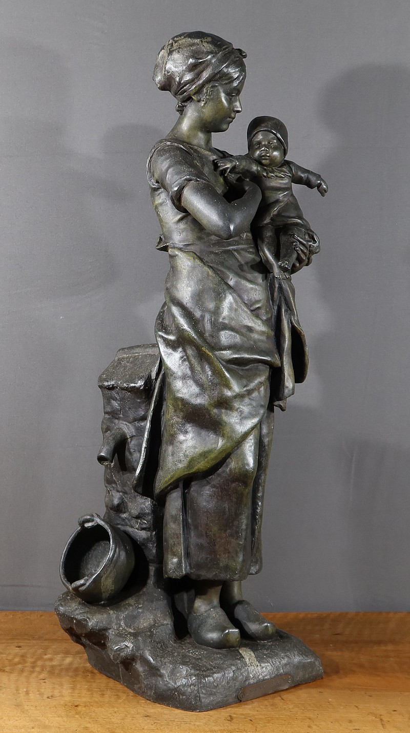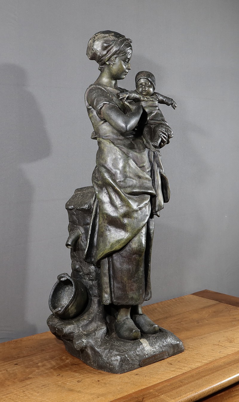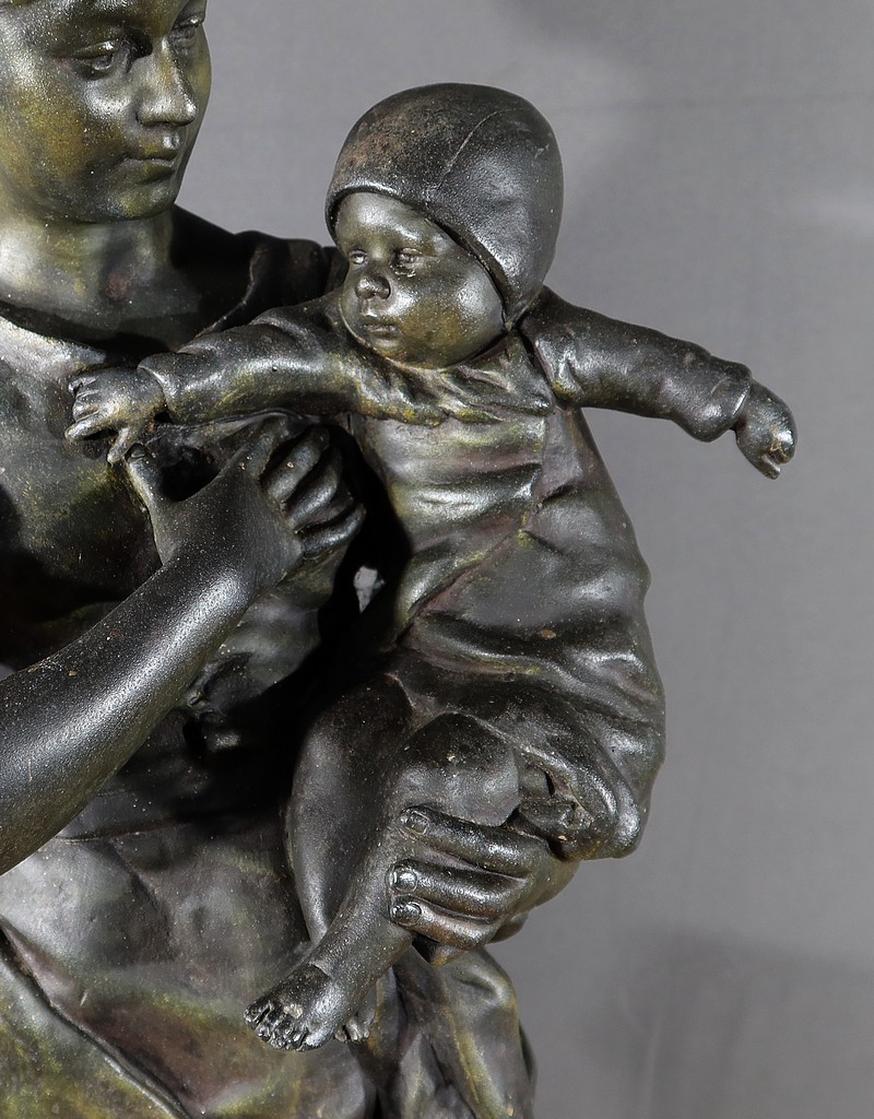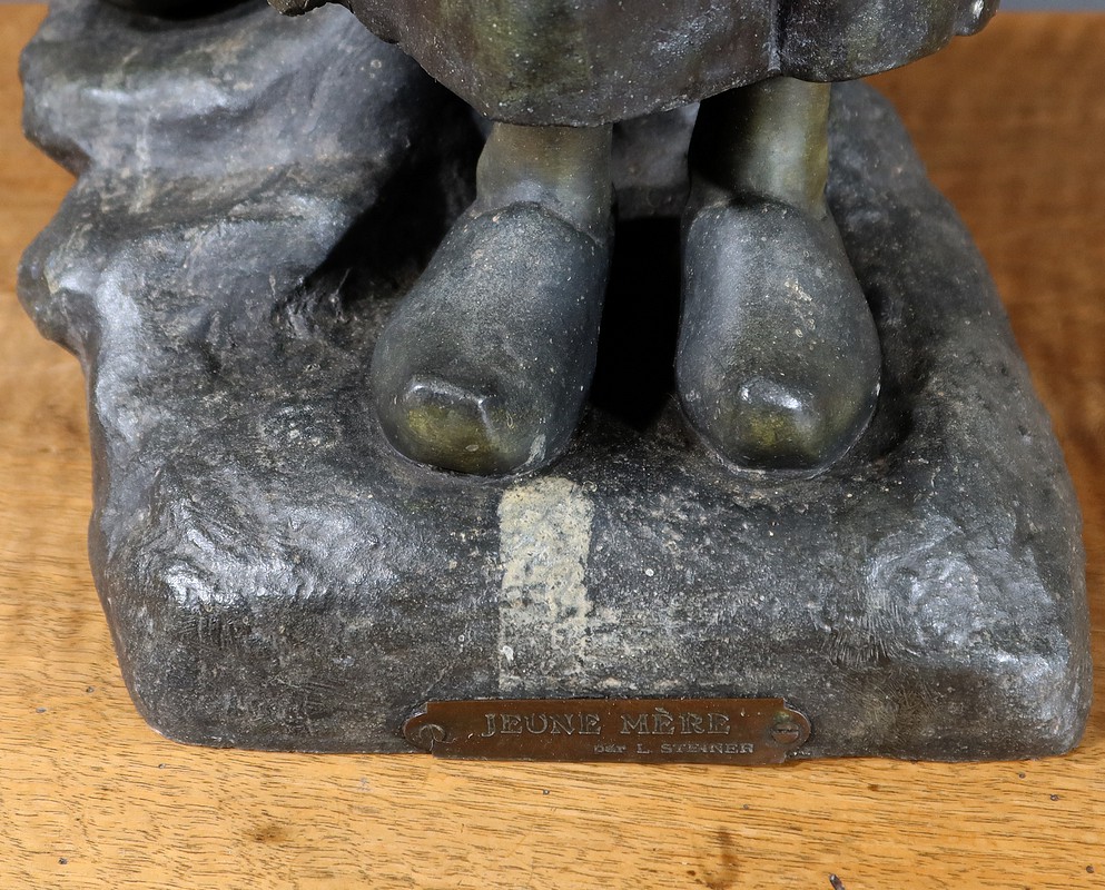 Important Régule à patine verte intitulé « Jeune Mère » par Clément Steiner représentant une jeune paysanne en sabots tenant son enfant dans ses bras, sa main posée sur le cœur. Elle tourne son visage bienveillant vers son bébé et esquisse un sourire. Derrière elle, une fontaine est représentée. A l’avant de la terrasse, une plaque est fixée et annotée » JEUNE MERE par L. STEINNER « .