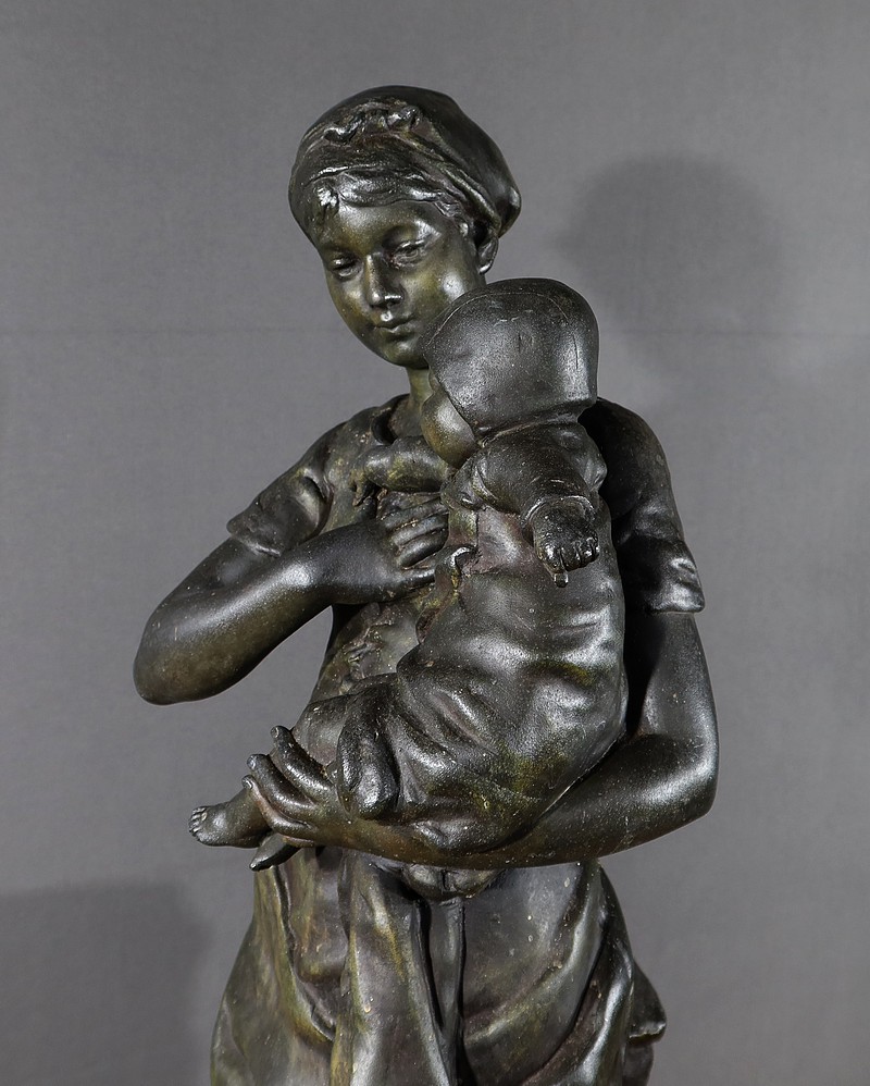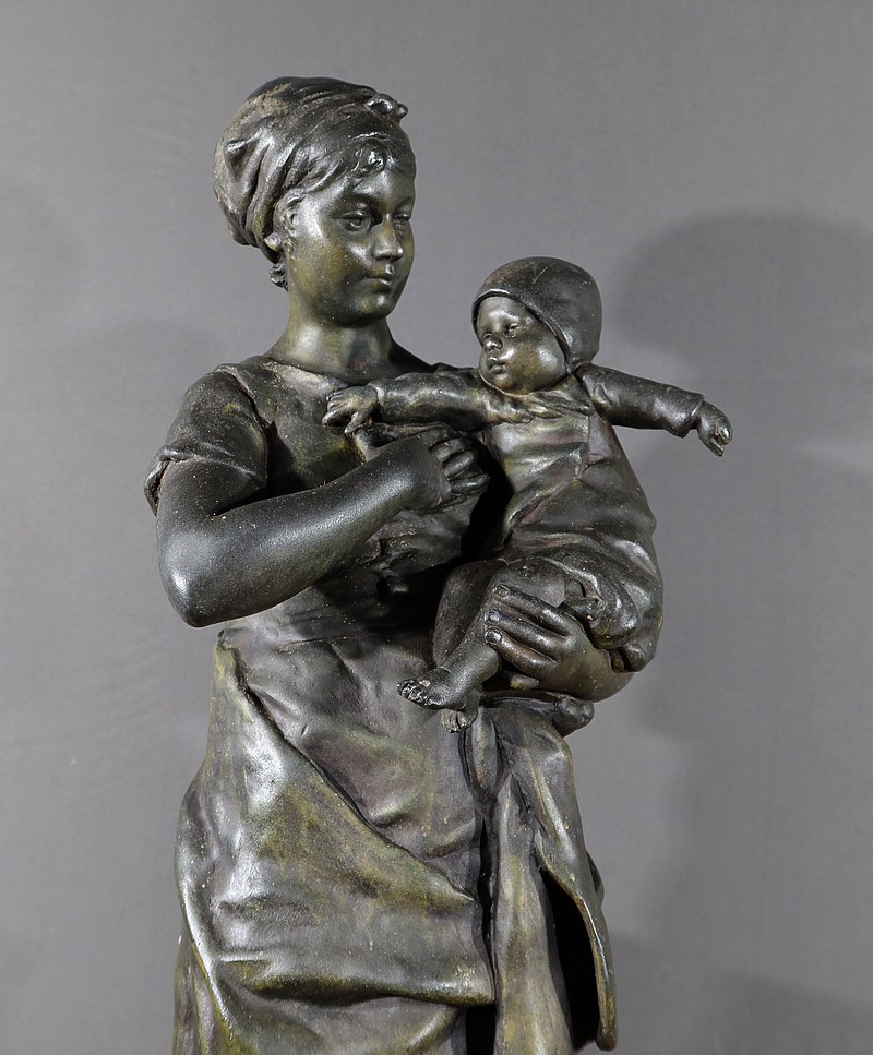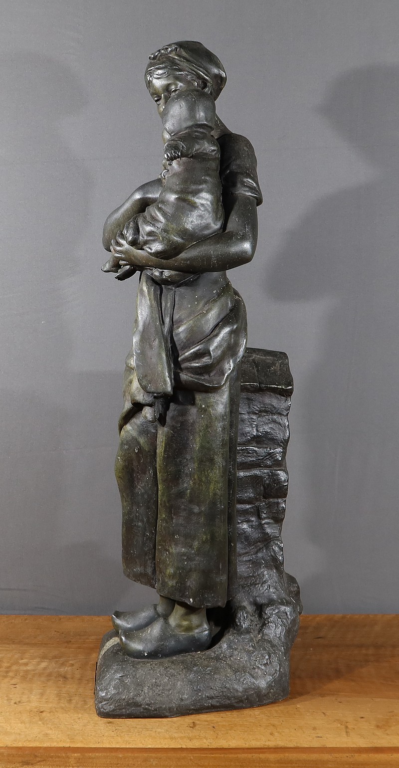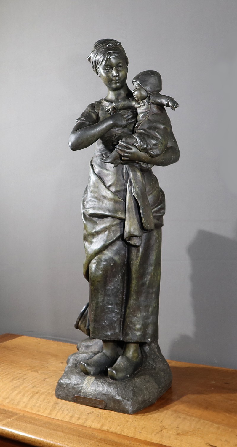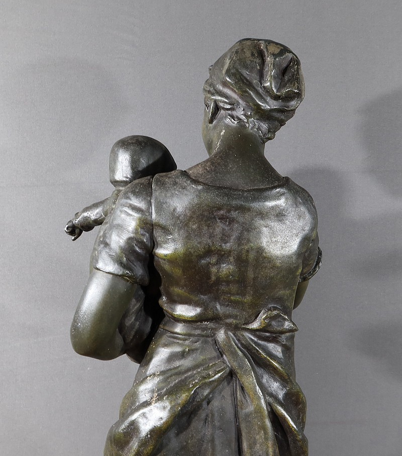 Important Régule à patine verte intitulé « Jeune Mère » par Clément Steiner représentant une jeune paysanne en sabots tenant son enfant dans ses bras, sa main posée sur le cœur. Elle tourne son visage bienveillant vers son bébé et esquisse un sourire. Derrière elle, une fontaine est représentée. A l’avant de la terrasse, une plaque est fixée et annotée » JEUNE MERE par L. STEINNER « .