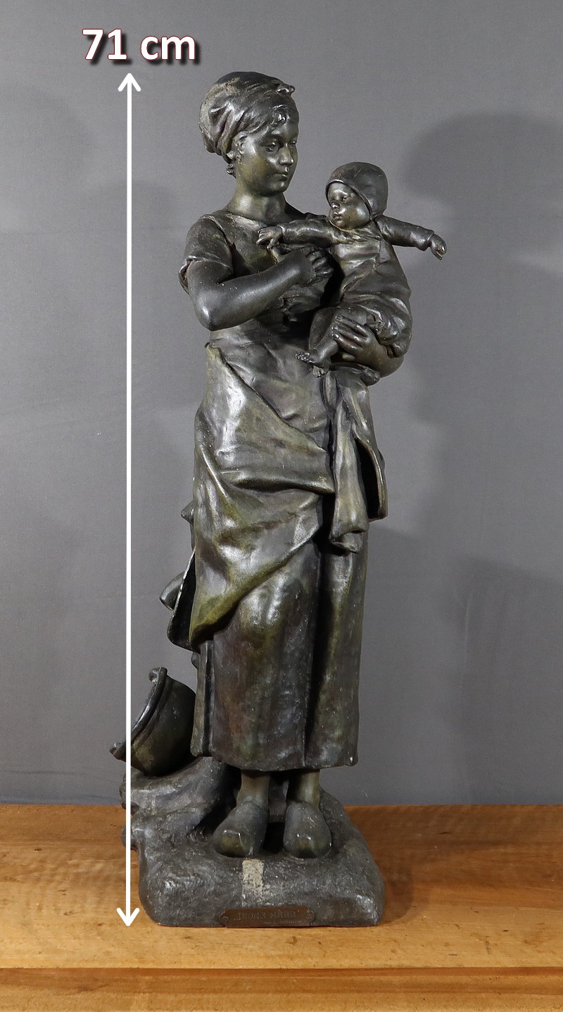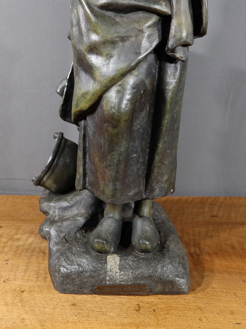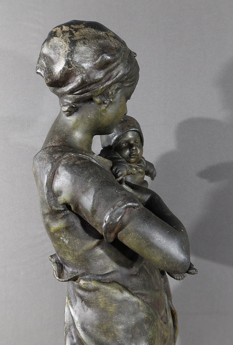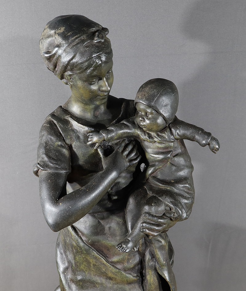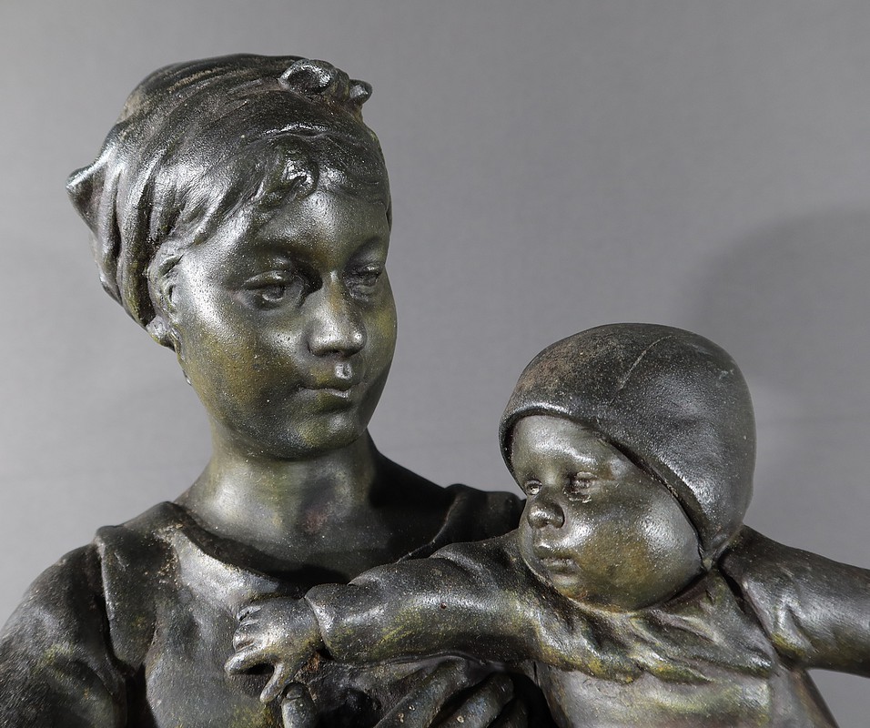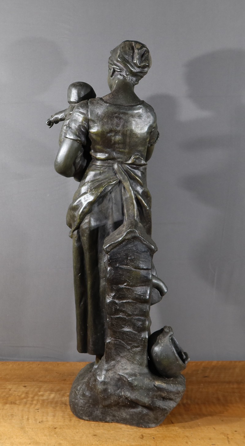 Important Régule à patine verte intitulé « Jeune Mère » par Clément Steiner représentant une jeune paysanne en sabots tenant son enfant dans ses bras, sa main posée sur le cœur. Elle tourne son visage bienveillant vers son bébé et esquisse un sourire. Derrière elle, une fontaine est représentée. A l’avant de la terrasse, une plaque est fixée et annotée » JEUNE MERE par L. STEINNER « .
