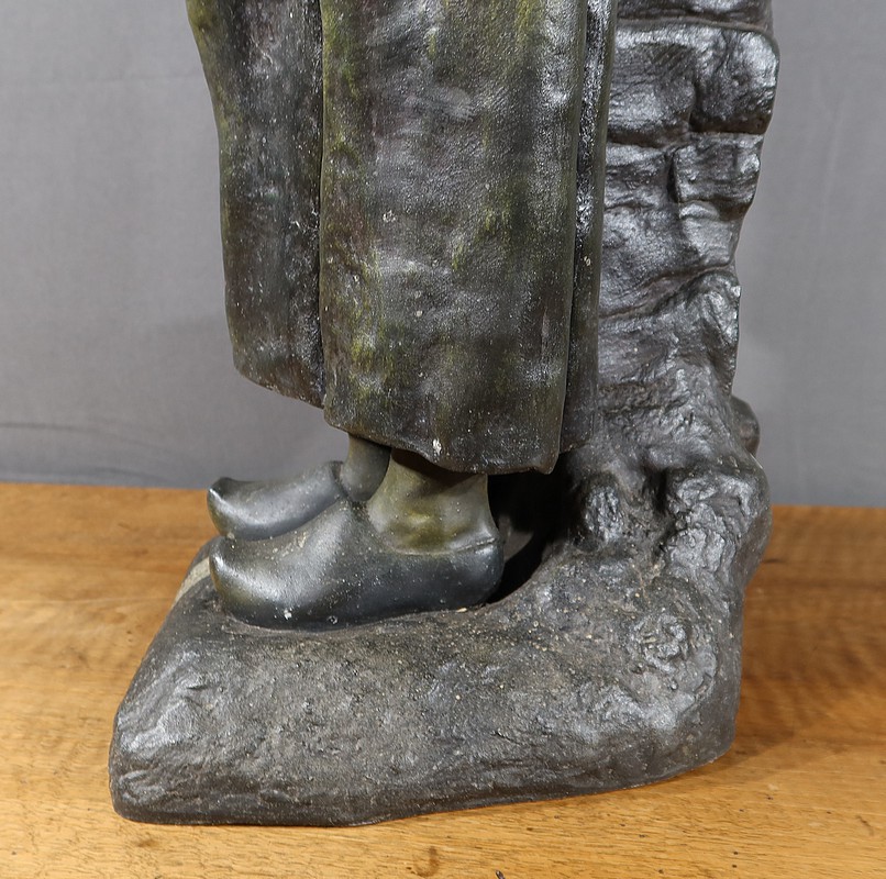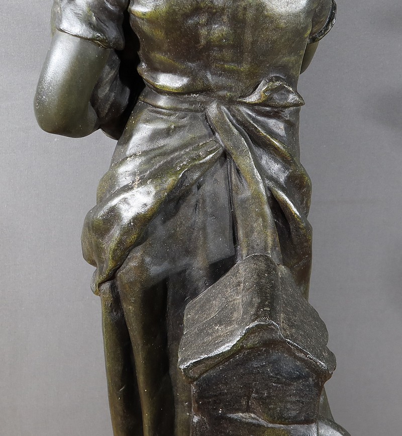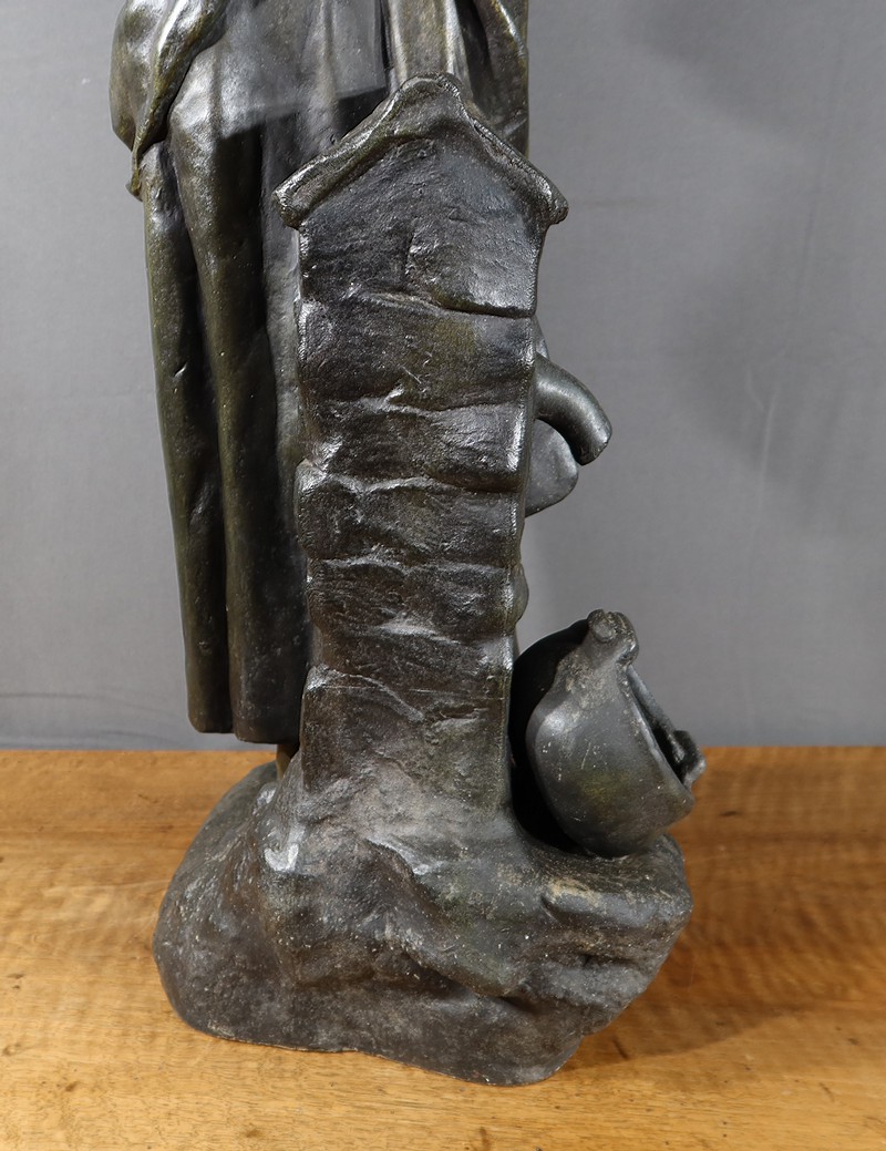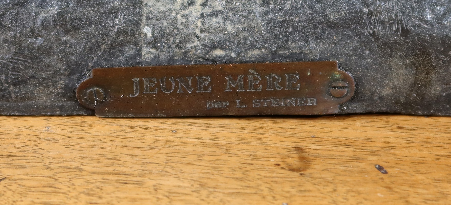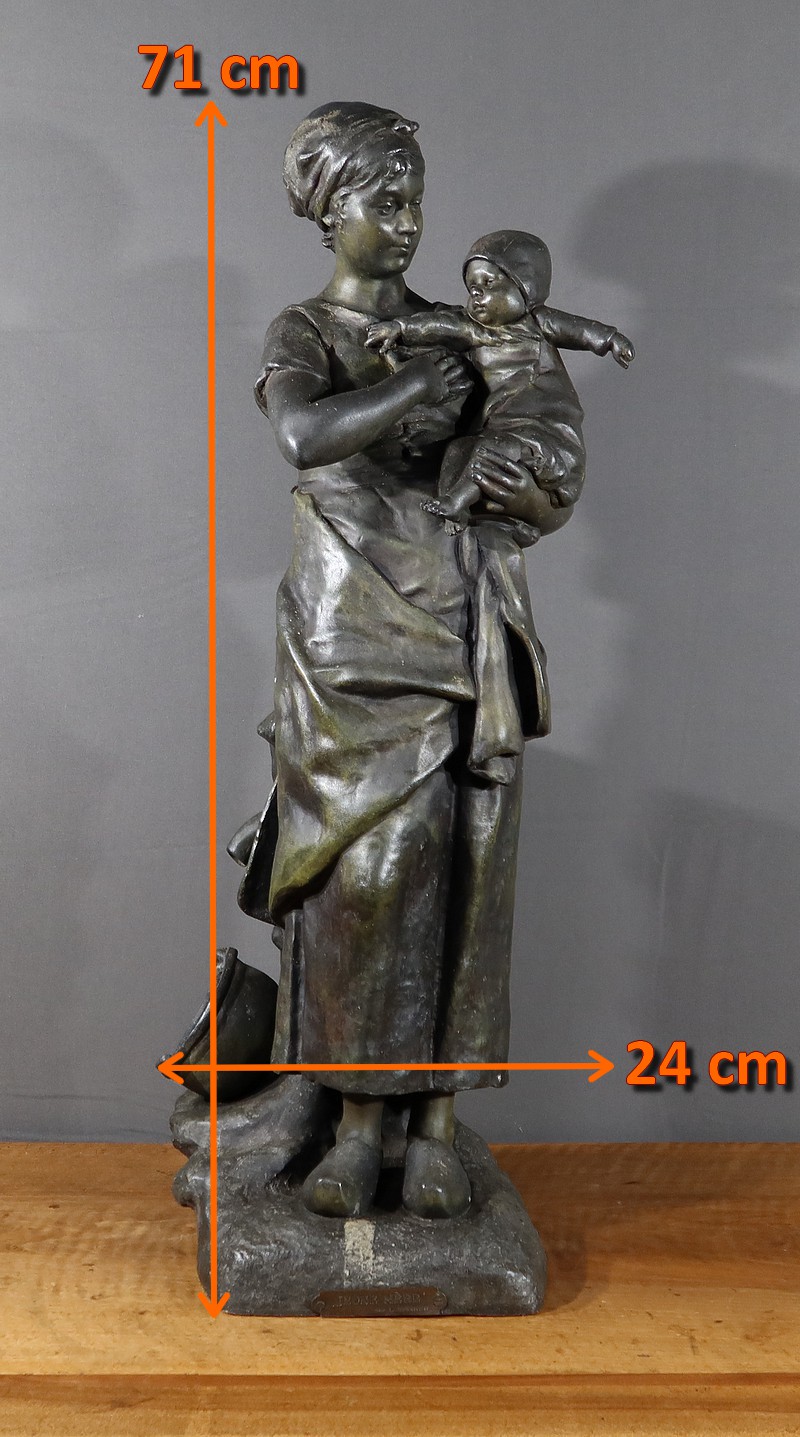 Important Régule à patine verte intitulé « Jeune Mère » par Clément Steiner représentant une jeune paysanne en sabots tenant son enfant dans ses bras, sa main posée sur le cœur. Elle tourne son visage bienveillant vers son bébé et esquisse un sourire. Derrière elle, une fontaine est représentée. A l’avant de la terrasse, une plaque est fixée et annotée » JEUNE MERE par L. STEINNER « .