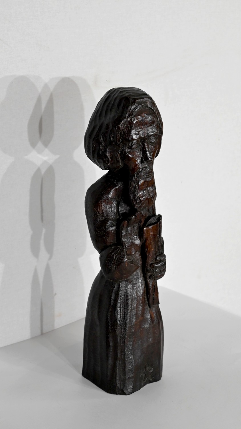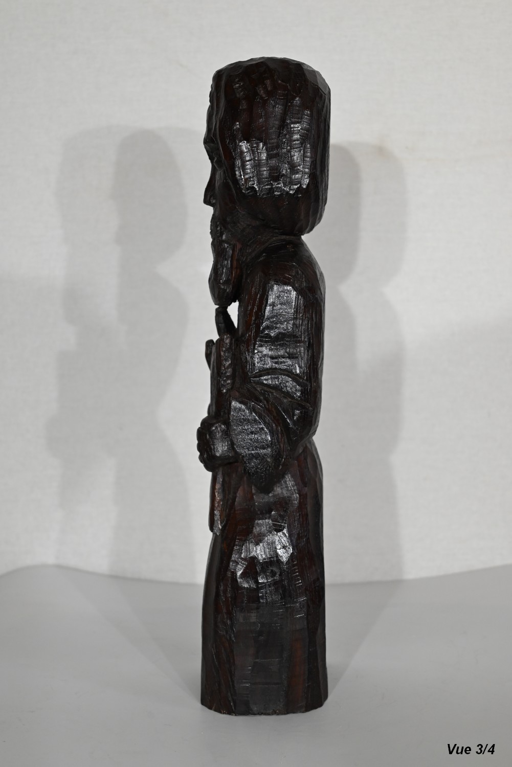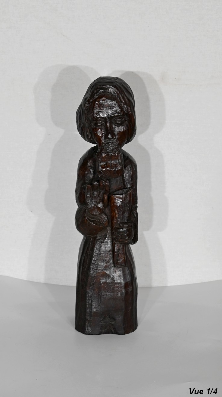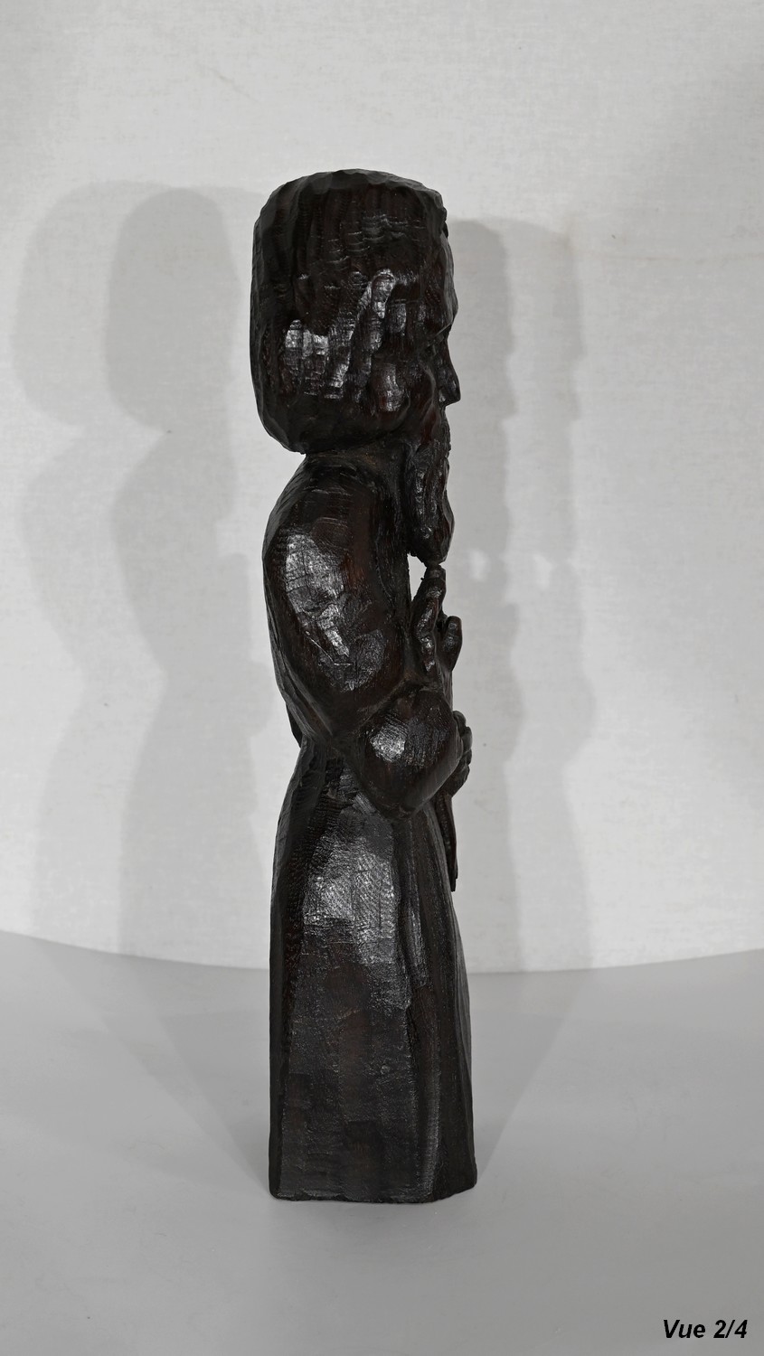 Statue en chêne représentant un homme religieux avec une chevelure mi-longue, le visage anguleux, portant une barbe et vêtu de son habit.