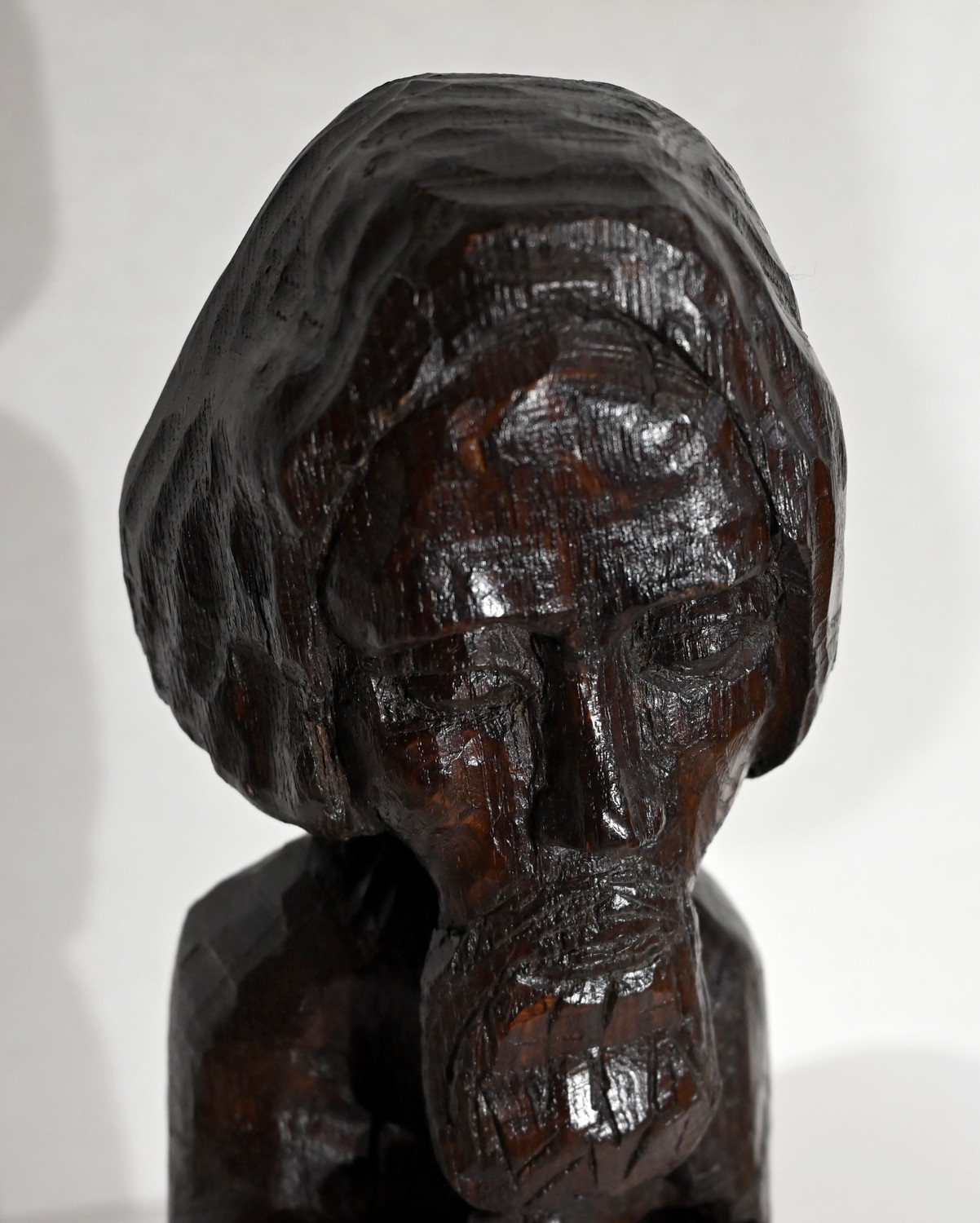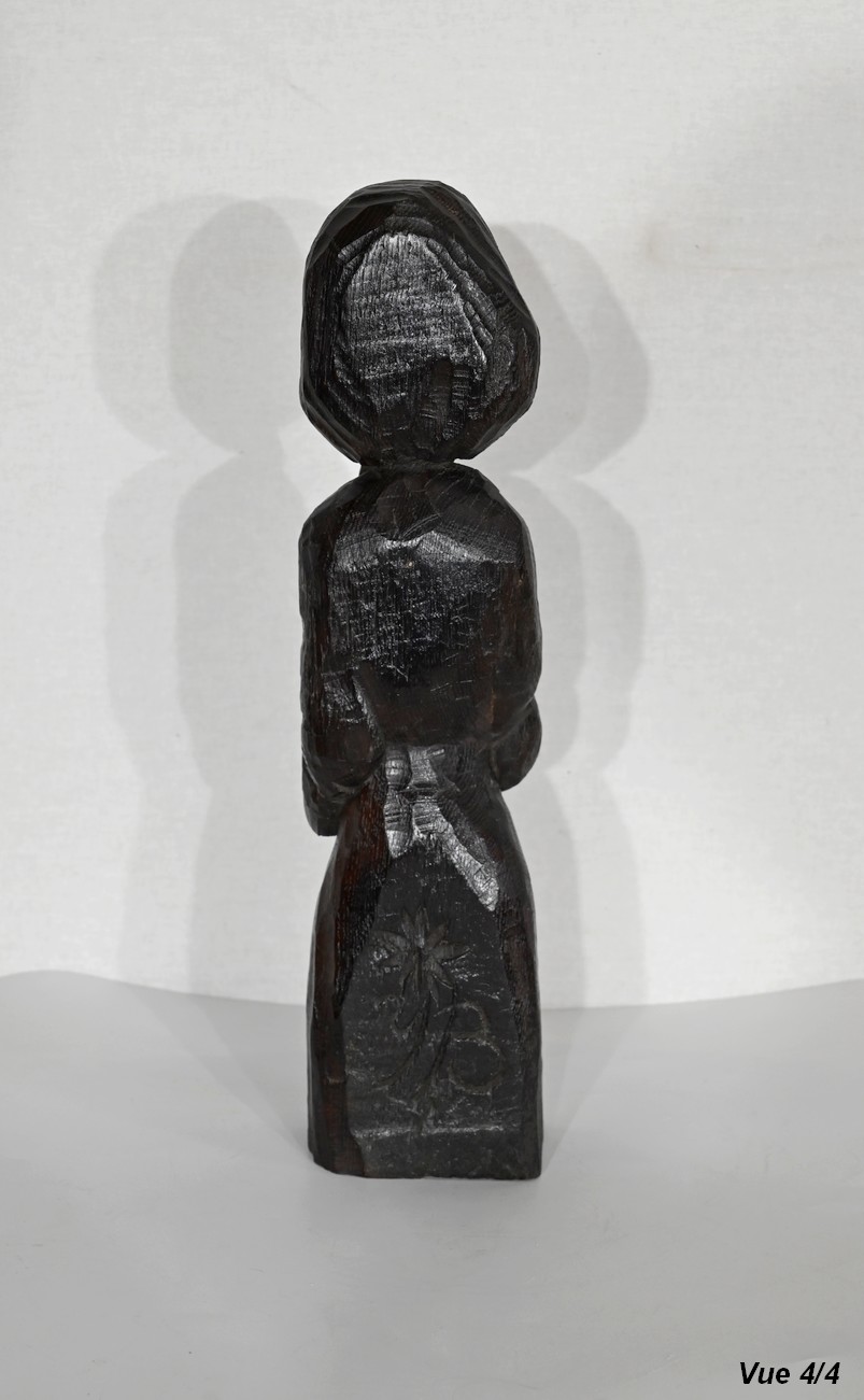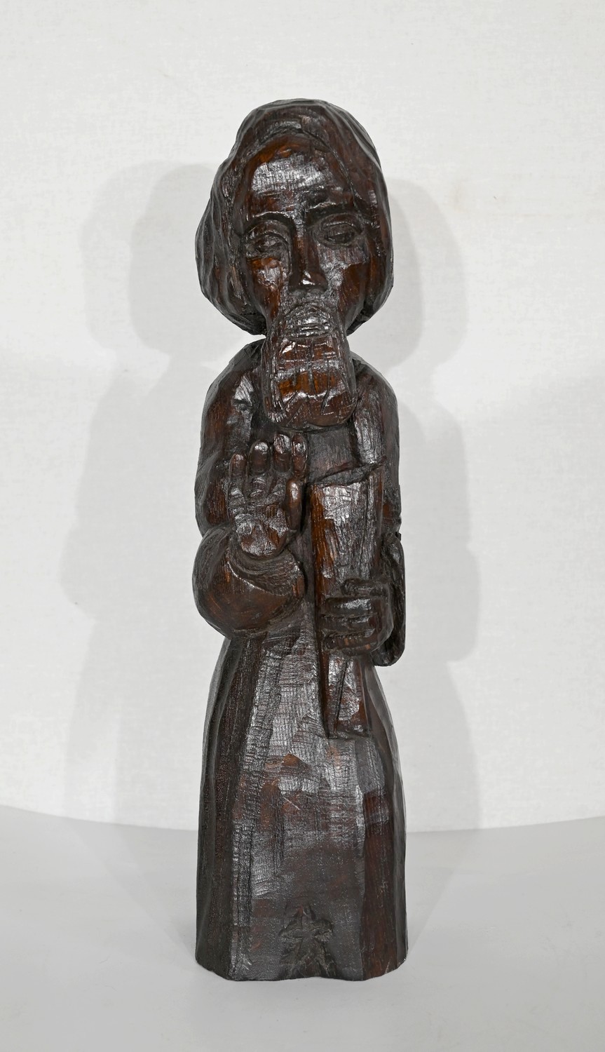 Statue en chêne représentant un homme religieux avec une chevelure mi-longue, le visage anguleux, portant une barbe et vêtu de son habit.
