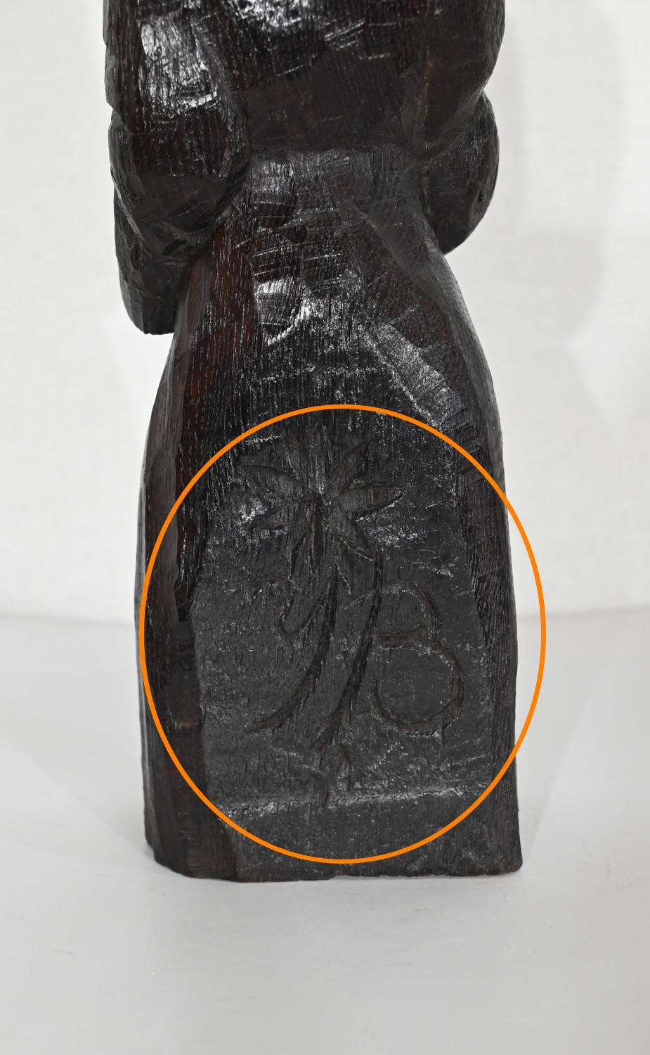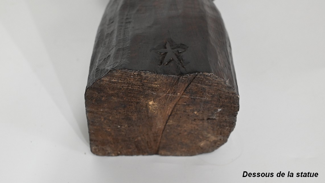 Un travail de bois sculpté, brut, signé Y. B accompagné d’une fleur dans le dos.