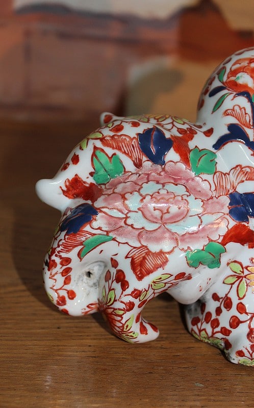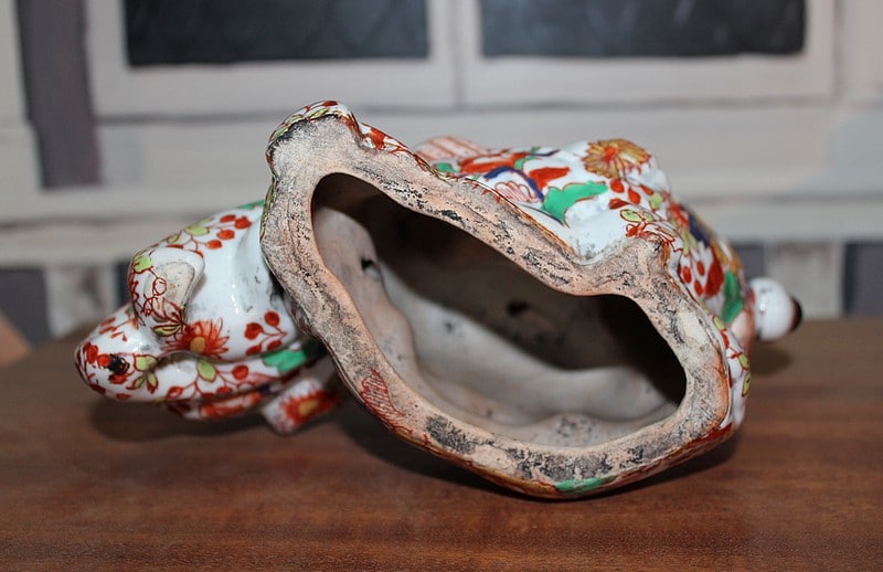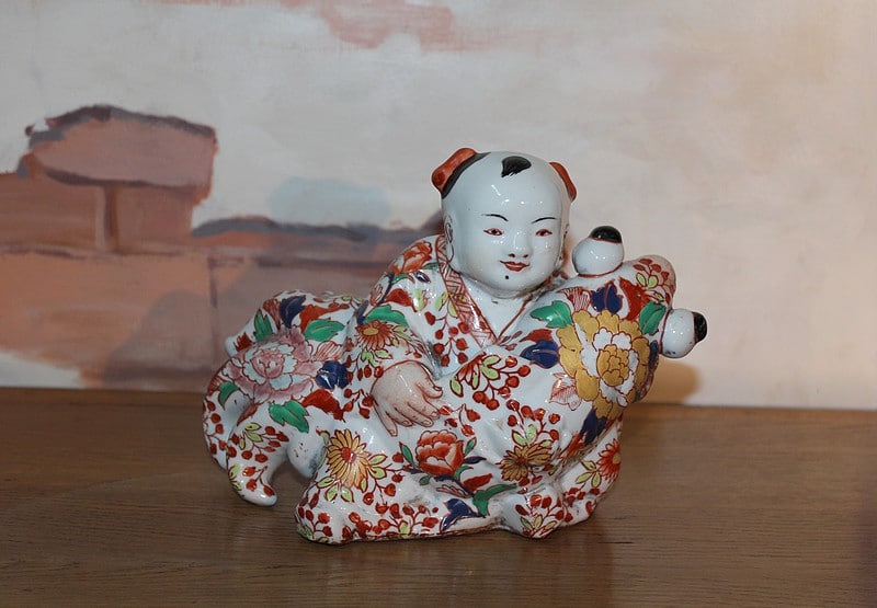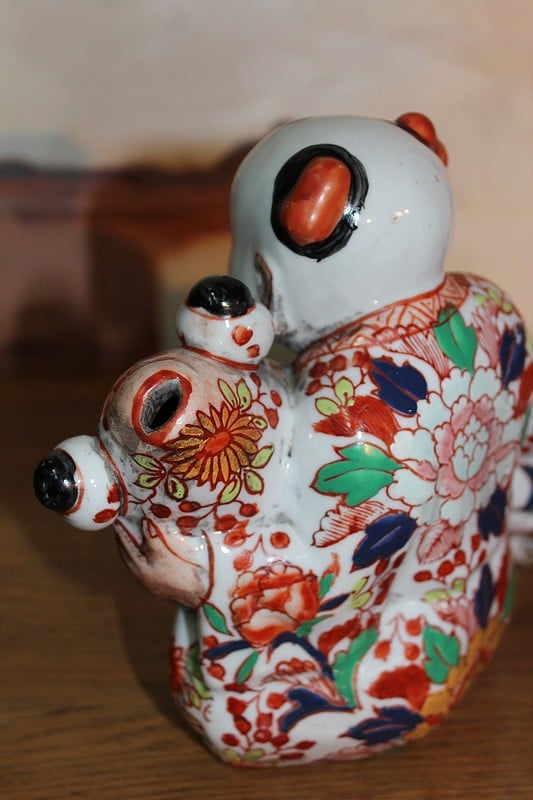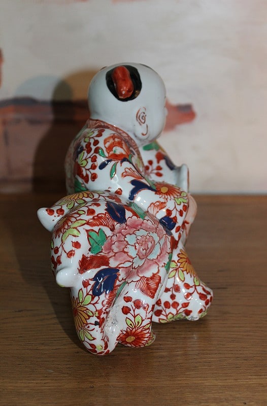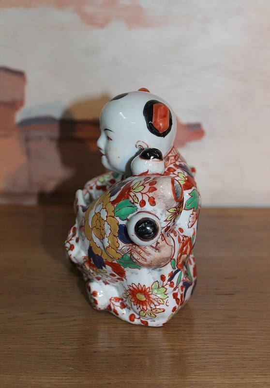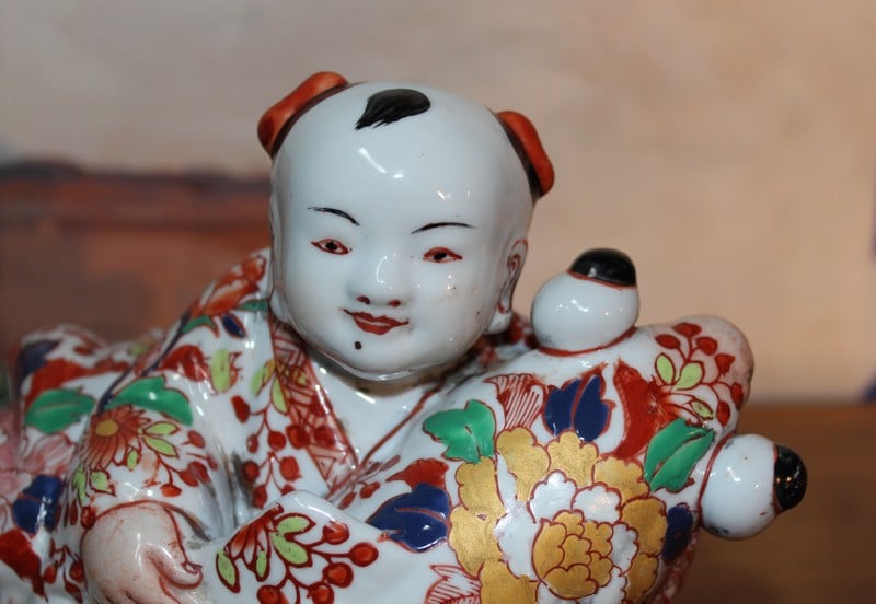 Sujet en porcelaine du Japon à décor Imari, représentant une carpe géante dans les bras d’un pêcheur.