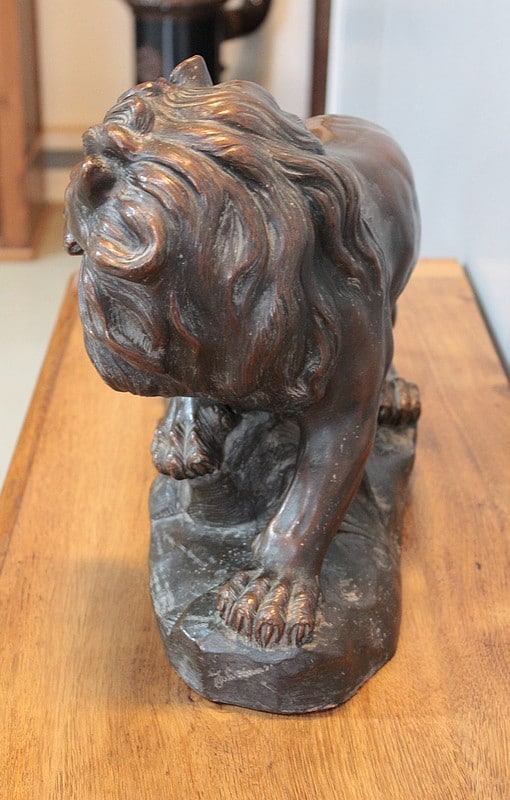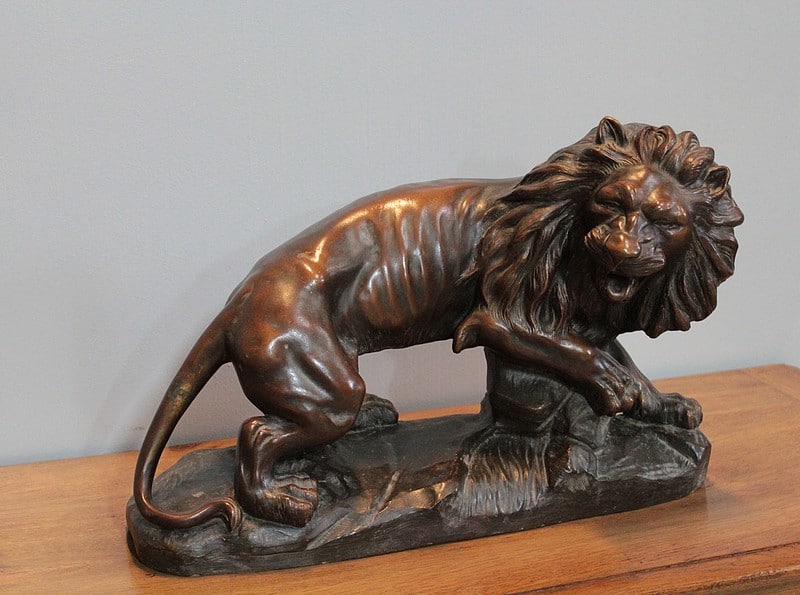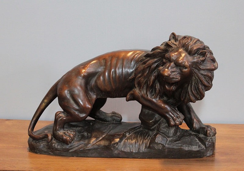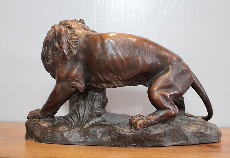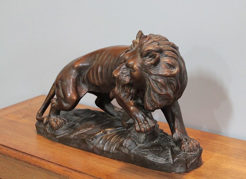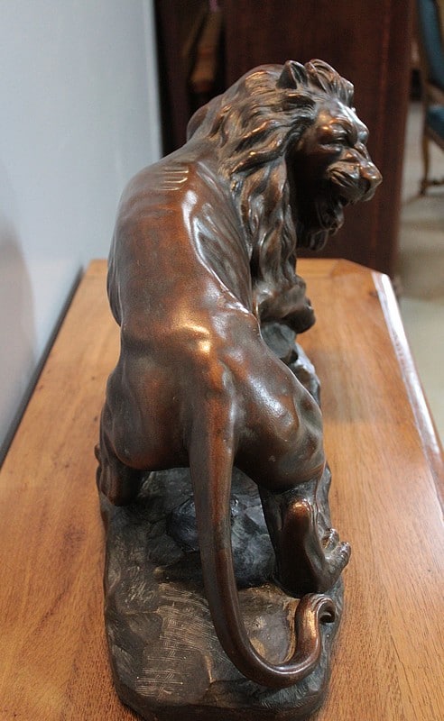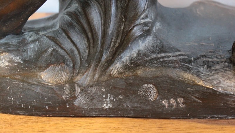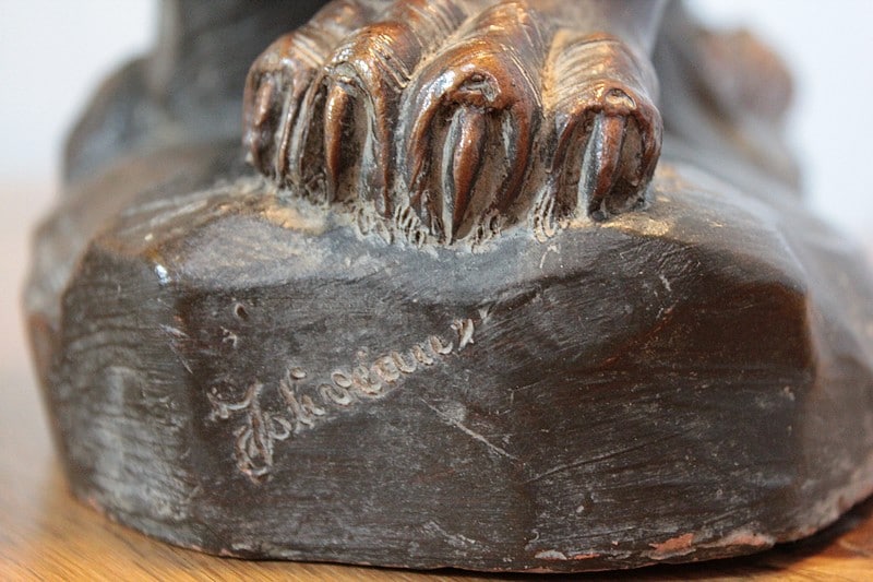 Terre cuite patinée représentant un Lion sur rocher , elle est signée ‘JOLIVEAUX ‘. Un cachet, en creux est marqué ‘ FD F…… & DURIEUX PARIS’ et elle est numérotée 998.