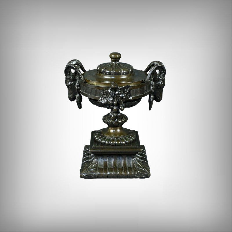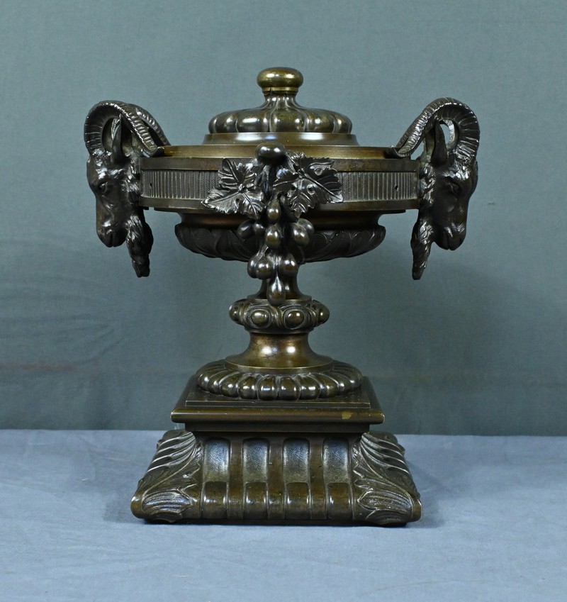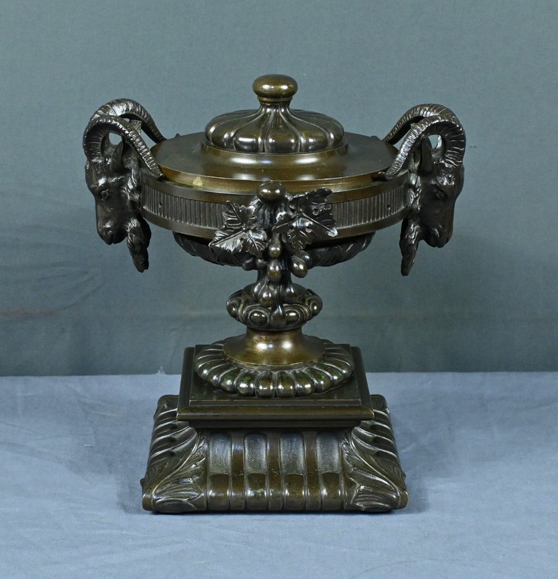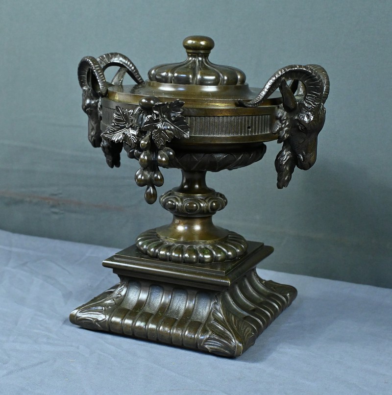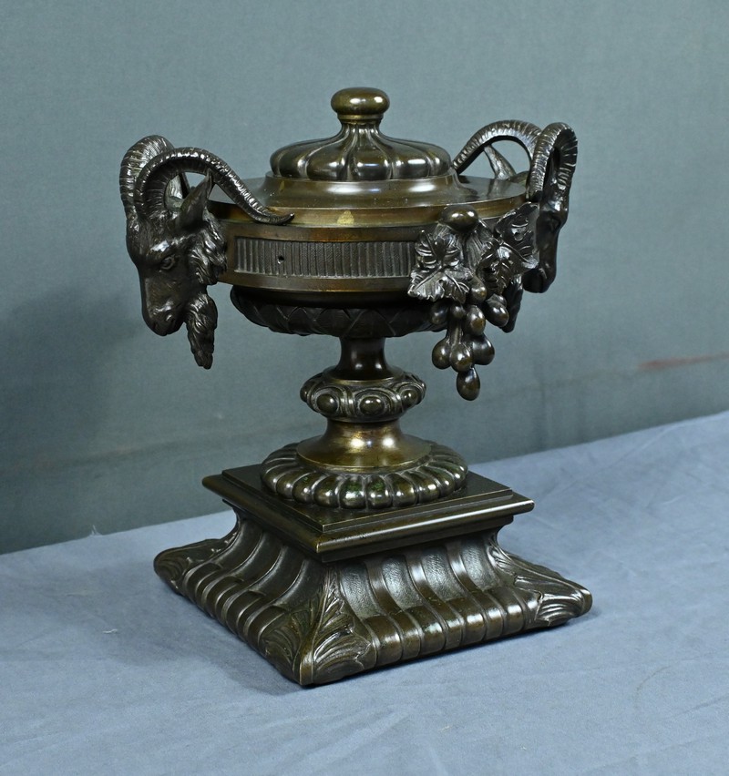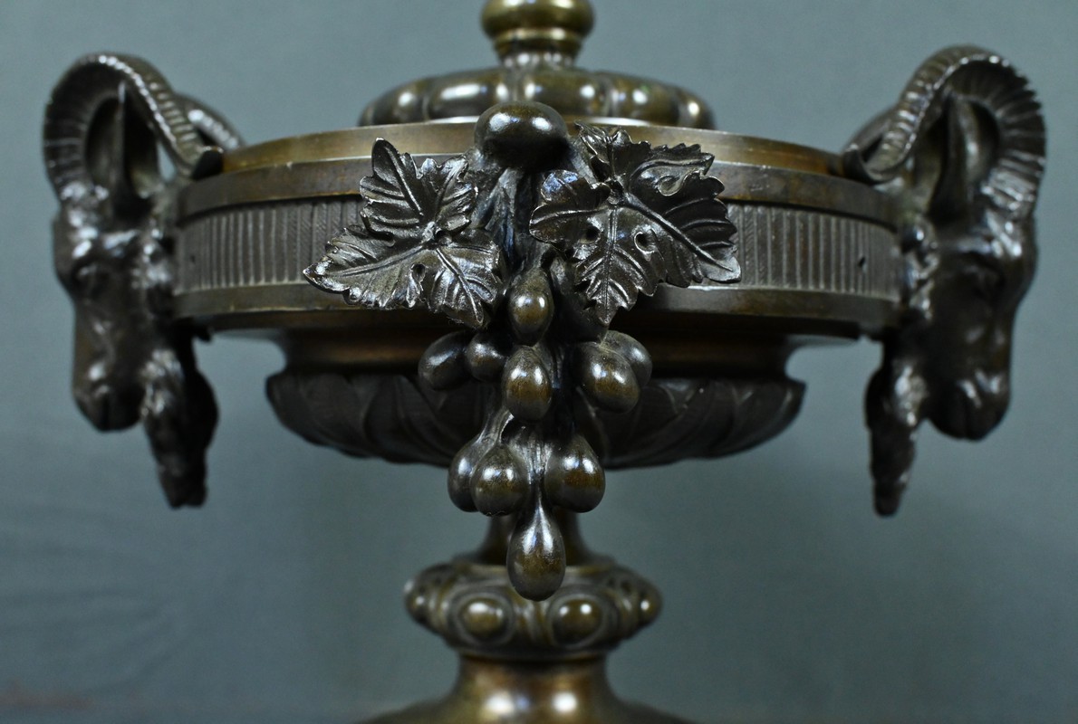 Belle coupe en bronze reposant sur un piédestal godronné orné de motifs végétaux. Son corps est richement décoré de feuillages et de fleurs finement ciselés. De chaque côté, deux têtes de bélier se détachent rappelant l’esthétique de l’Antiquité et renforçant son caractère majestueux. Chaque face est décorée d’une grappe de raisins et de feuilles de vignes. L’urne est fermée par un couvercle surmonté d’un petit pommeau. Dans l’ensemble, elle évoque un style Renaissance revisité sous le second Empire et semble avoir été conçue autant pour orner un intérieur raffiné que pour témoigner d’un goût pour l’art ancien.