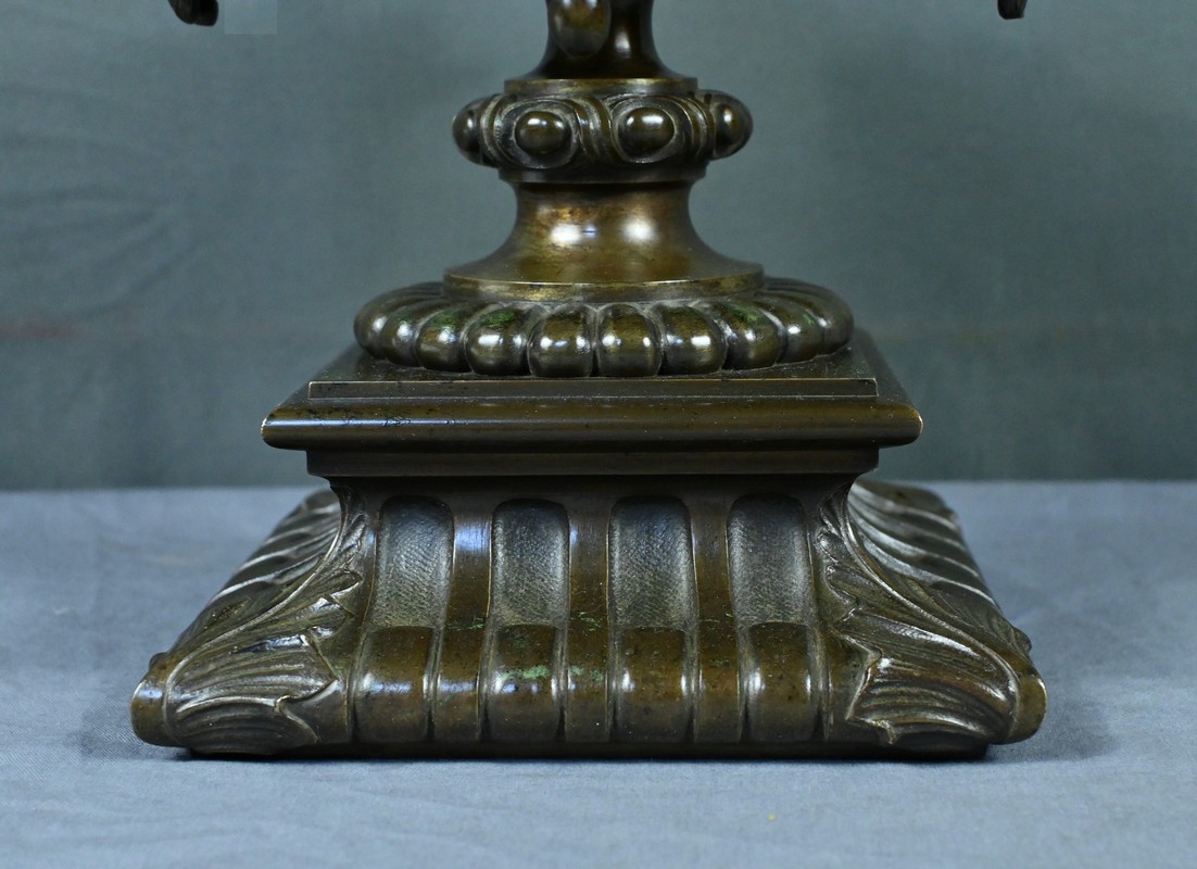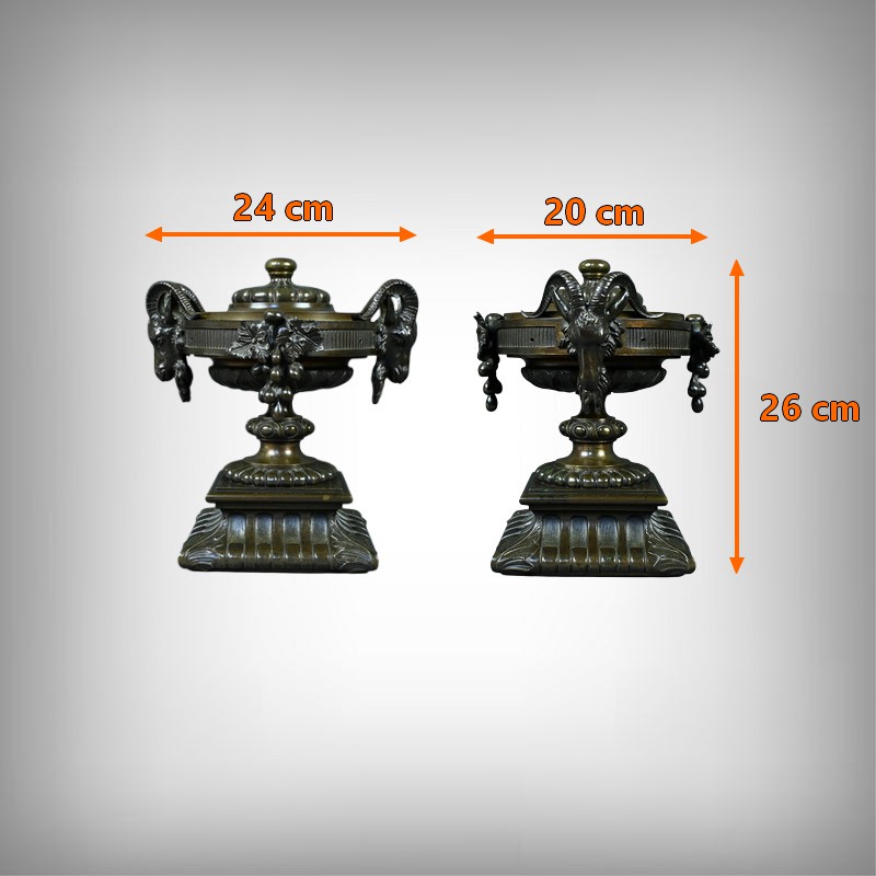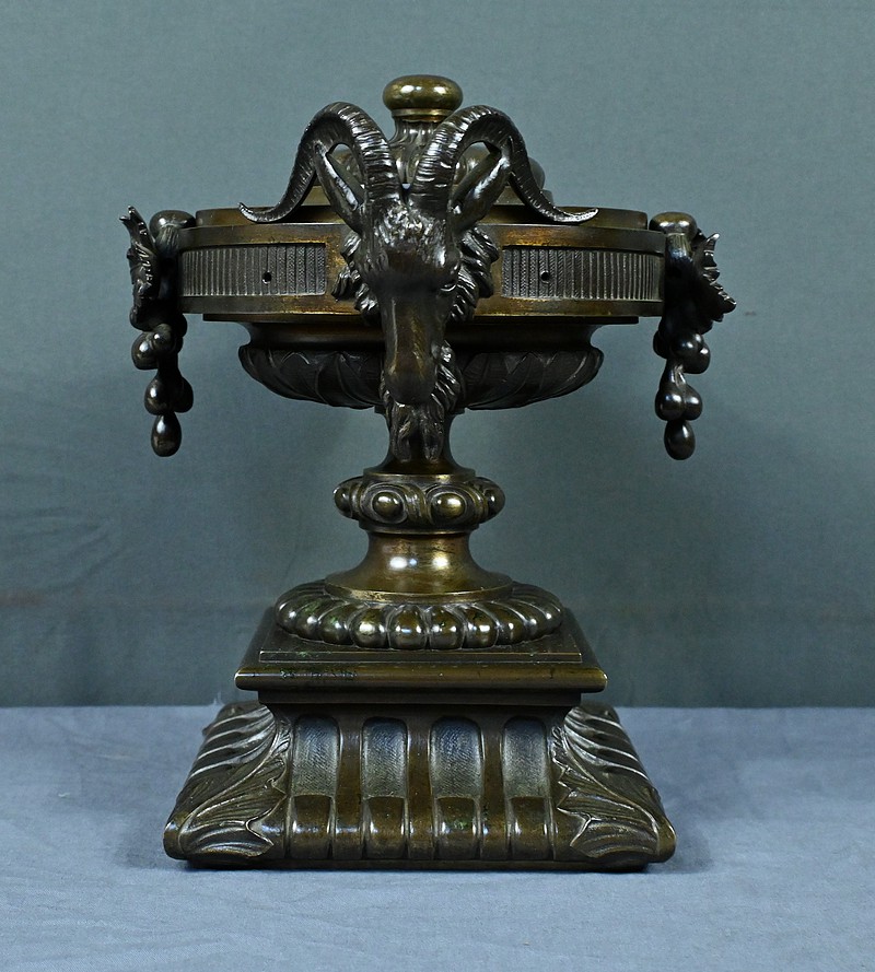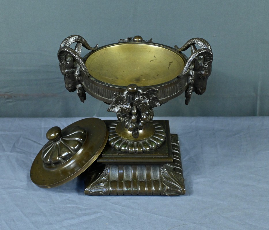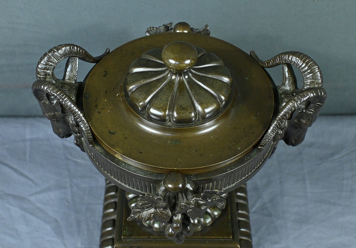 Belle coupe en bronze reposant sur un piédestal godronné orné de motifs végétaux. Son corps est richement décoré de feuillages et de fleurs finement ciselés. De chaque côté, deux têtes de bélier se détachent rappelant l’esthétique de l’Antiquité et renforçant son caractère majestueux. Chaque face est décorée d’une grappe de raisins et de feuilles de vignes. L’urne est fermée par un couvercle surmonté d’un petit pommeau. Dans l’ensemble, elle évoque un style Renaissance revisité sous le second Empire et semble avoir été conçue autant pour orner un intérieur raffiné que pour témoigner d’un goût pour l’art ancien.
