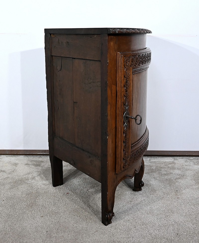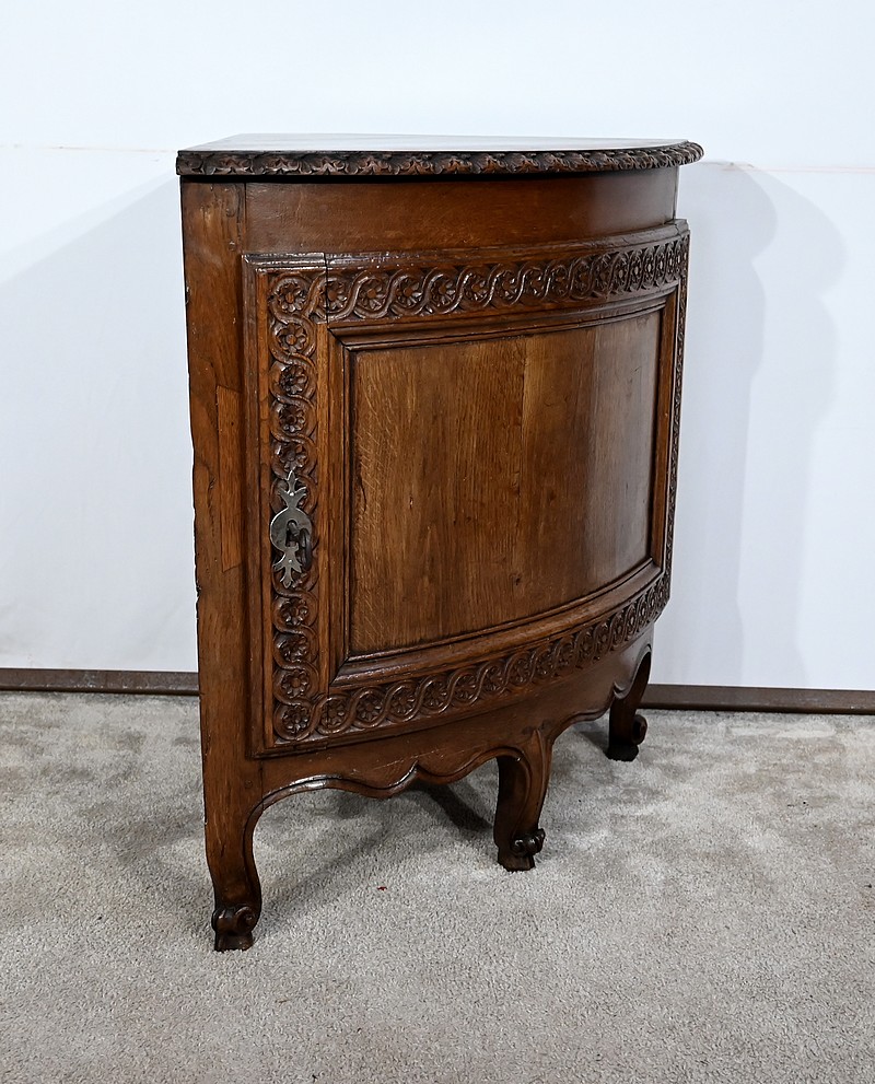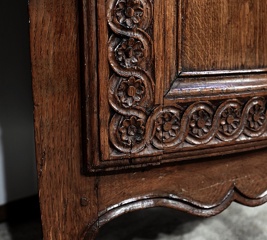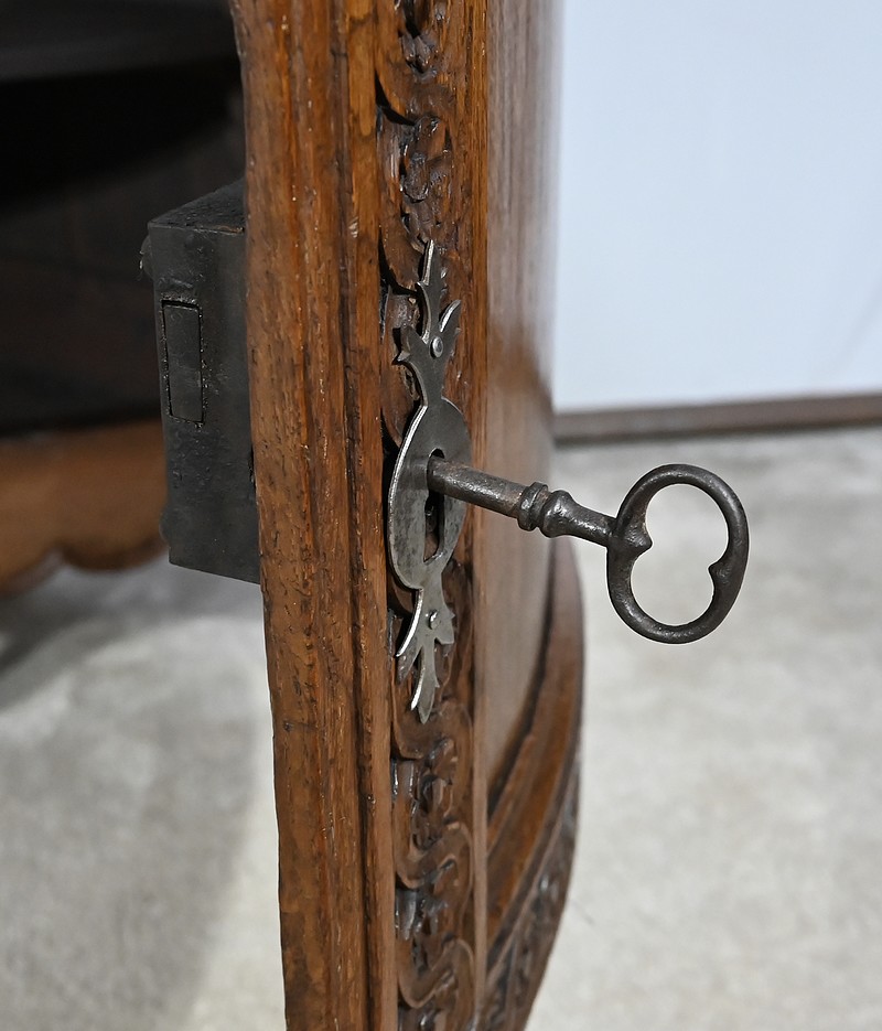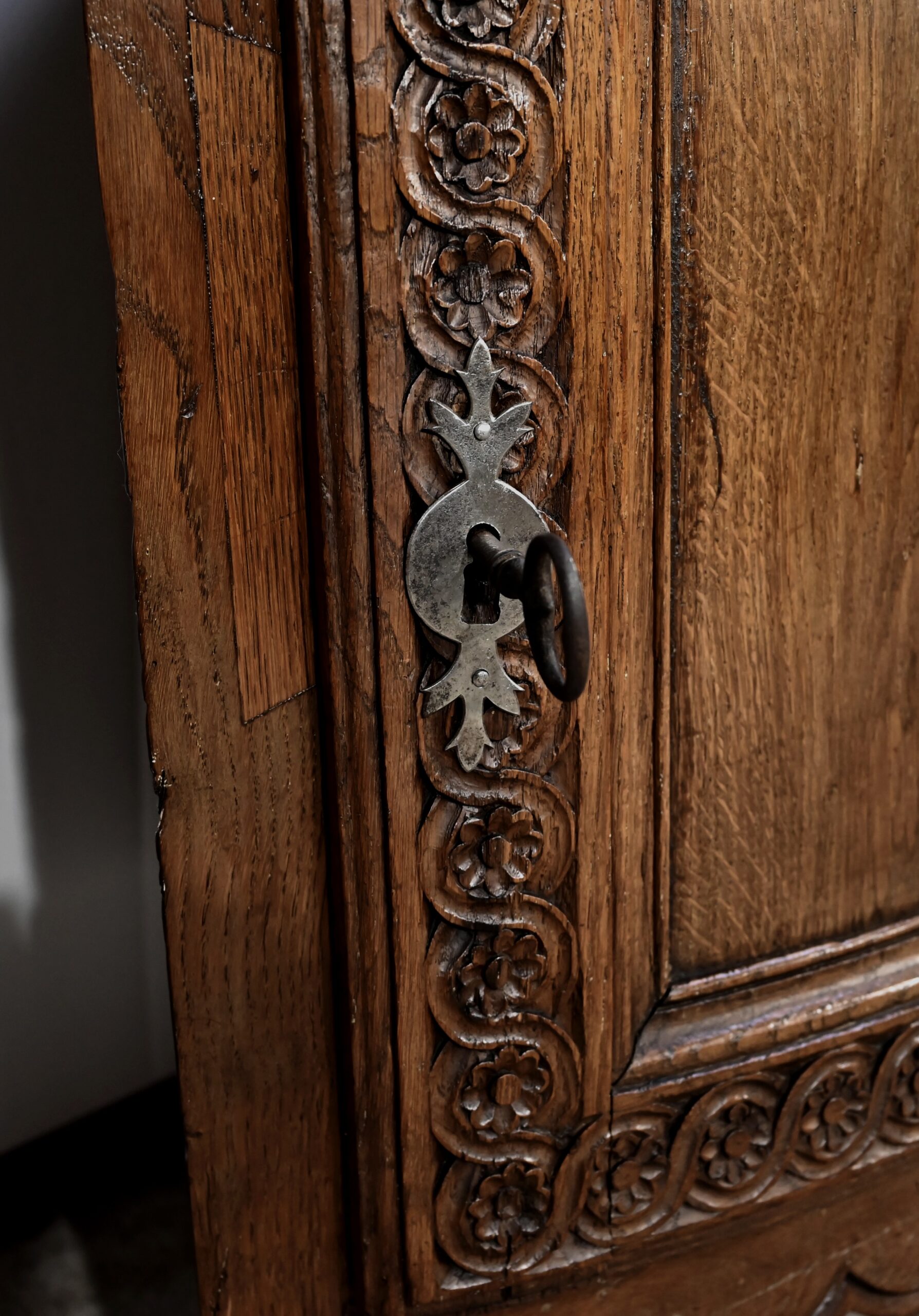 Ce meuble à la façade arrondie comporte une porte à encadrement dont l’intérieur est mouluré et dont la façade est sculpté d’un enroulement de fleurs à volutes. Cette porte est foncée d’un panneau et son pourtour est en applique. Elle est posée à droite sur des gonds en fer d’origine et possède une serrure d’origine également avec sa clé et son entrée en fer.
