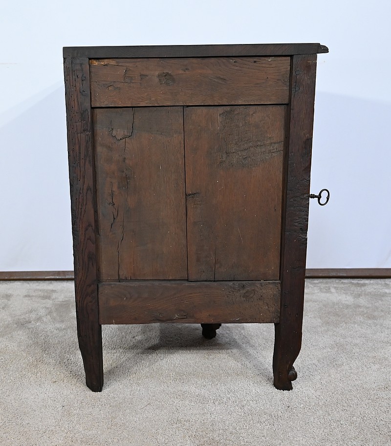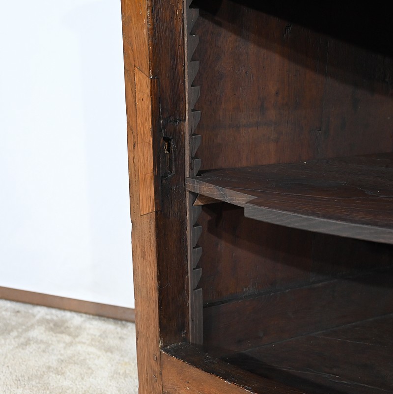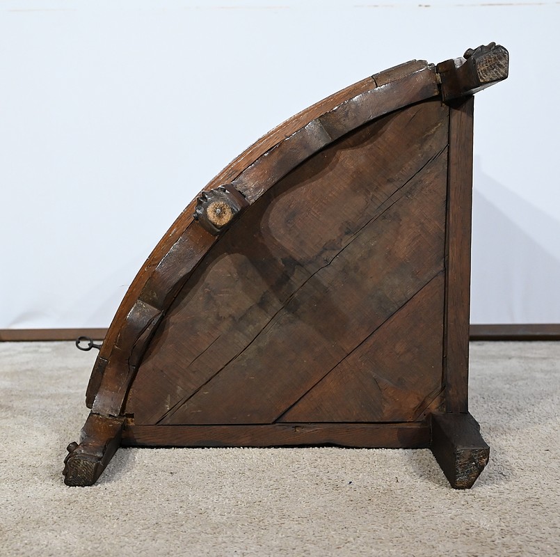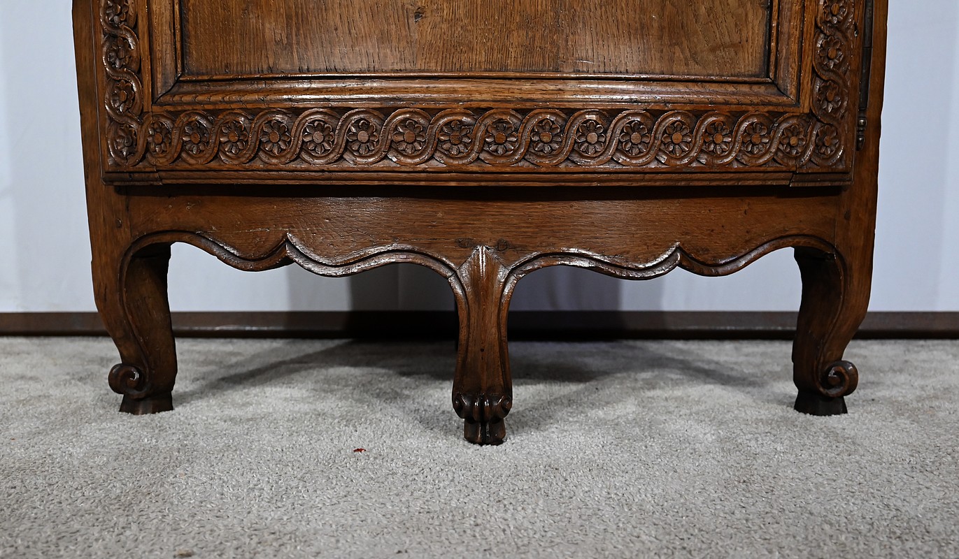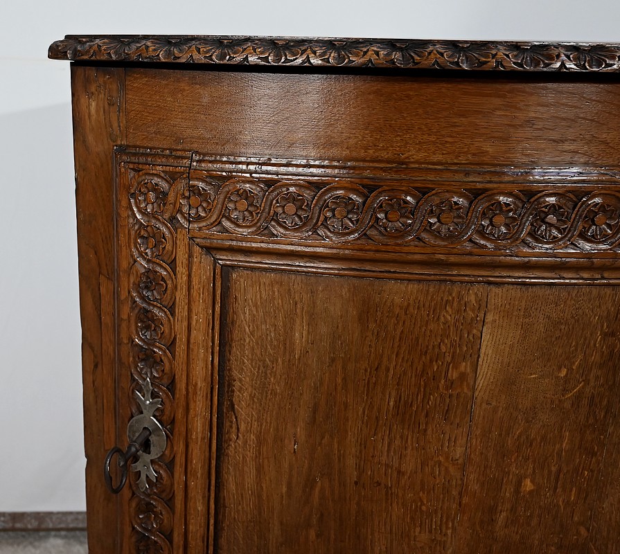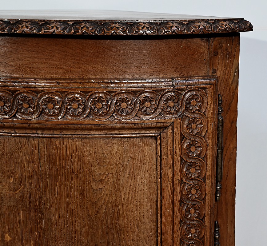 Ce meuble à la façade arrondie comporte une porte à encadrement dont l’intérieur est mouluré et dont la façade est sculpté d’un enroulement de fleurs à volutes. Cette porte est foncée d’un panneau et son pourtour est en applique. Elle est posée à droite sur des gonds en fer d’origine et possède une serrure d’origine également avec sa clé et son entrée en fer.
