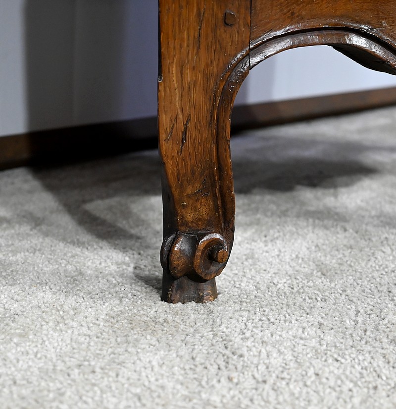 La partie basse de ce petit meuble comporte une traverse à mouvement avec moulure et deux pieds escargot aux extrémités accompagnés d’un pied central.