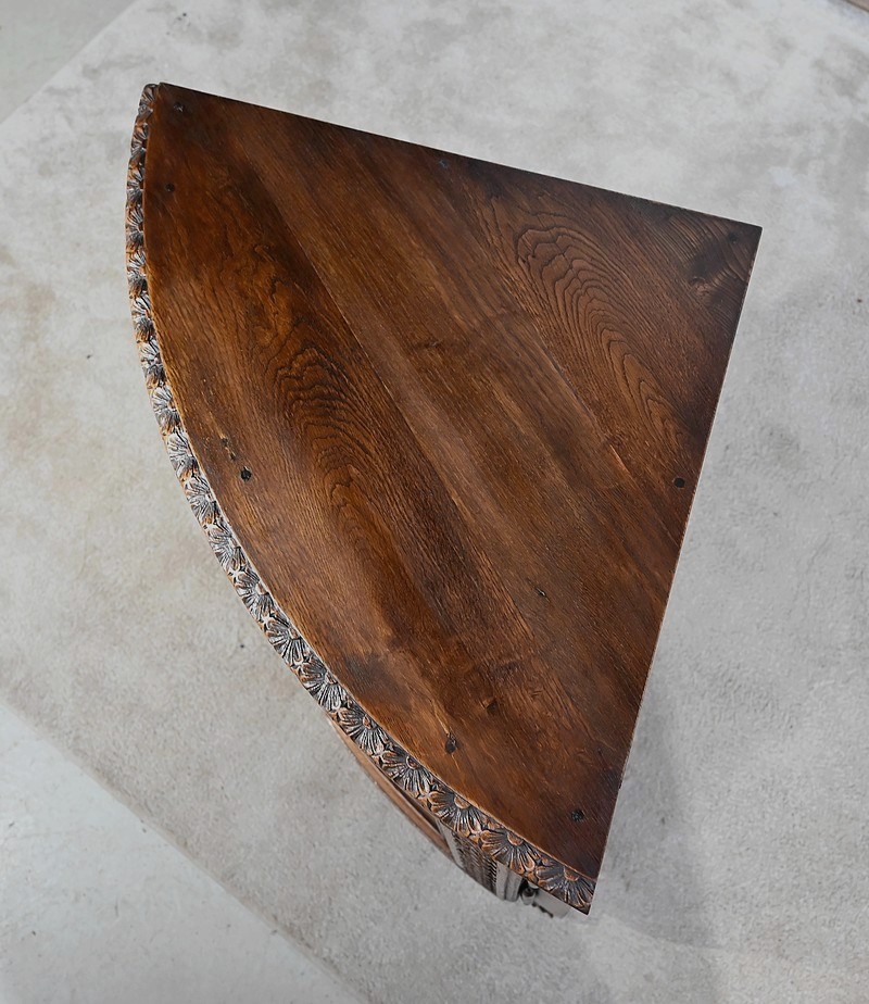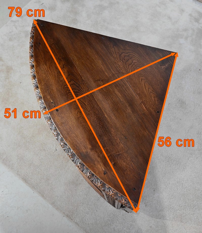 Le dessus de cette encoignure possède une bordure festonnée sculptée de fleurs stylisées.