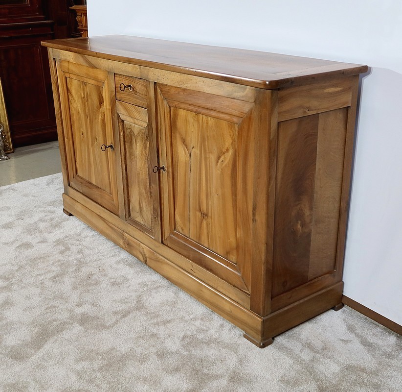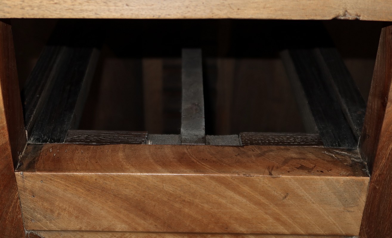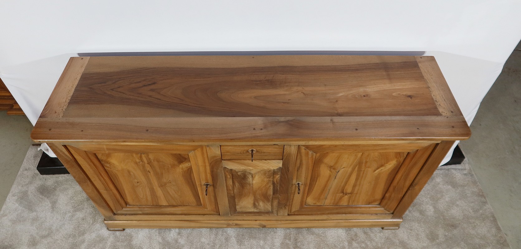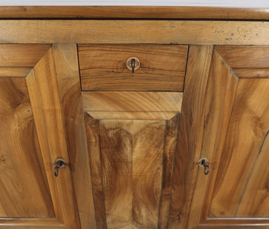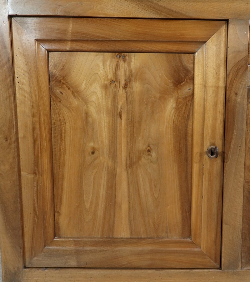 Belle enfilade en noyer massif, de faible profondeur, composée en façade de deux larges portes à encadrement à coupe d’onglet avec mouluration intérieure, foncées de panneaux disposés en livre ouvert, apportant symétrie et harmonie. Ses portes sont agrémentées de clés et serrures d’origine en état de fonctionnement, accompagnées d’entrées bois. Elles ouvrent sur un espace de rangement avec étagères réglables sur crémaillères. Au milieu de ce meuble, un tiroir en partie haute est également muni d’une serrure d’origine avec entrée bois. En dessous, un pilastre est composé de noyer au veinage subtil, disposé en livre ouvert.