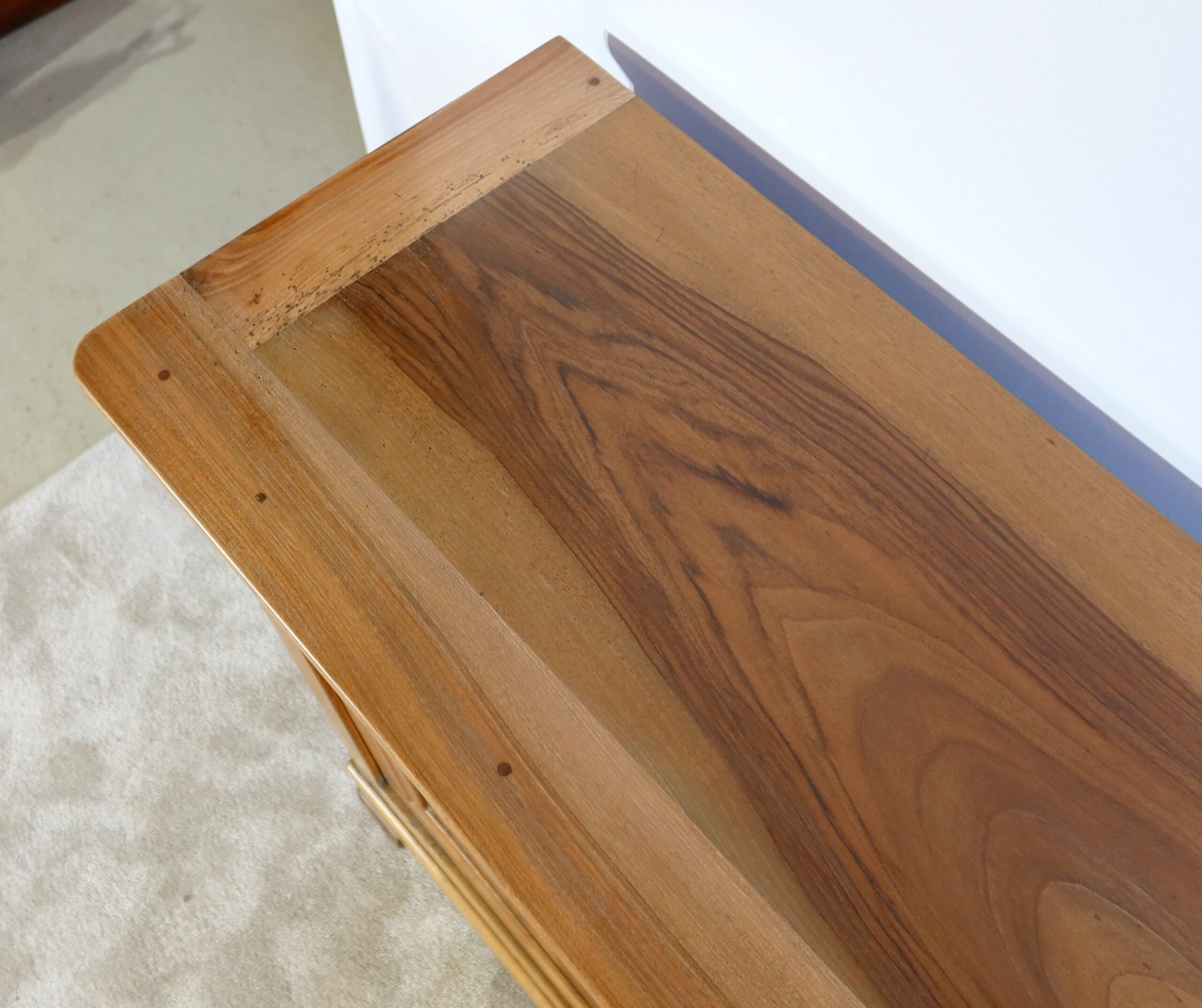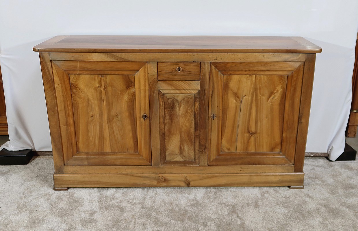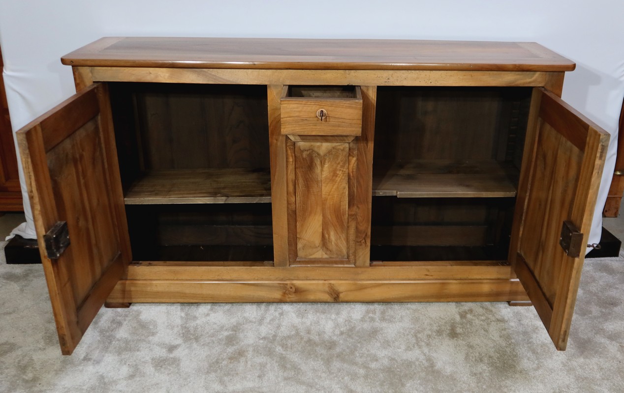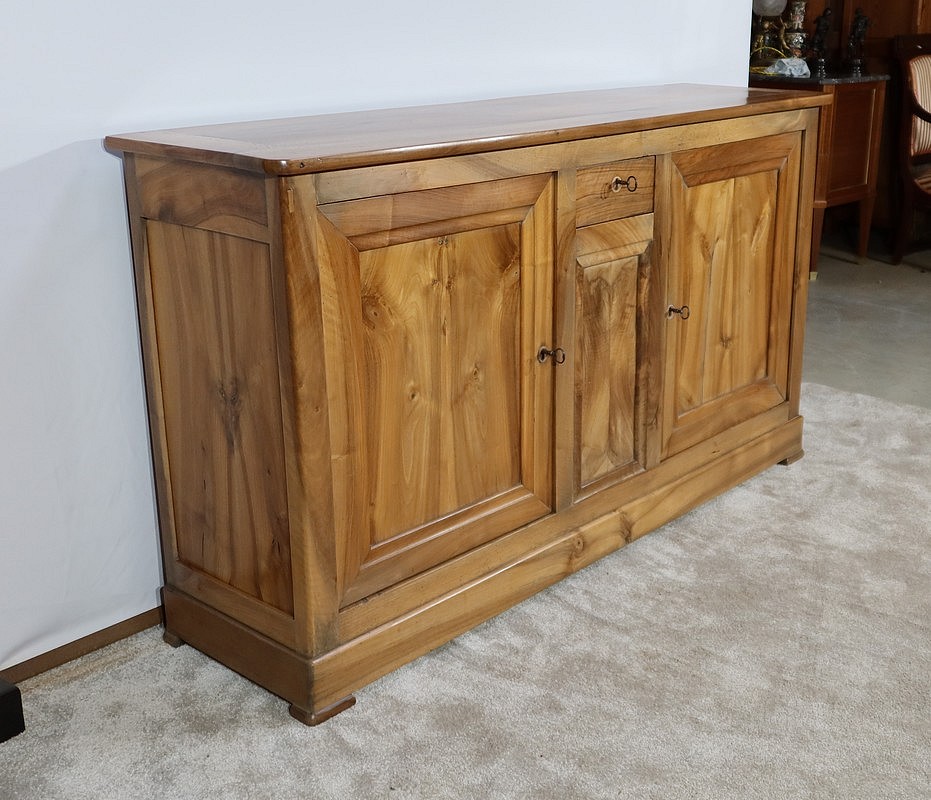 Belle enfilade en noyer massif, de faible profondeur, composée en façade de deux larges portes à encadrement à coupe d’onglet avec mouluration intérieure, foncées de panneaux disposés en livre ouvert, apportant symétrie et harmonie. Ses portes sont agrémentées de clés et serrures d’origine en état de fonctionnement, accompagnées d’entrées bois. Elles ouvrent sur un espace de rangement avec étagères réglables sur crémaillères. Au milieu de ce meuble, un tiroir en partie haute est également muni d’une serrure d’origine avec entrée bois. En dessous, un pilastre est composé de noyer au veinage subtil, disposé en livre ouvert.
