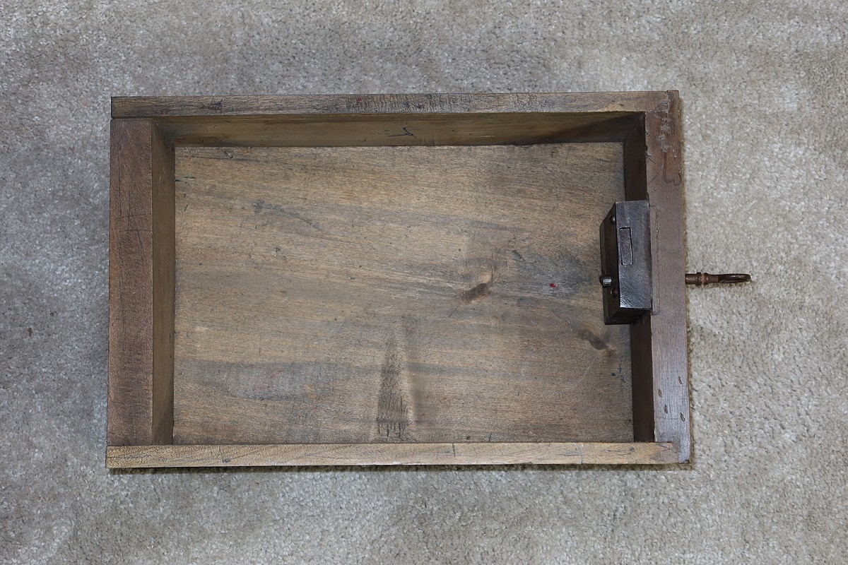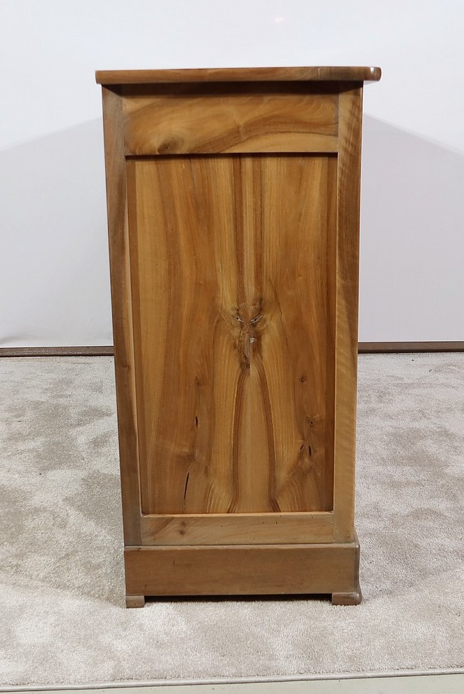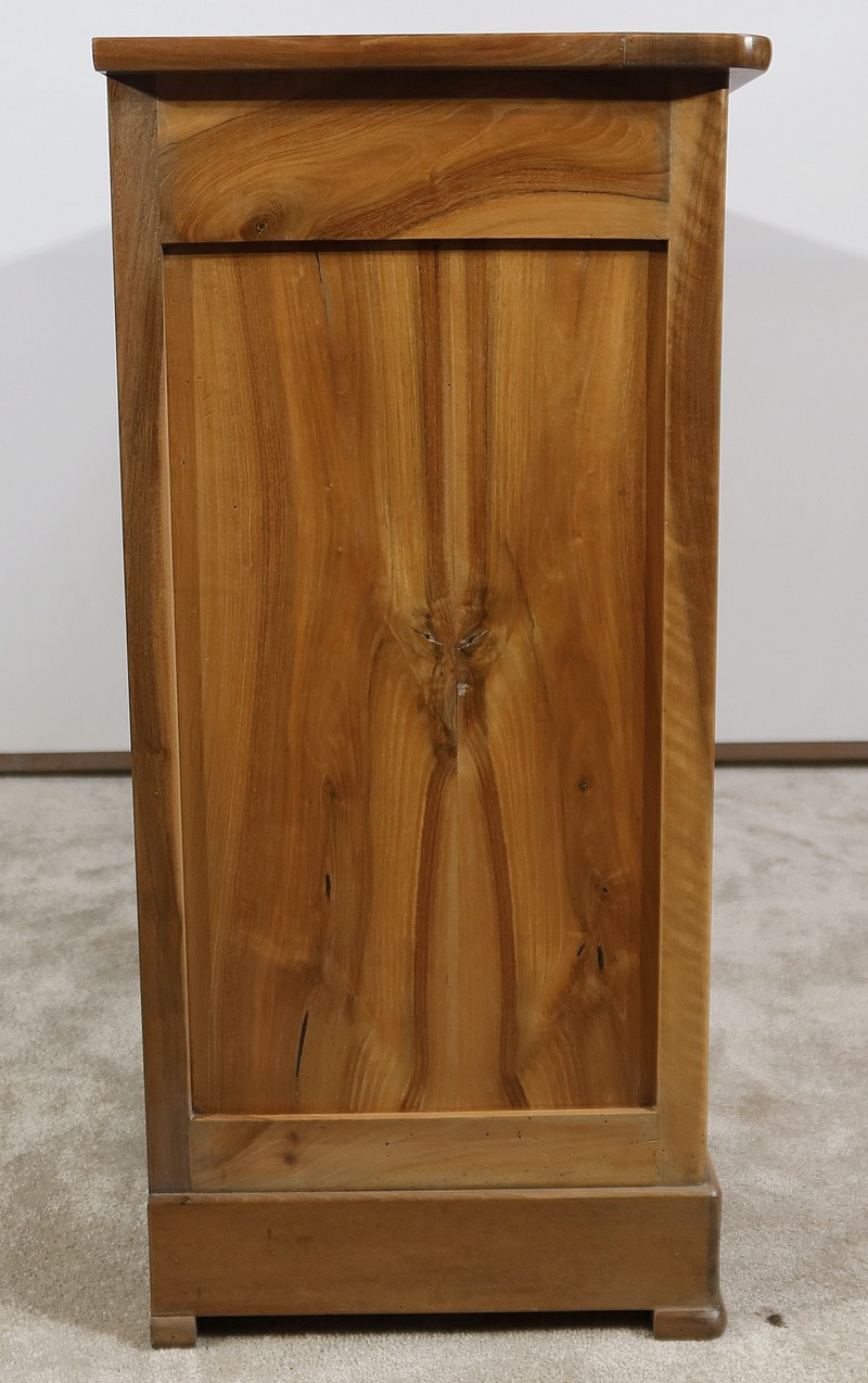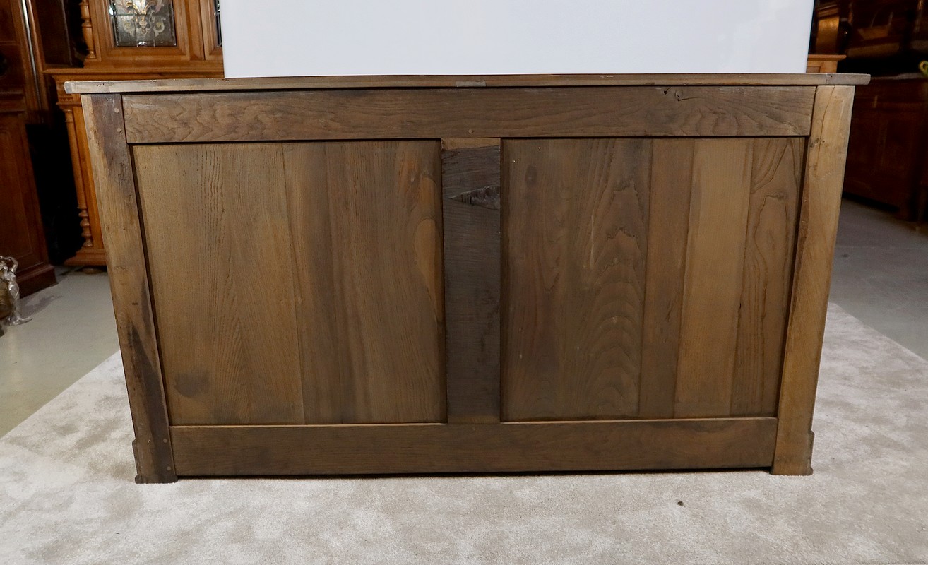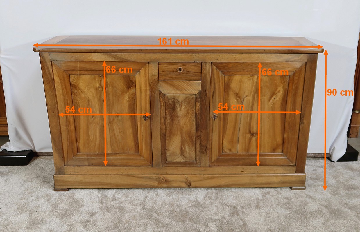 Belle enfilade en noyer massif, de faible profondeur, composée en façade de deux larges portes à encadrement à coupe d’onglet avec mouluration intérieure, foncées de panneaux disposés en livre ouvert, apportant symétrie et harmonie. Ses portes sont agrémentées de clés et serrures d’origine en état de fonctionnement, accompagnées d’entrées bois. Elles ouvrent sur un espace de rangement avec étagères réglables sur crémaillères. Au milieu de ce meuble, un tiroir en partie haute est également muni d’une serrure d’origine avec entrée bois. En dessous, un pilastre est composé de noyer au veinage subtil, disposé en livre ouvert.