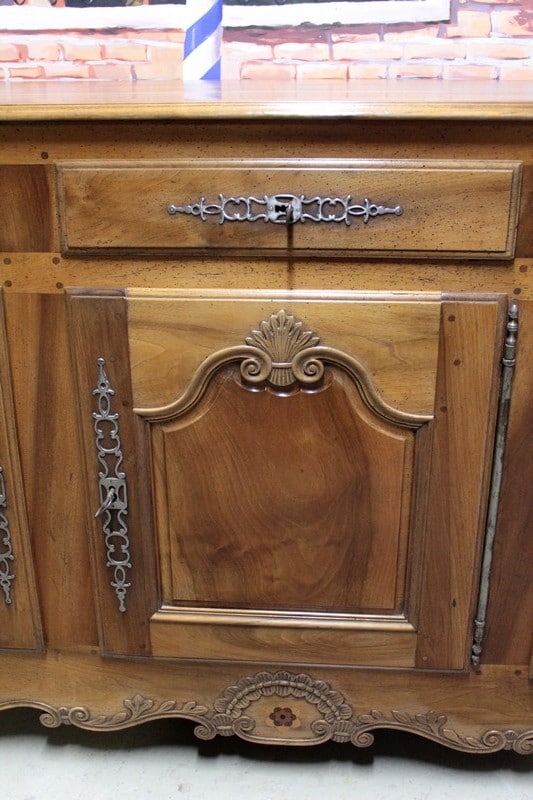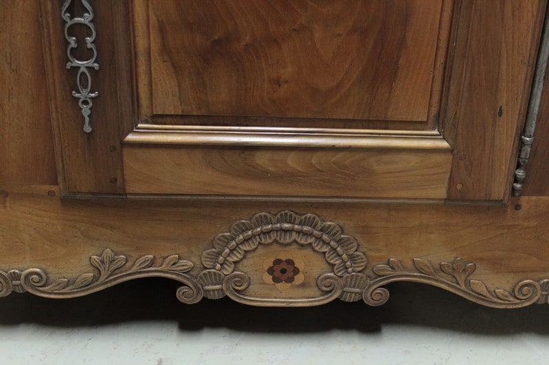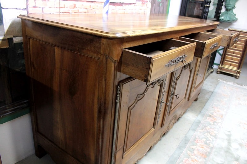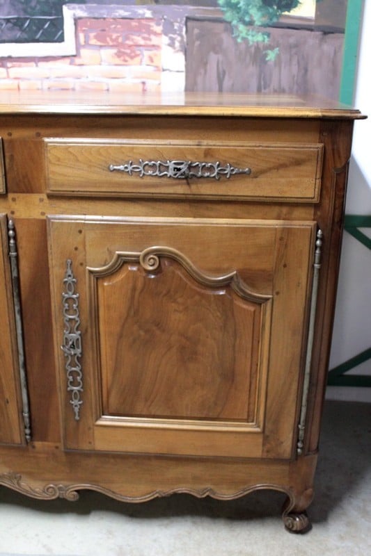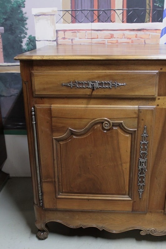 Magnifique enfilade Louis XV en noyer ouvrant à 3 portes et 3 tiroirs. Les fiches et les entrées de serrures sont en fer. Les pieds avants sont à enroulement. La traverse basse est chantournée avec un joli décor de feuilles et une marqueterie au milieu. Région des Pays de Loire , fin du XVIIIe.