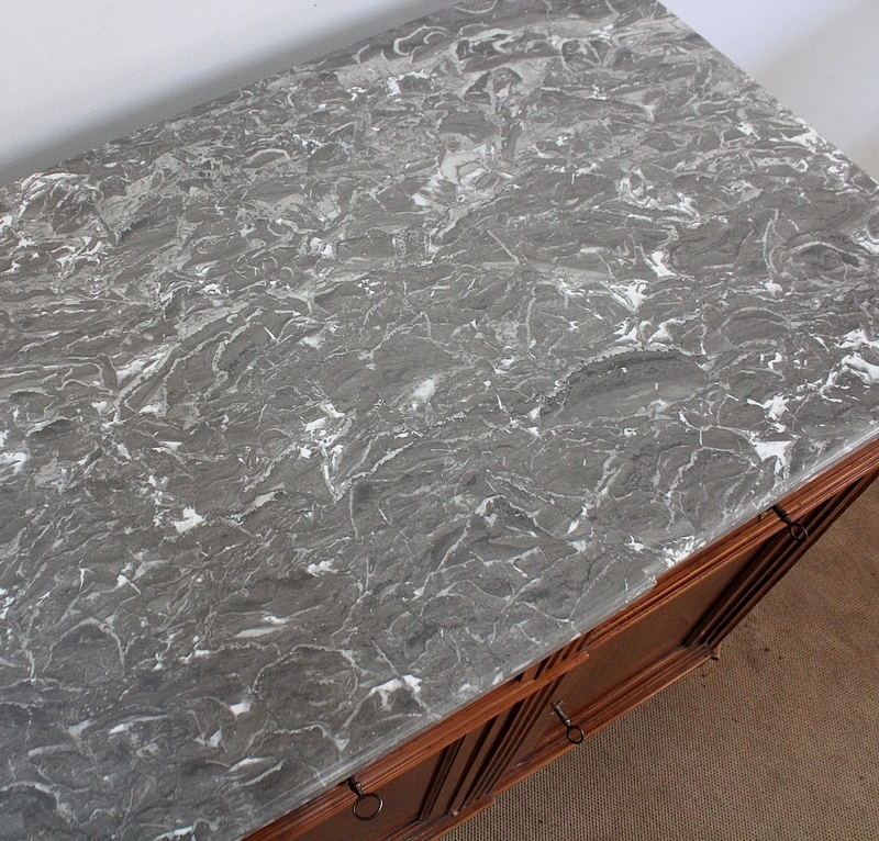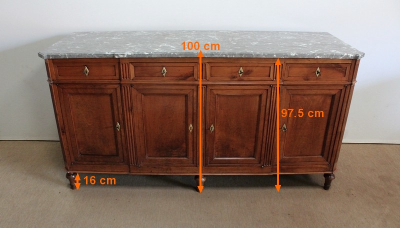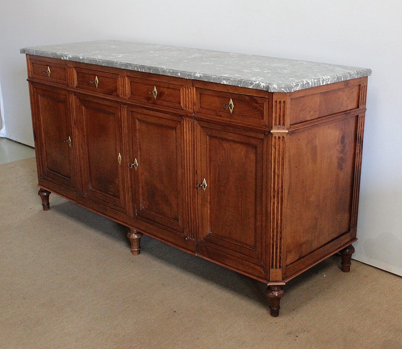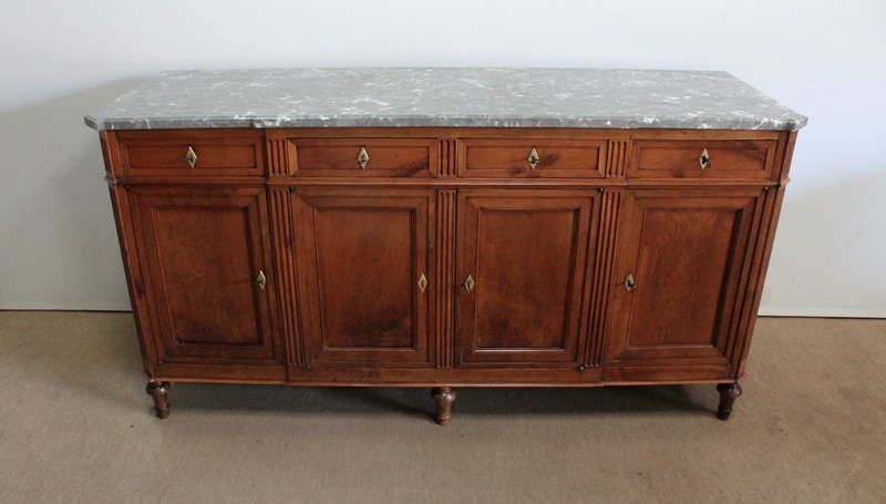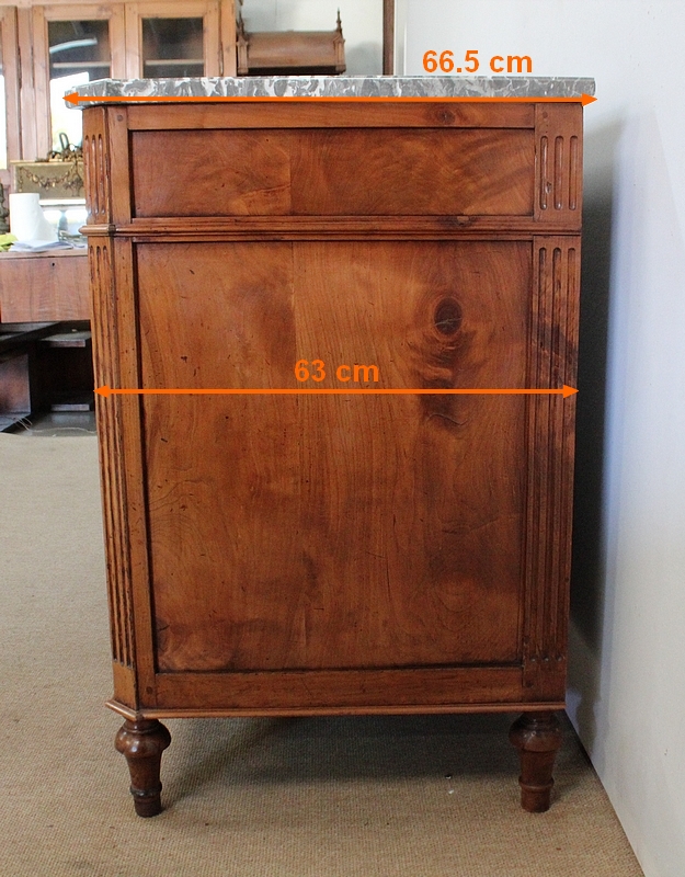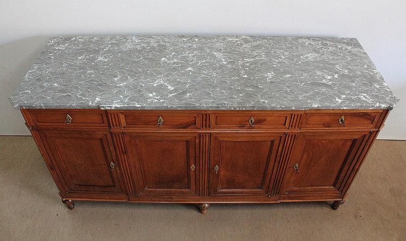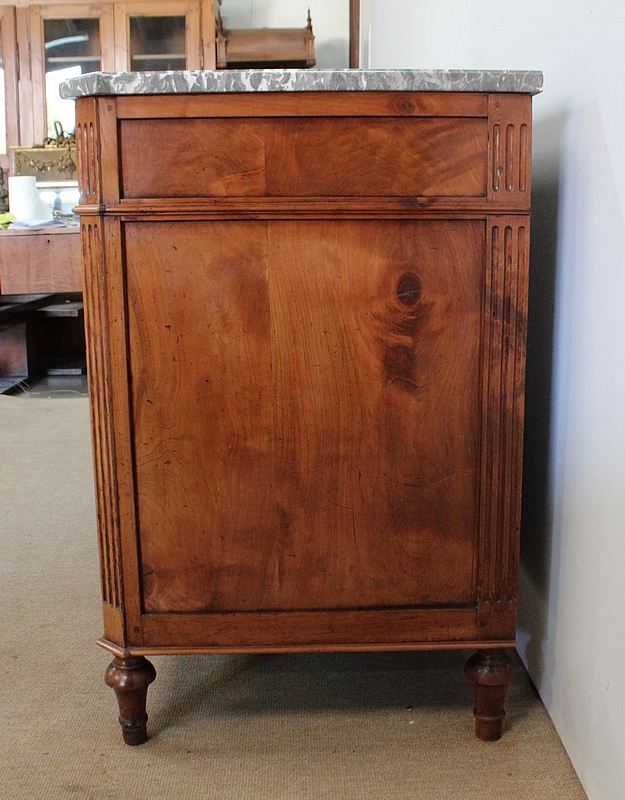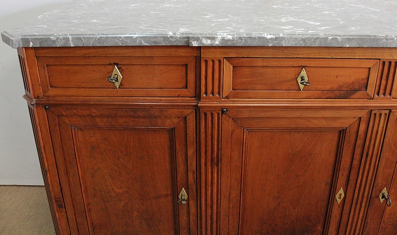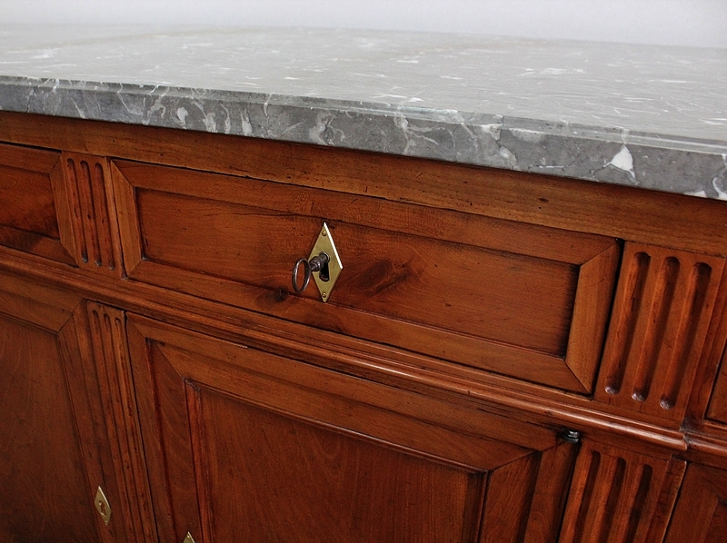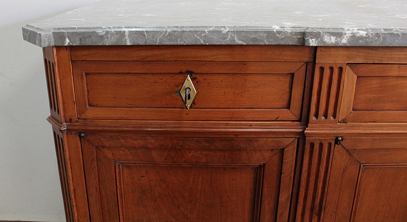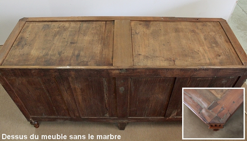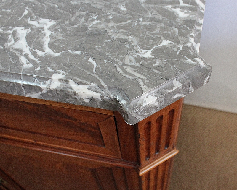 Ce meuble de la région nantaise est agrémenté sur son dessus d’un magnifique marbre gris veiné de blanc postérieur à l’époque. Présentant des ressauts aux angles ainsi qu’en son centre, ce plateau est souligné par une gorge en son pourtour.