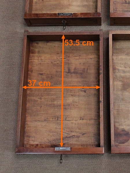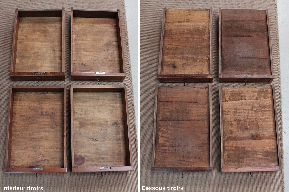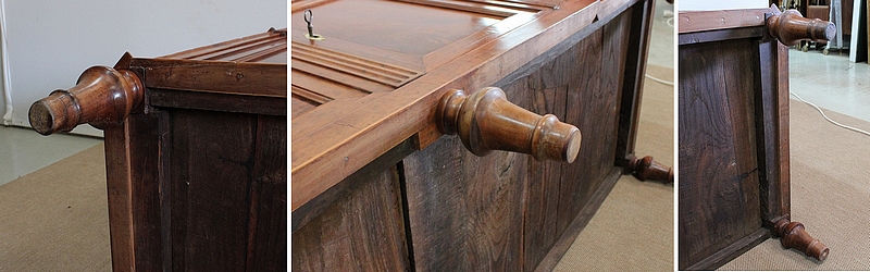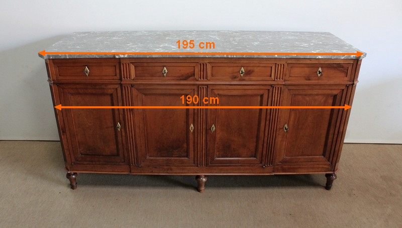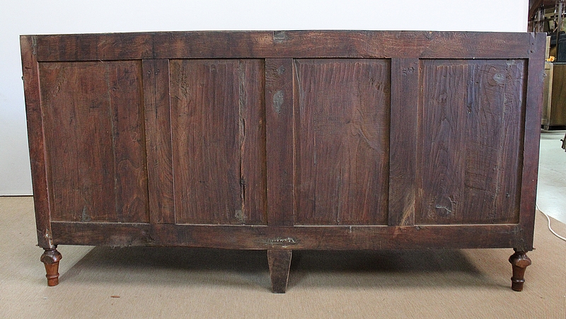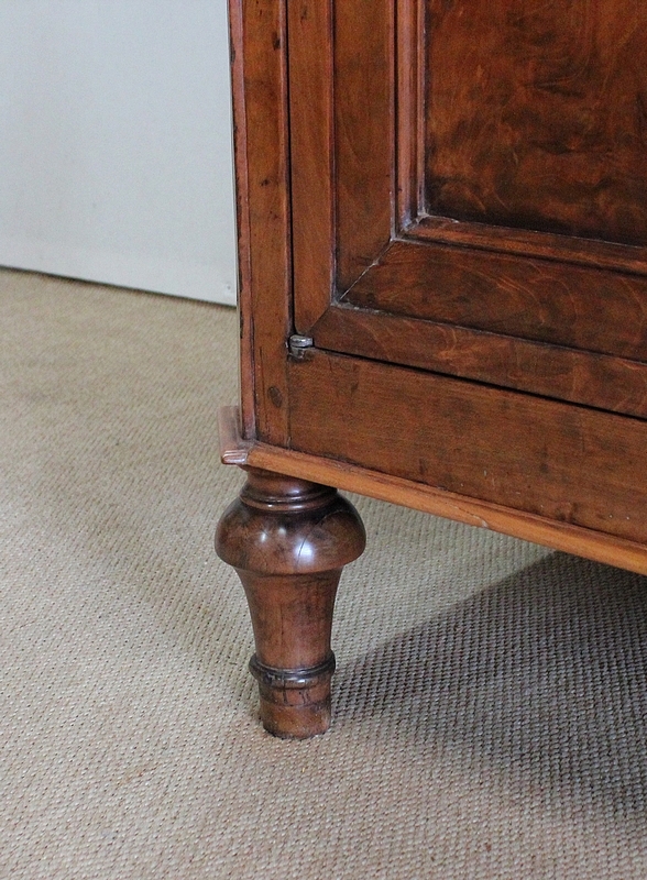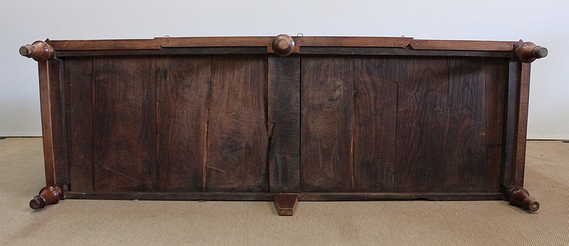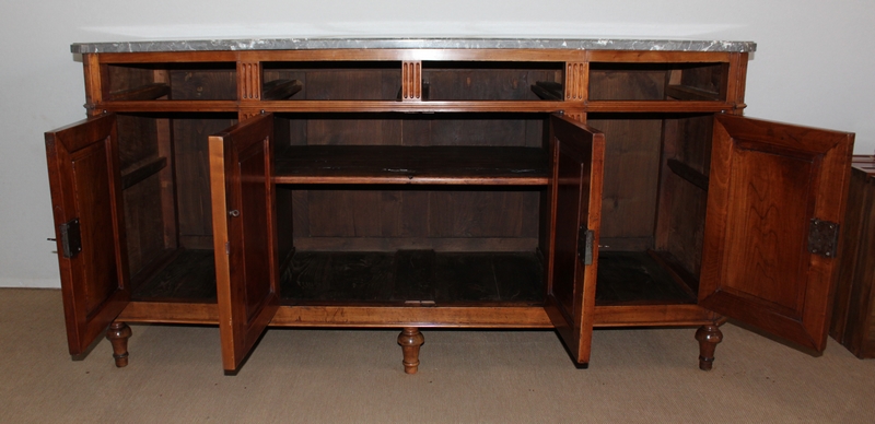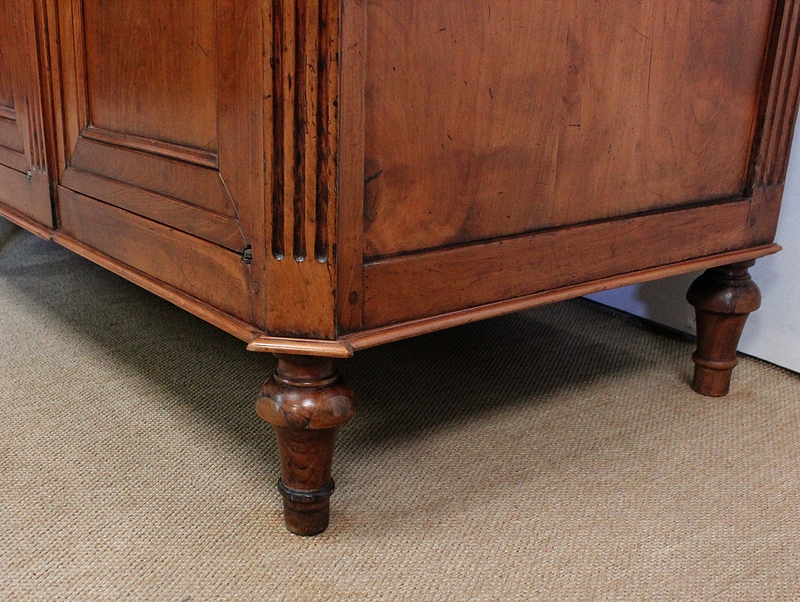 La façade parfaitement symétrique de cette enfilade unique est dotée de quatre tiroirs à défoncement et de quatre portes à coupe d’onglet également à défoncement, accompagnées d’une moulure intérieure et composées d’une seule planche de merisier sans joint. Ces portes s’ouvrent par briquet déporté et se ferment par des serrures en fer d’origine en état de fonctionnement, accompagnées de leur clé respective. Chaque entrée en forme de losange est en laiton. À l’intérieur de ce meuble, on remarquera la qualité de travail des portes façonnées à plate bande et à moulure typique du val de Loire.