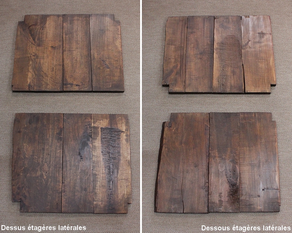 A l’avant il offre deux pieds à pans coupés agrémentés de cannelures arrêtées se terminant en toupie et un pied droit au centre. Les côtés de cette enfilade sont constitués de deux panneaux en merisier massif accompagnés de pieds arrière droits à cannelures arrêtées.