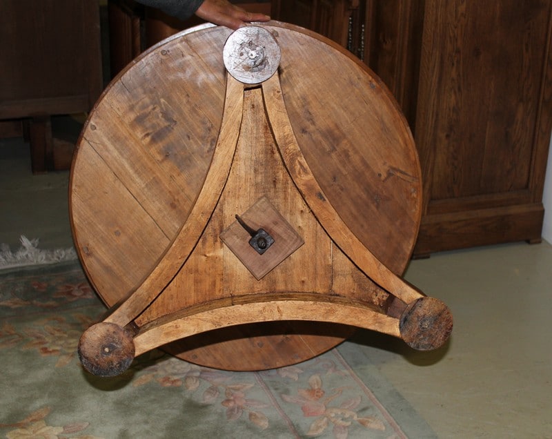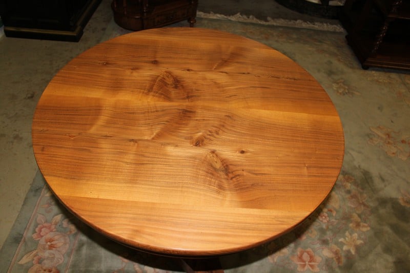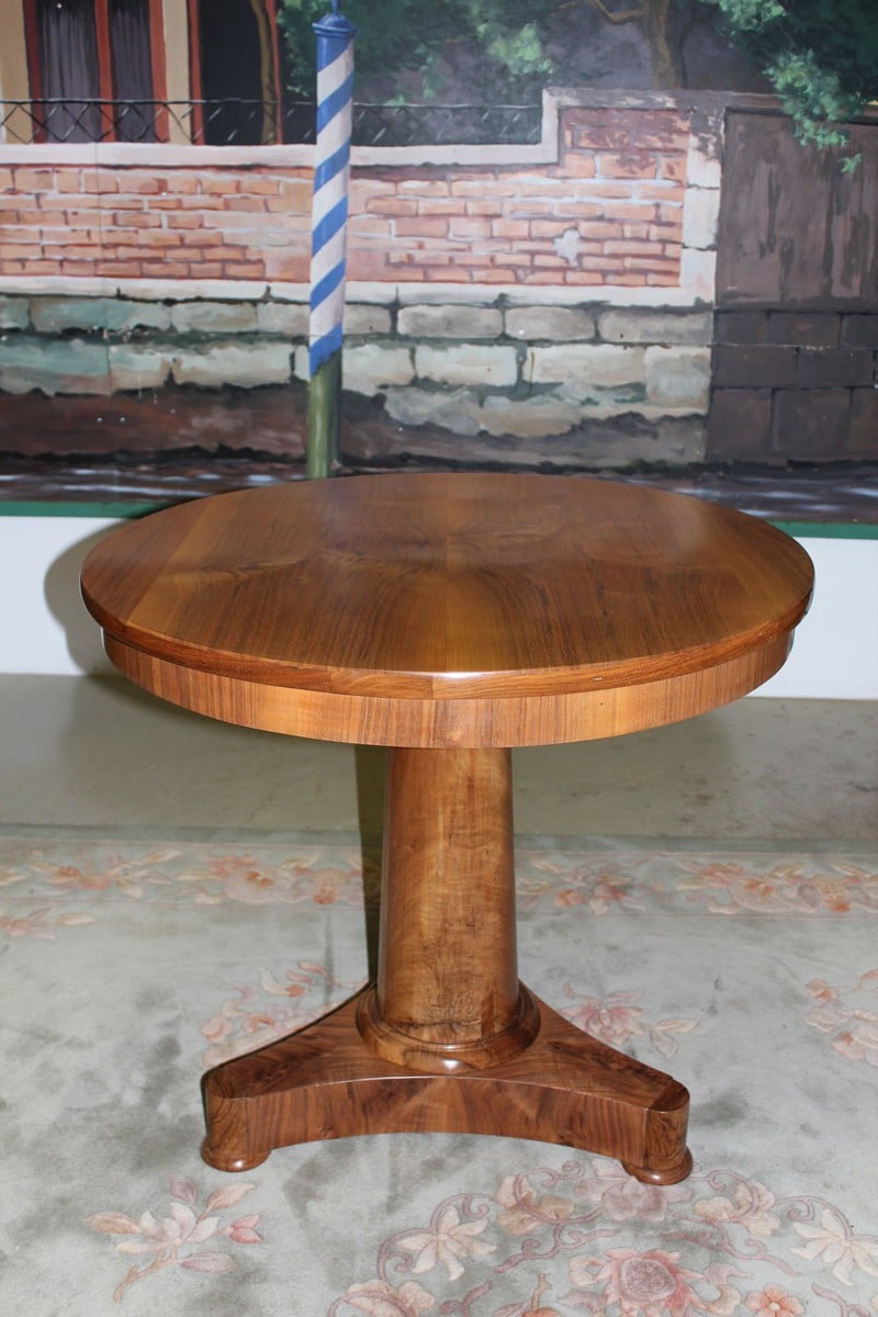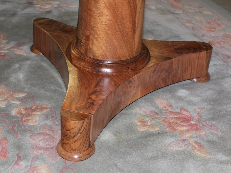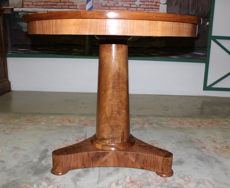 Guéridon Empire dessus bois, en placage de noyer blond. Le fût est cylindrique et repose sur un piètement tripode. Époque Empire (1810)