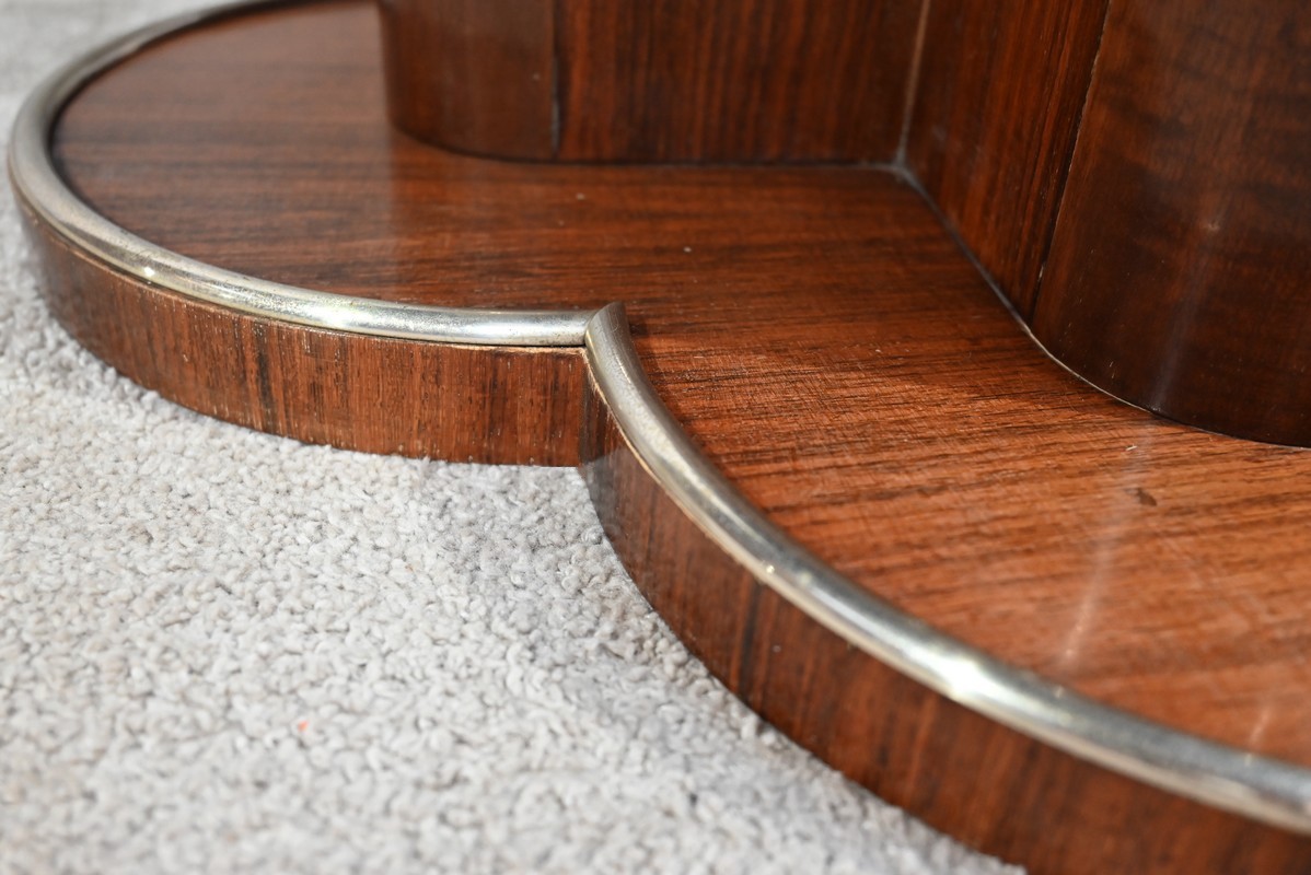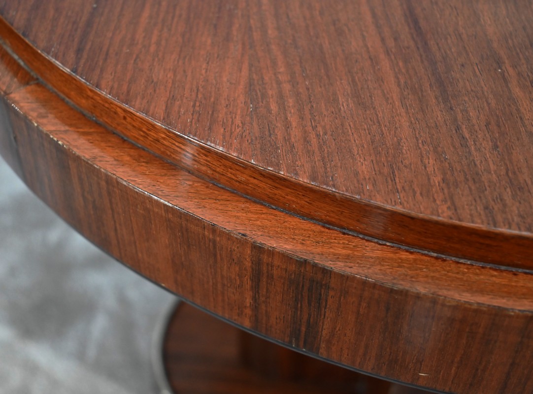 Ce guéridon de forme circulaire présente une ceinture en placage vertical.