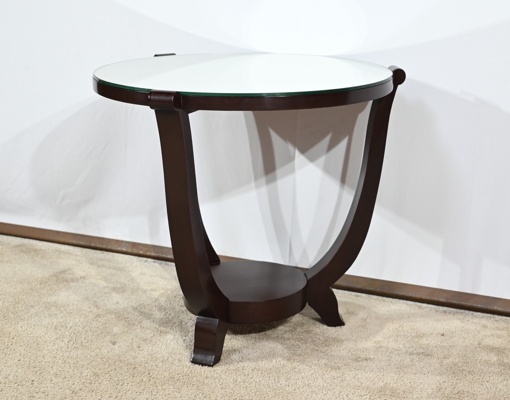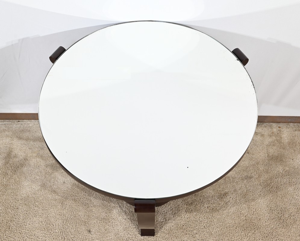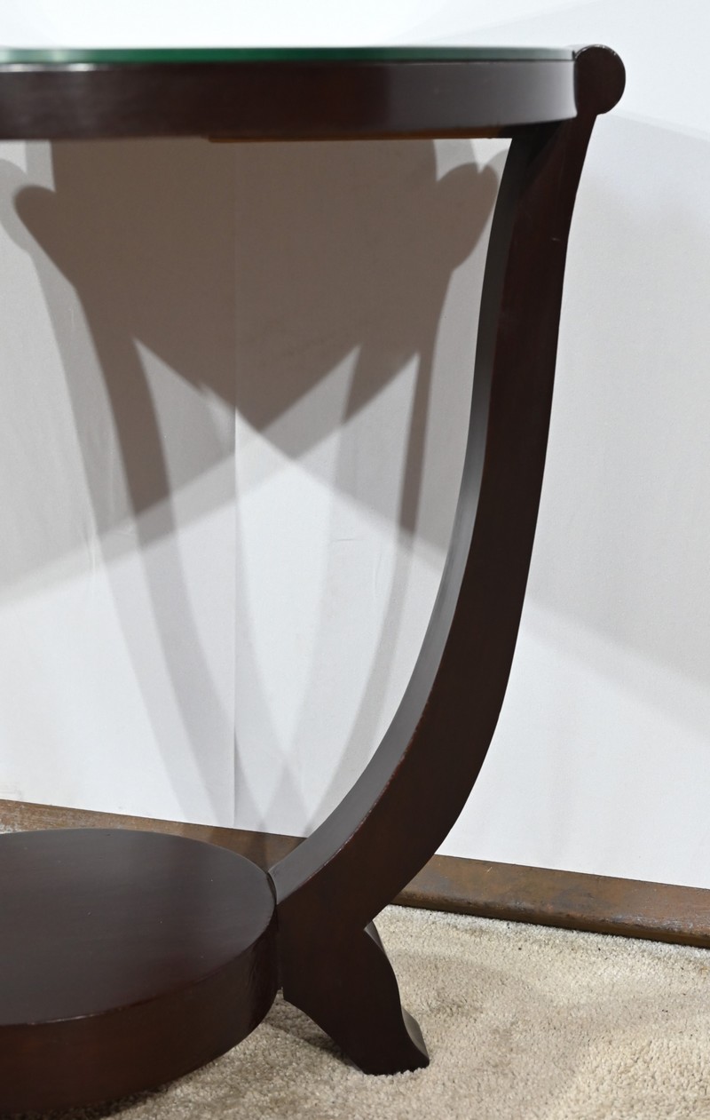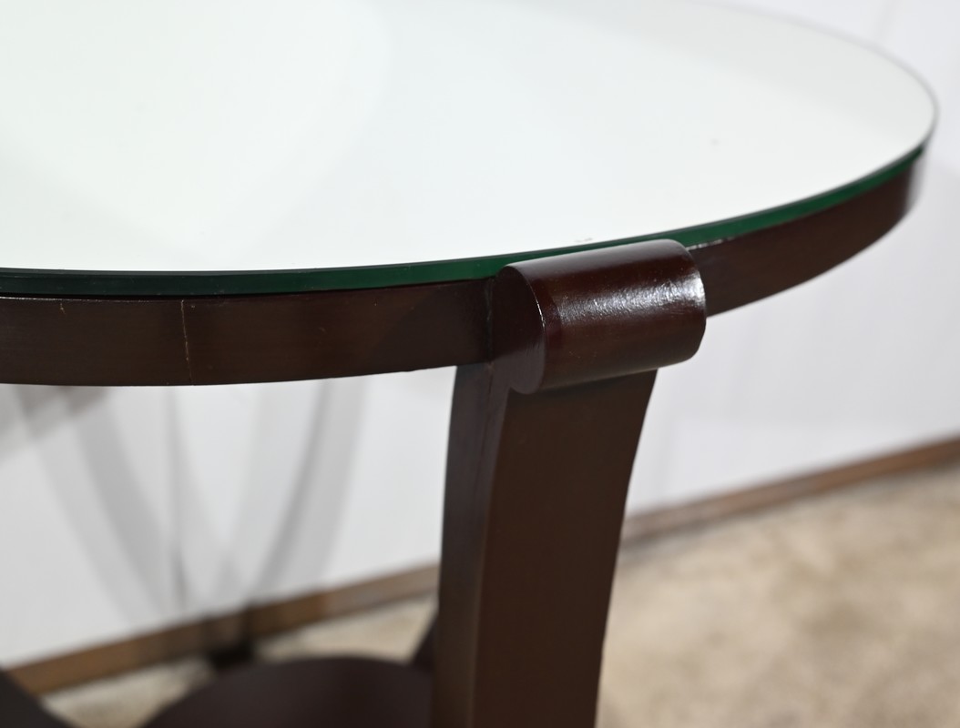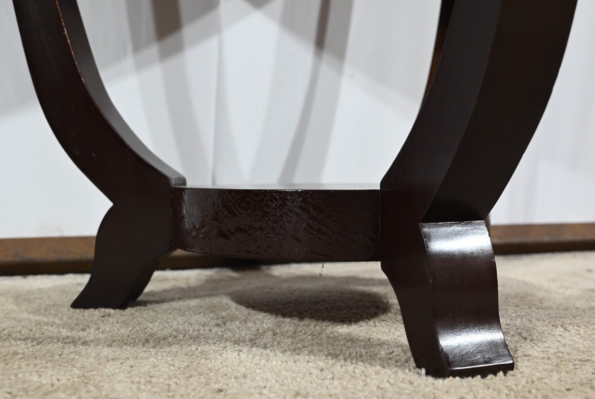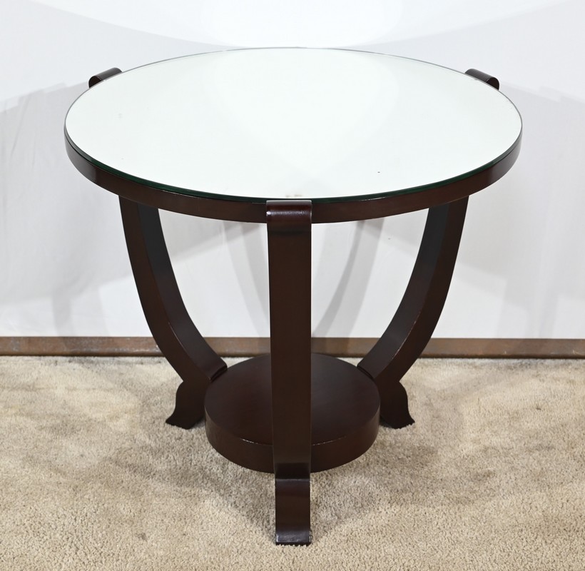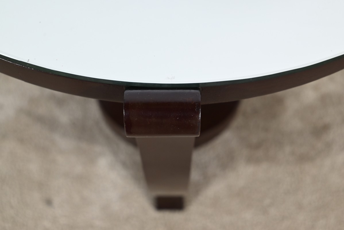 Ce guéridon circulaire, en acajou foncé, présente un dessus bois avec plateau miroir.