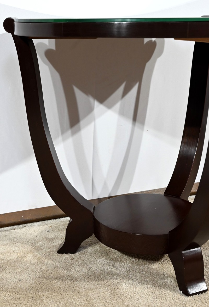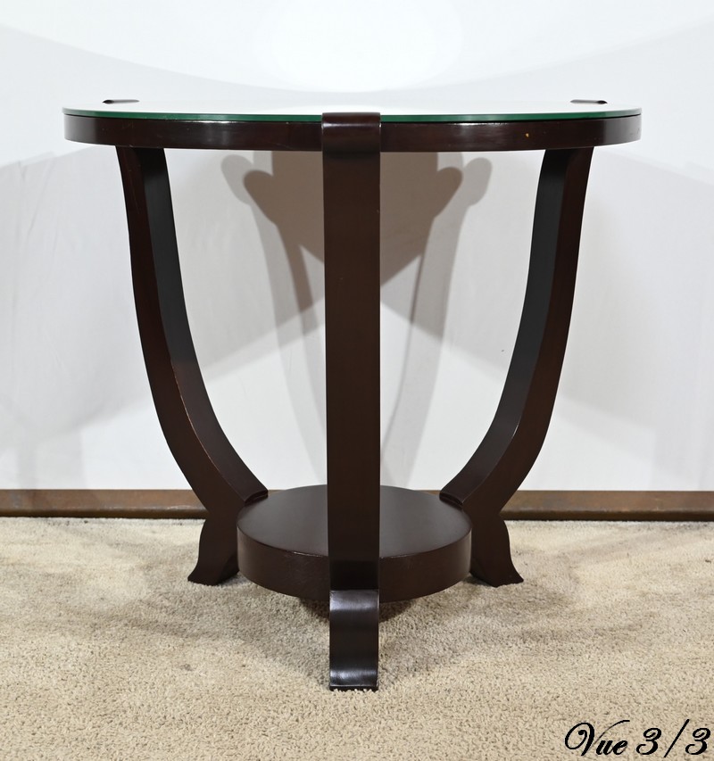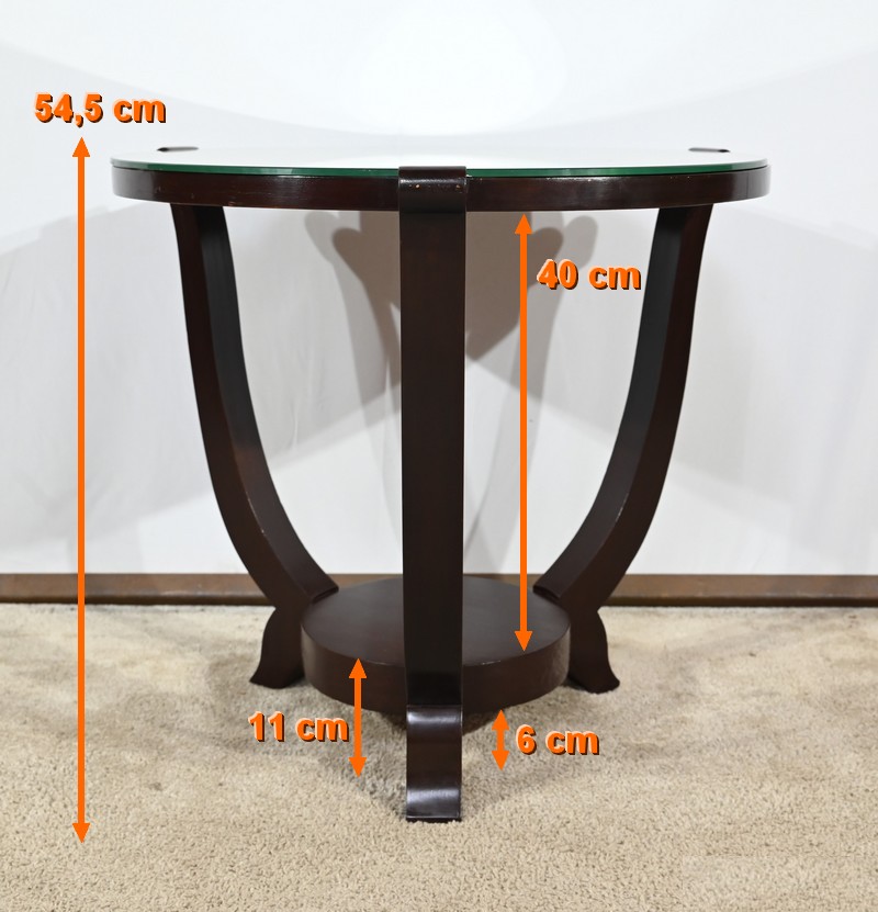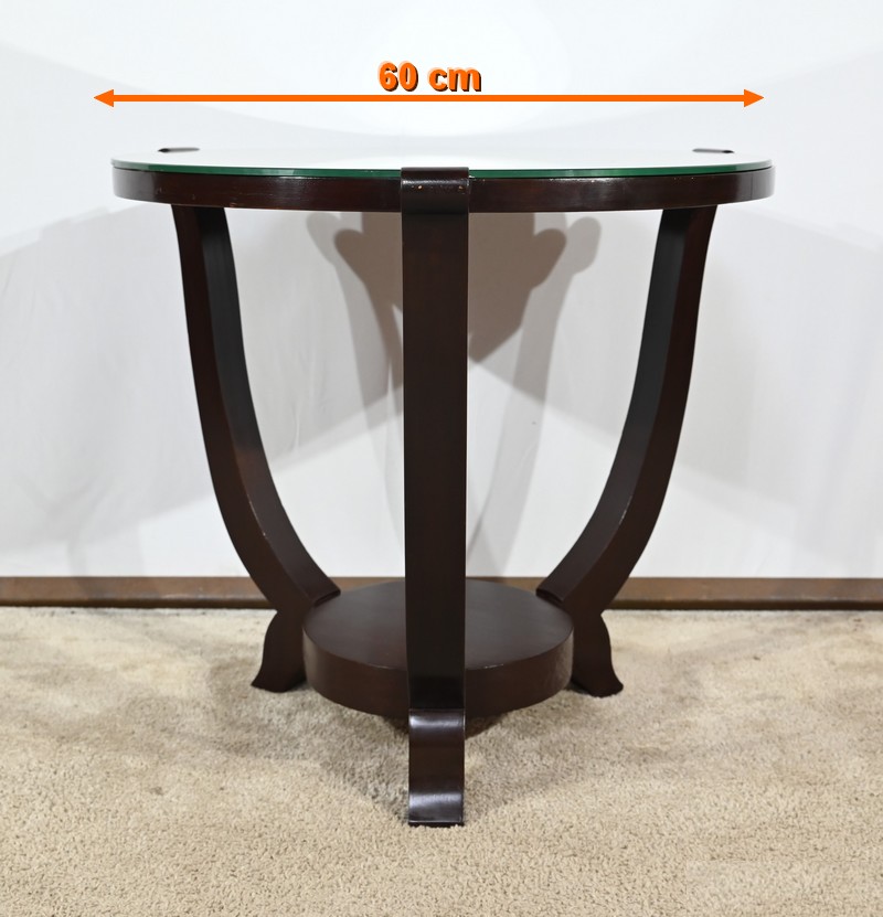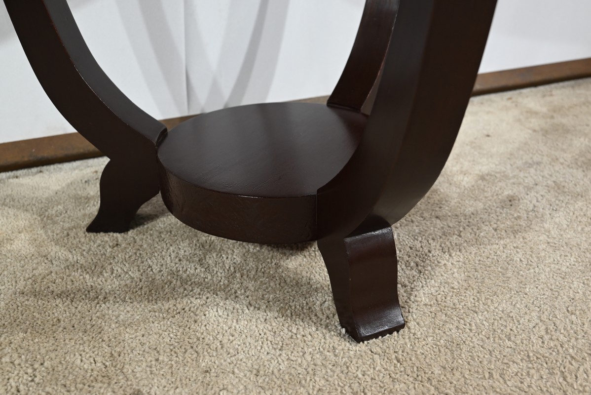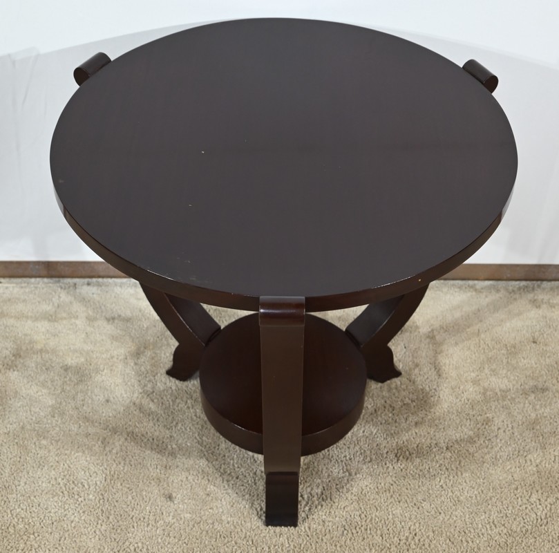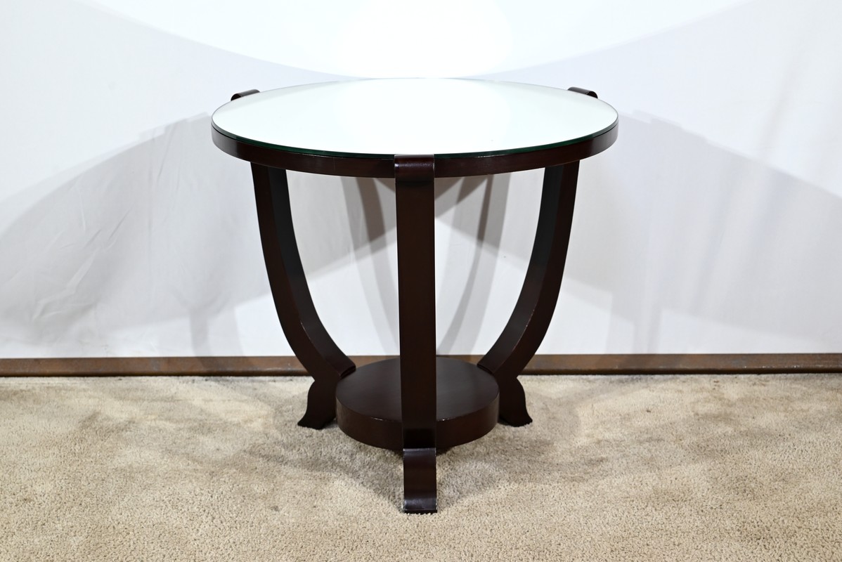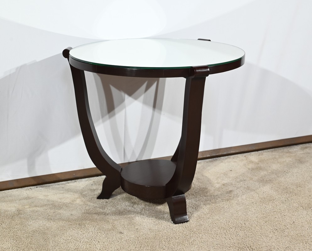 Ce guéridon circulaire, en acajou foncé, présente un dessus bois avec plateau miroir.