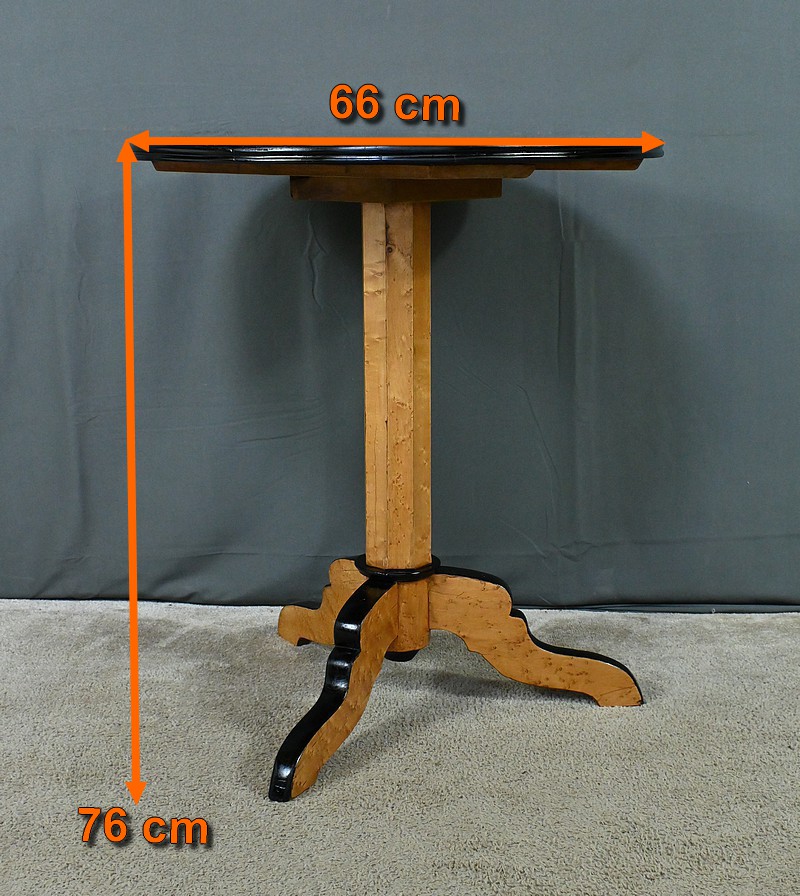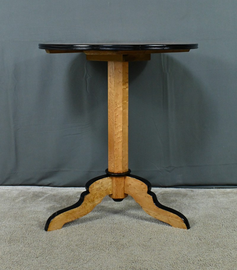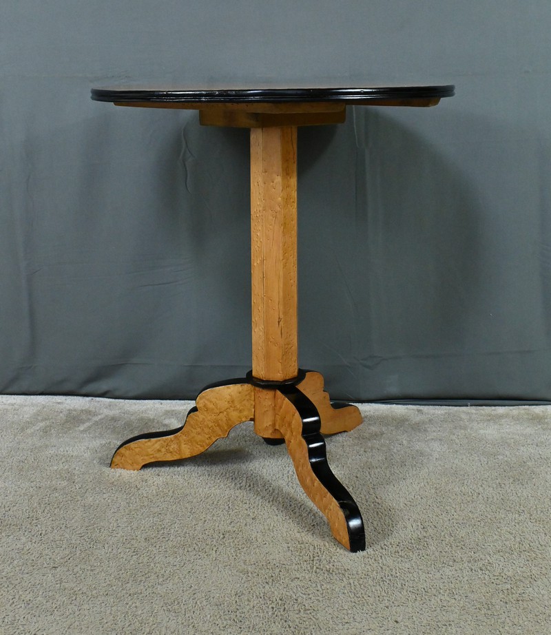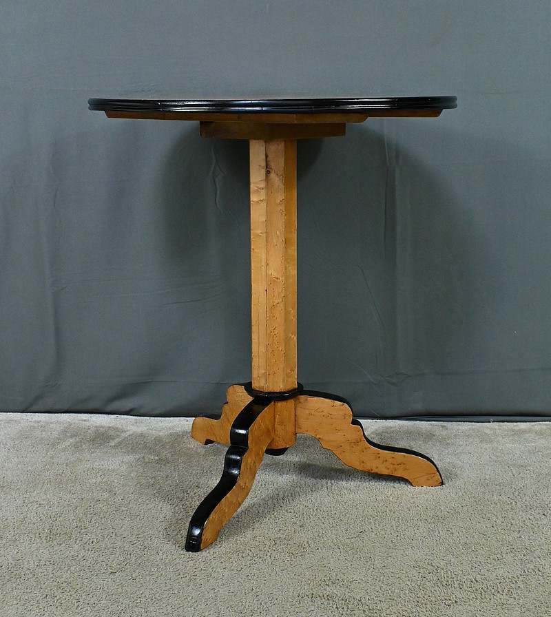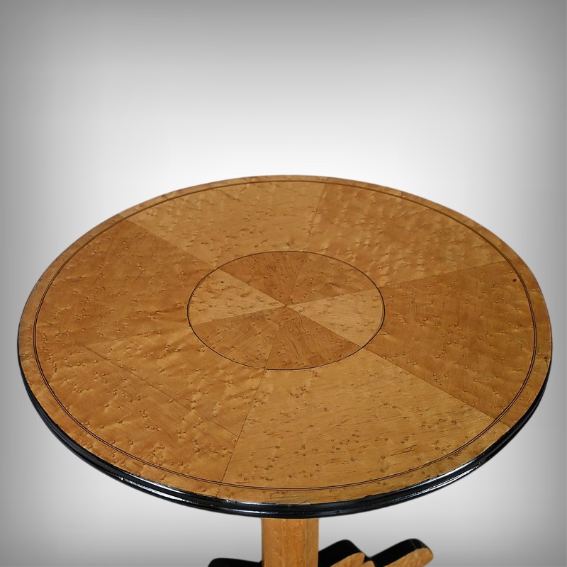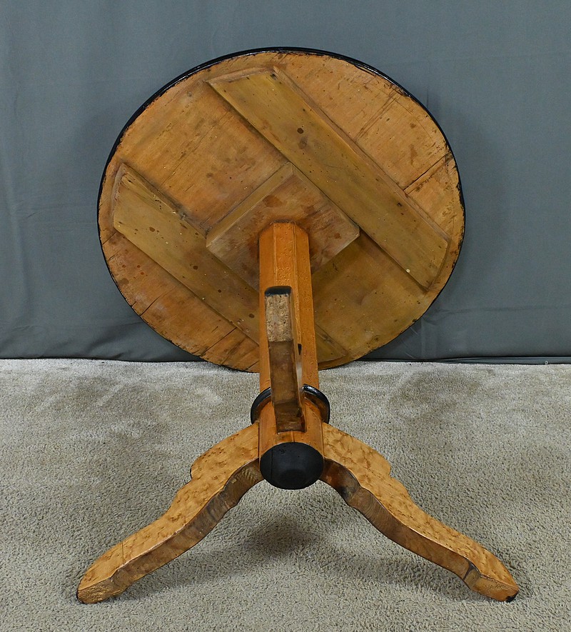 Magnifique guéridon en érable moucheté d’époque Napoléon III doté d’un plateau circulaire sublimé par un placage géométrique minutieusement agencé. Le chant peint en noir vient accentuer le contraste et mettre en valeur la finesse et le veinage de l’érable. Le fût facetté apporte une touche de dynamisme et crée des jeux de lumière subtils, renforçant le caractère esthétique du guéridon. Quant à son piétement tripode, il se distingue par son mouvement fluide et gracieux, inspiré des lignes sinueuses prisées sous le règne de Napoléon III. Chaque pied, habillé d’un chant peint en noir, confère à la pièce une harmonie visuelle parfaite. Alliant fonctionnalité et beauté, ce guéridon trouvera aisément sa place dans un intérieur classique ou éclectique.