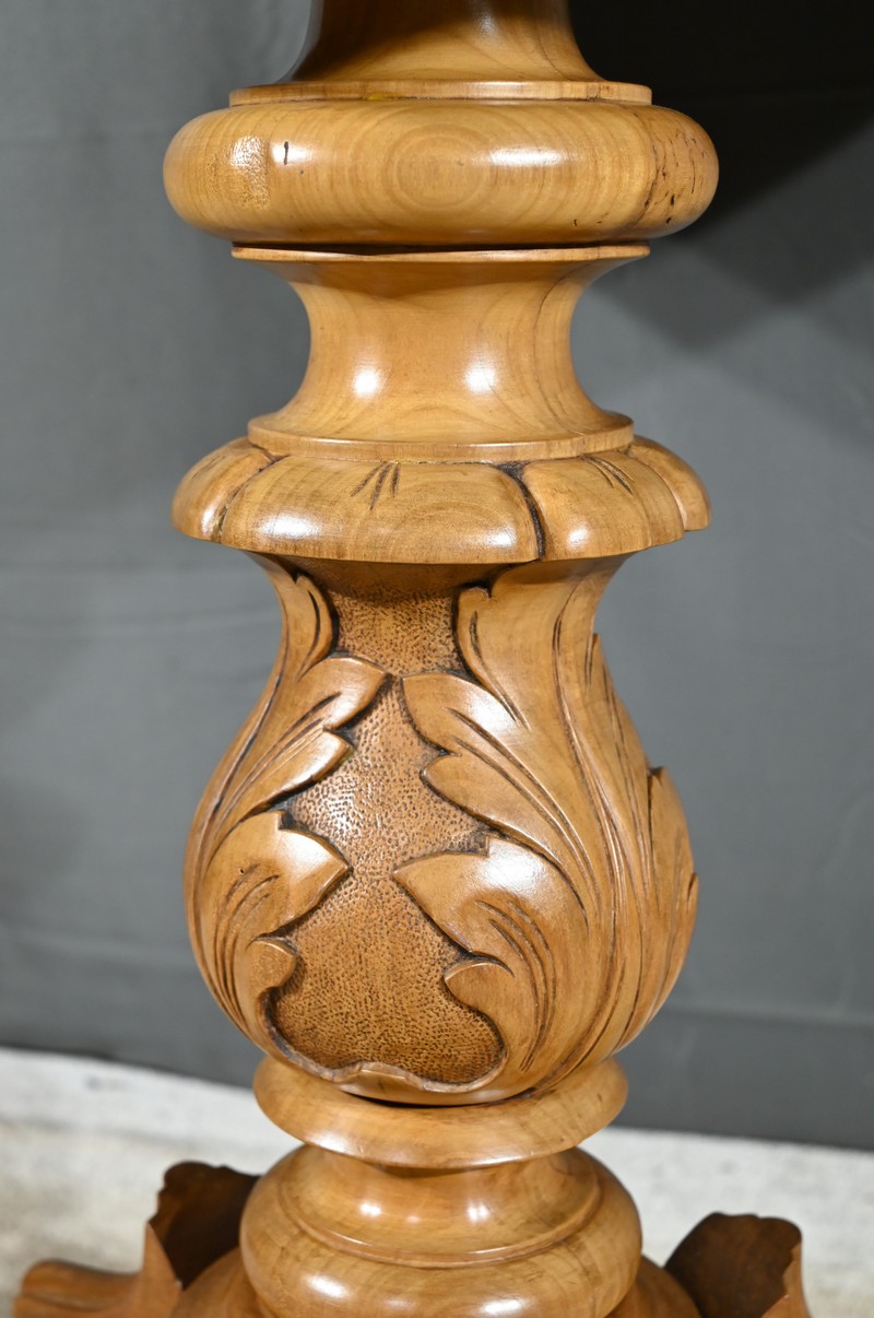 Il est soutenu par une colonne centrale ornée de motifs sculptés de feuilles d’acanthe en relief se terminant par un pied tripode, par ailleurs sculpté, à grand empâtement pour une parfaite stabilité.