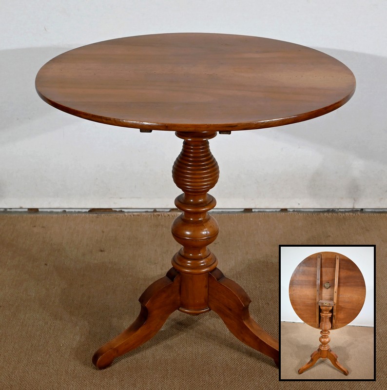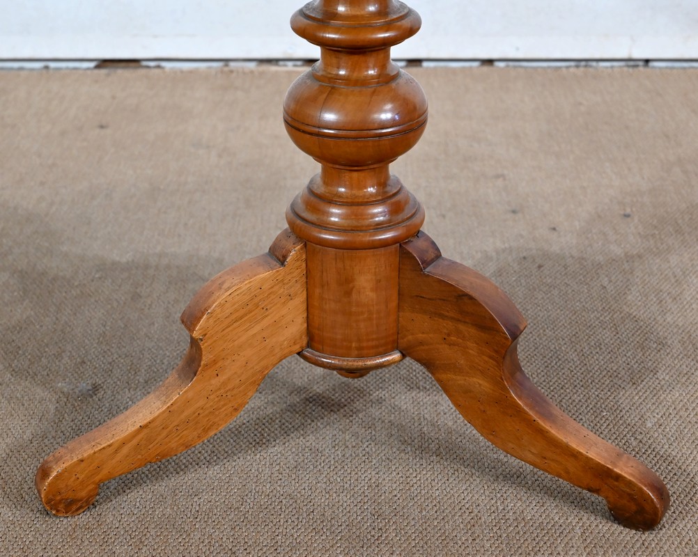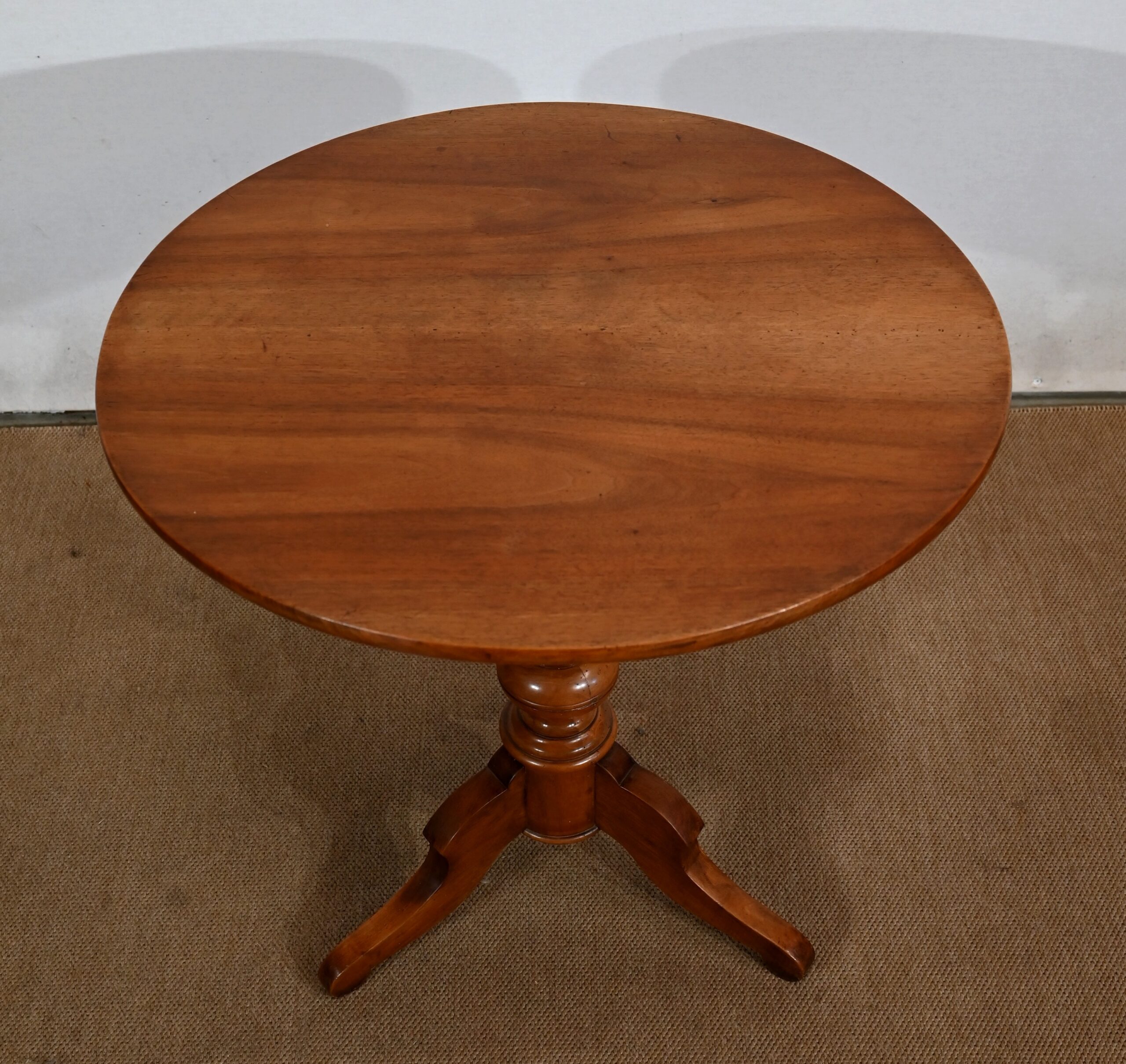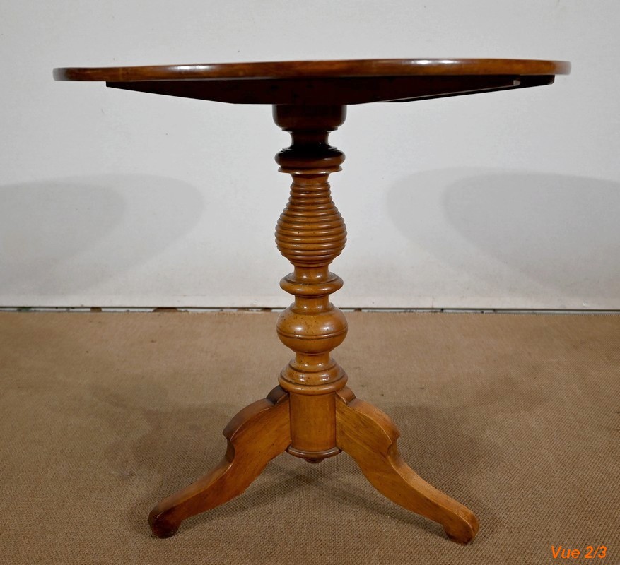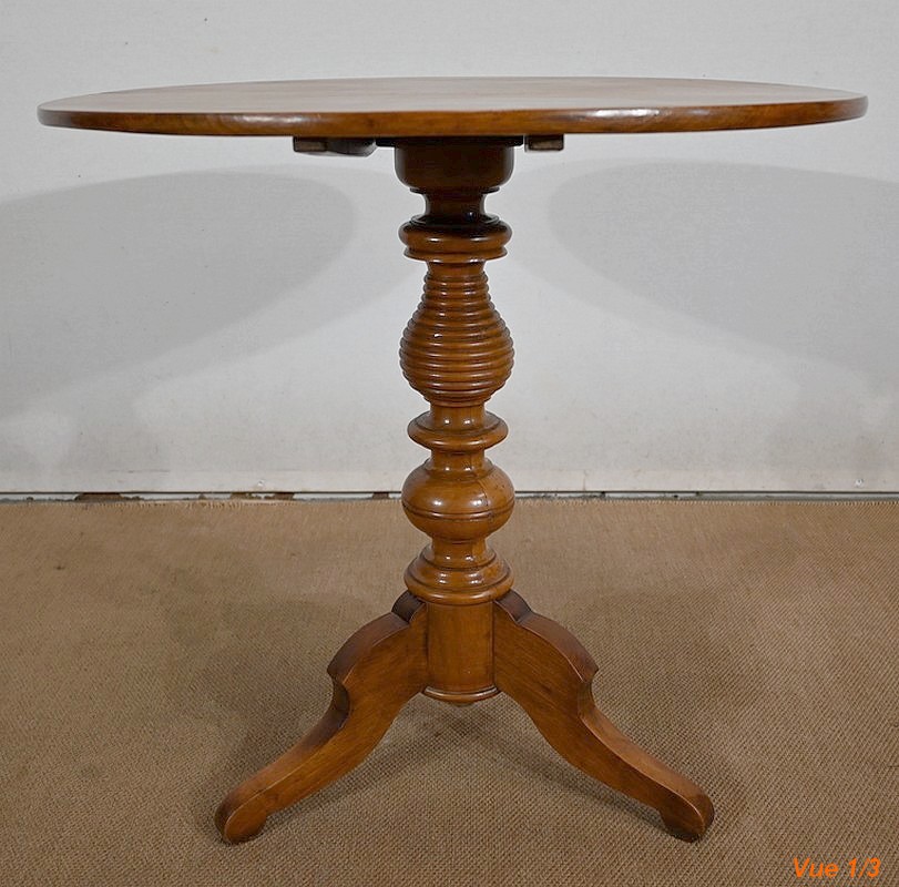 Ce guéridon rond est entièrement en noyer massif. Le fut tourné simple est à anneaux et repose sur trois pieds découpés à empattement.