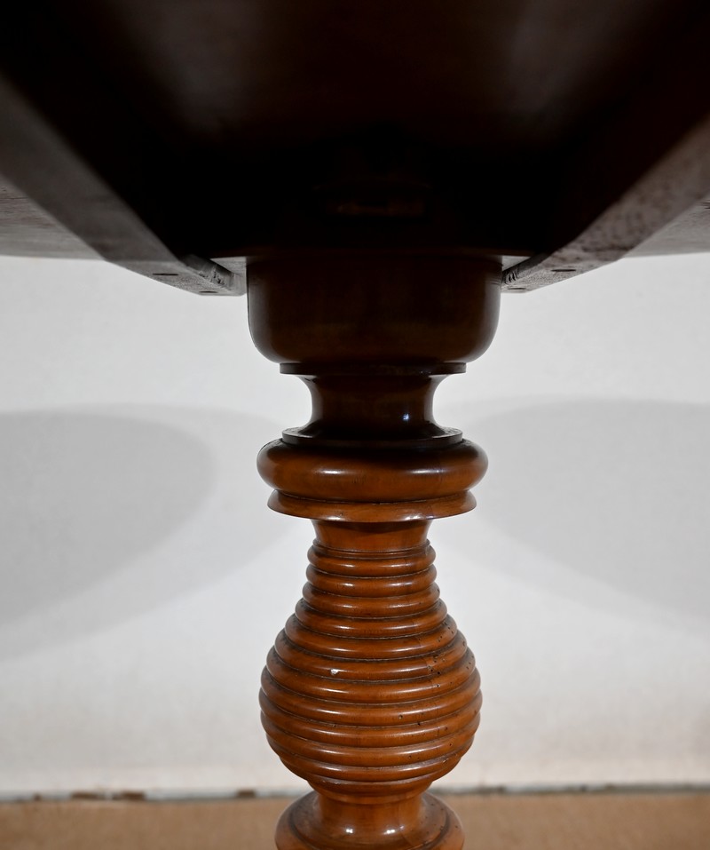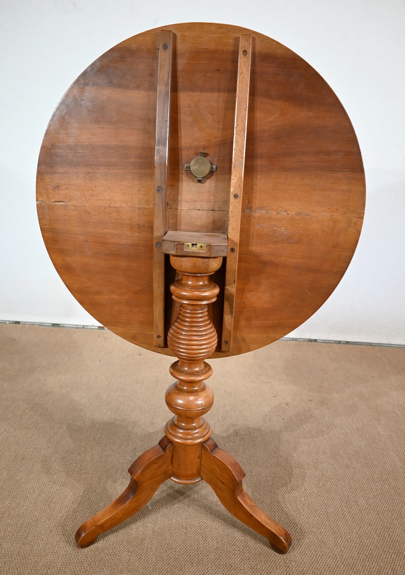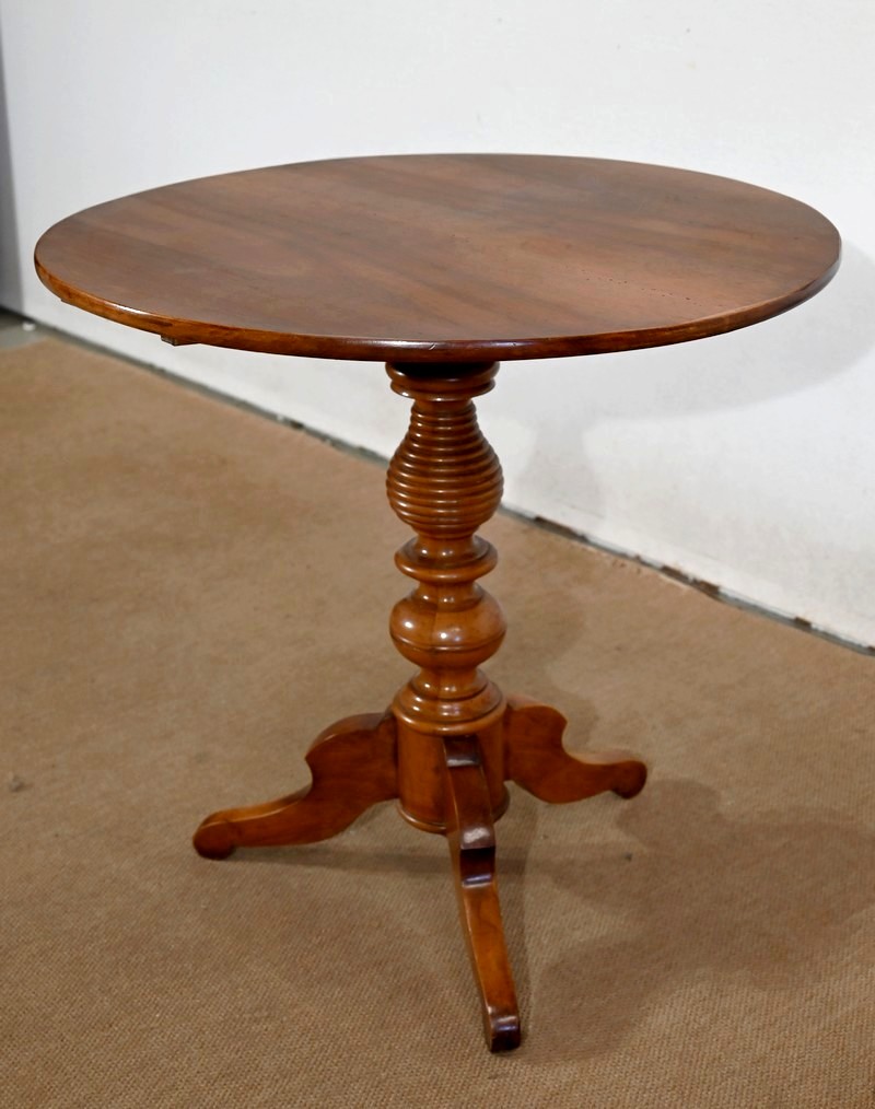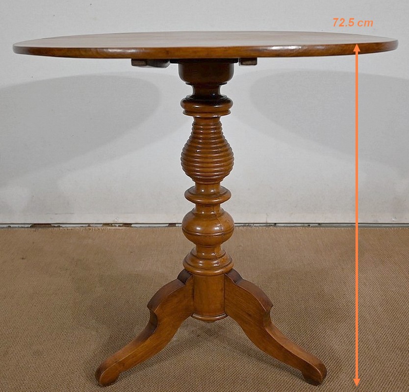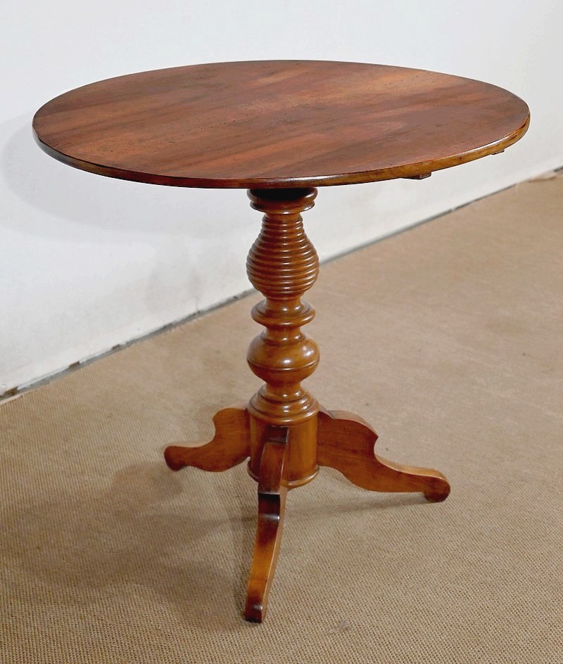 Ce guéridon rond est entièrement en noyer massif. Le fut tourné simple est à anneaux et repose sur trois pieds découpés à empattement.