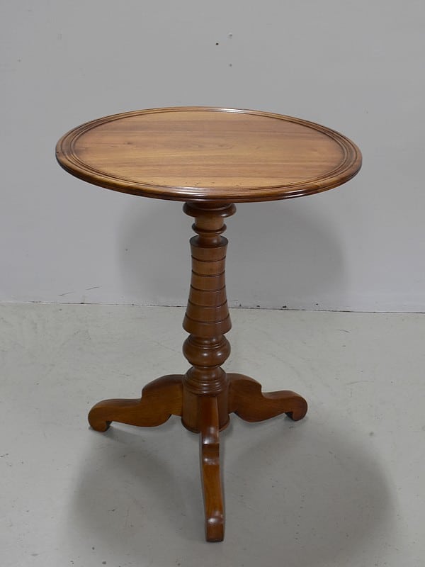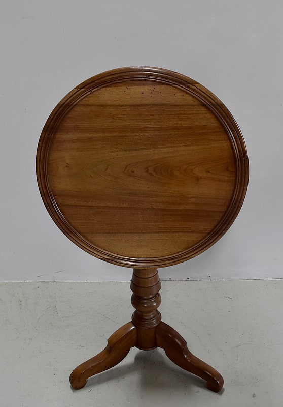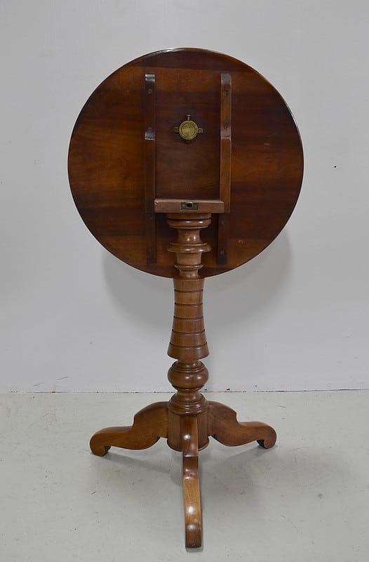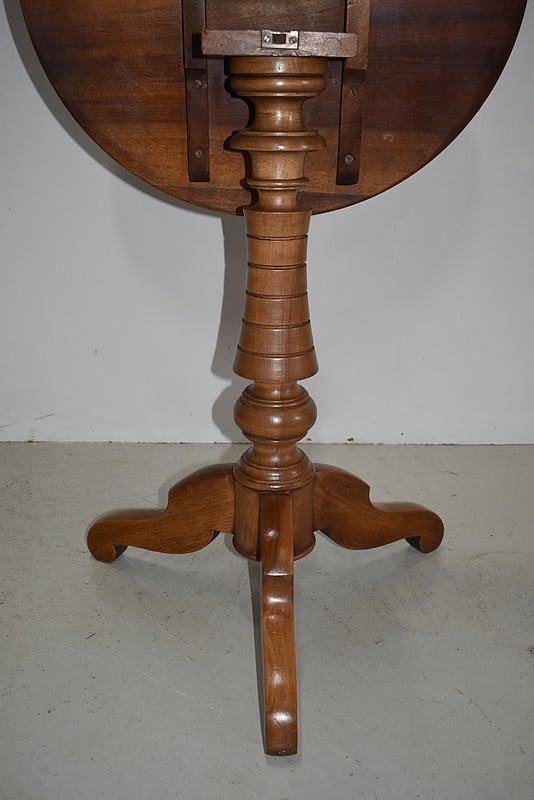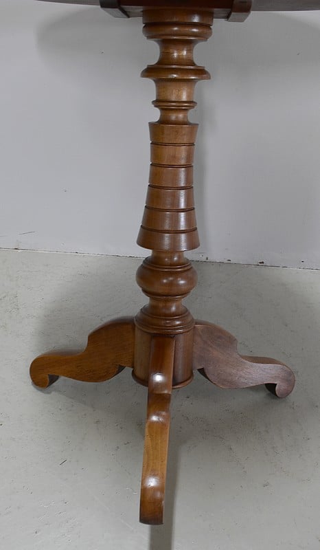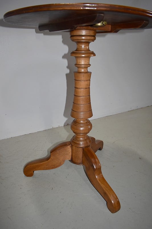 Le plateau, à double moulure sur son pourtour, est posé sur un fût central tourné , il est basculant, grâce à un système, permettant ainsi de réduire son encombrement.