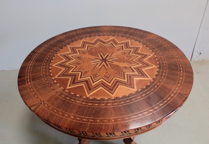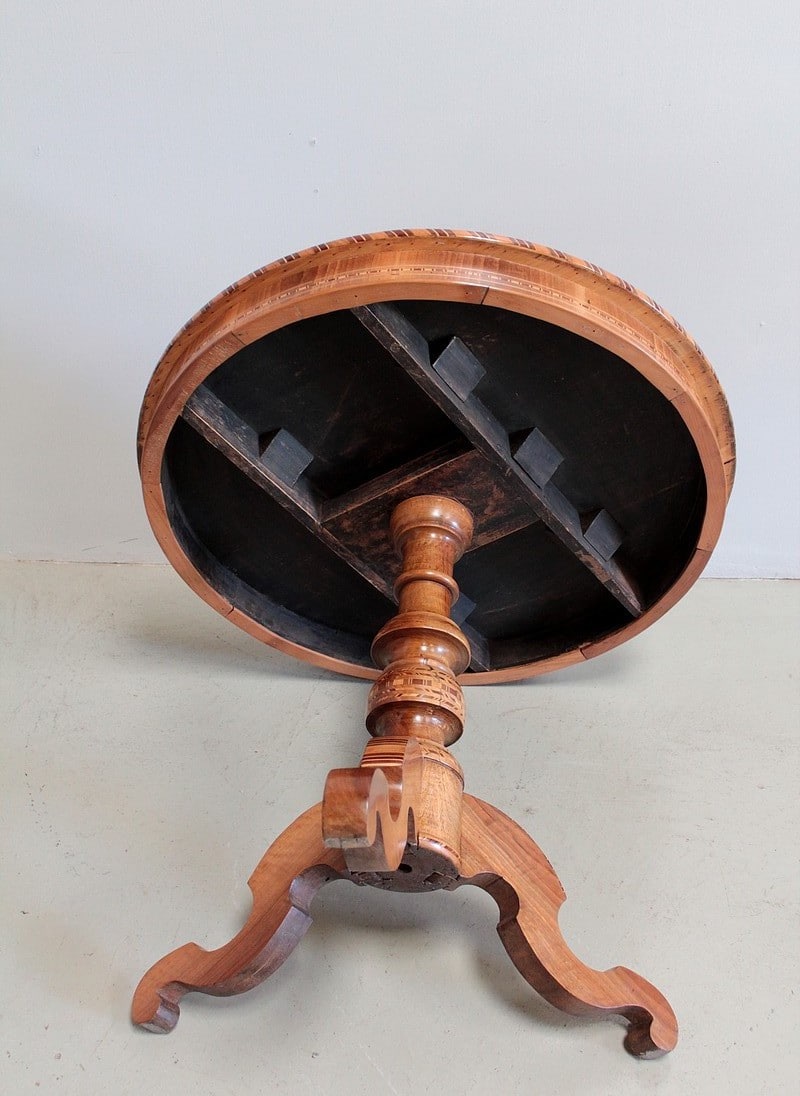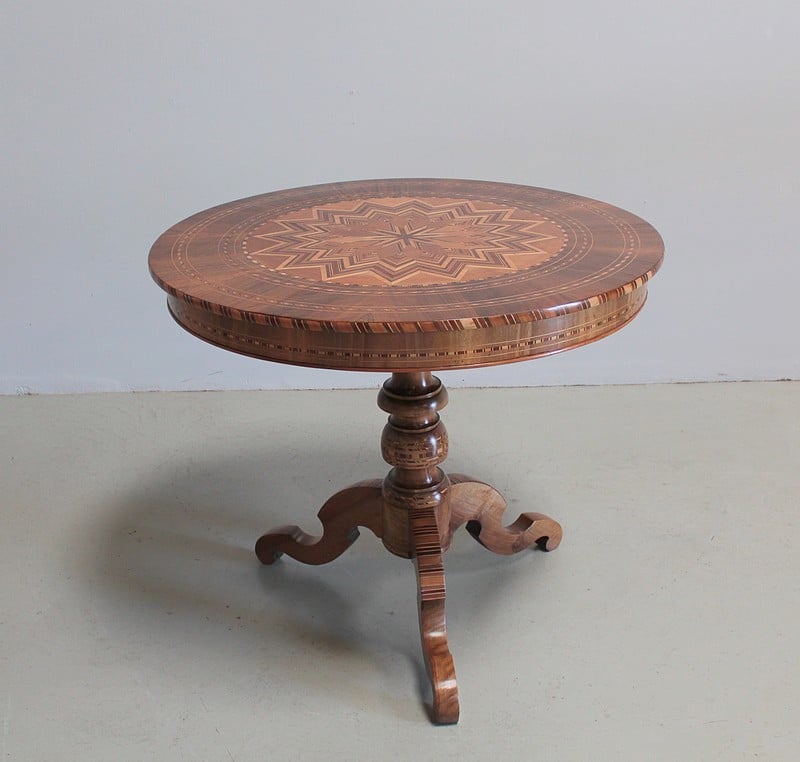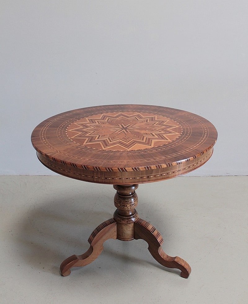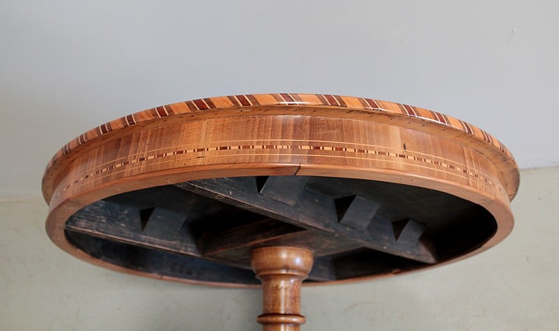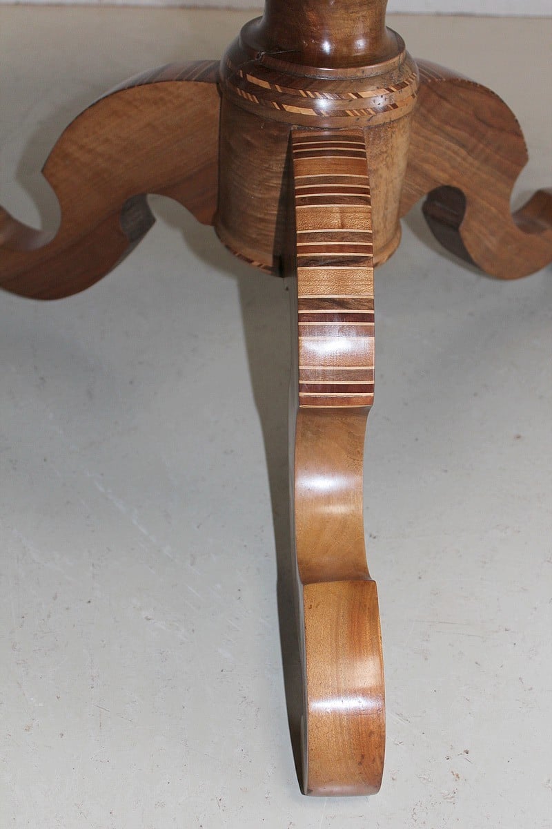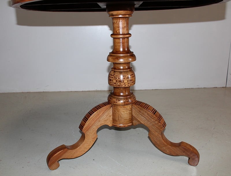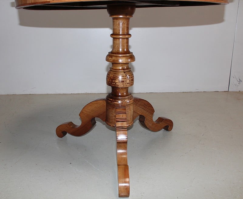 Guéridon rond marqueté, Louis-Philippe, en placage de noyer et merisier posé sur un piètement tripode.