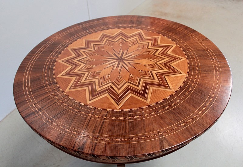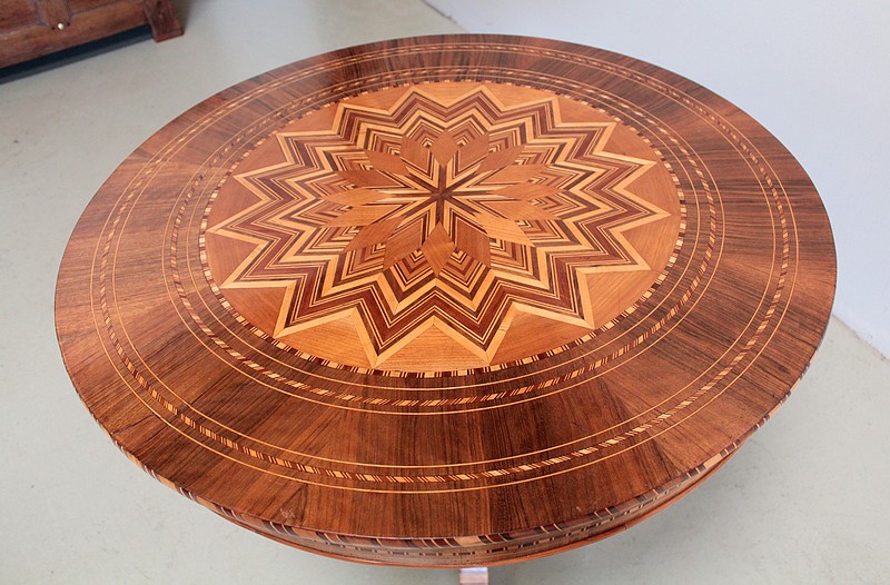 Le plateau, à décor de rosaces, est en marqueterie de noyer, merisier, amarante et citronnier. La ceinture et le piètement sont également marquetés.