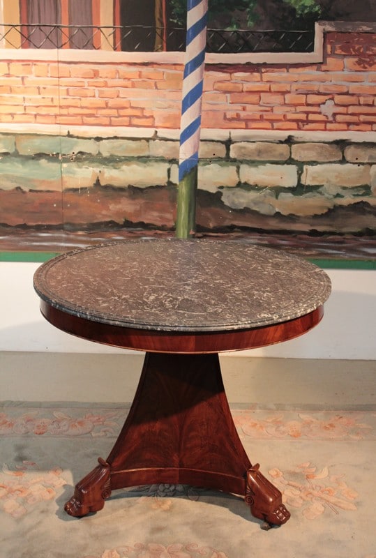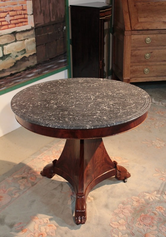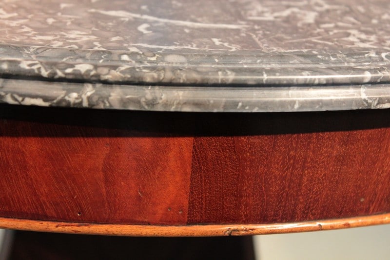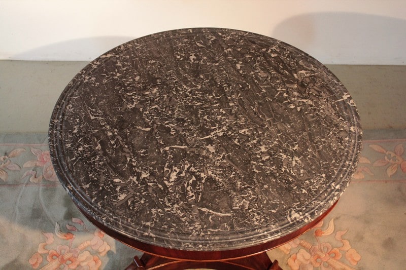 Guéridon Restauration en placage de ronce d’acajou à ceinture. Dessus en marbre gris Ste Anne à gorge en parfait état d’origine (ni fêle, ni rayure).