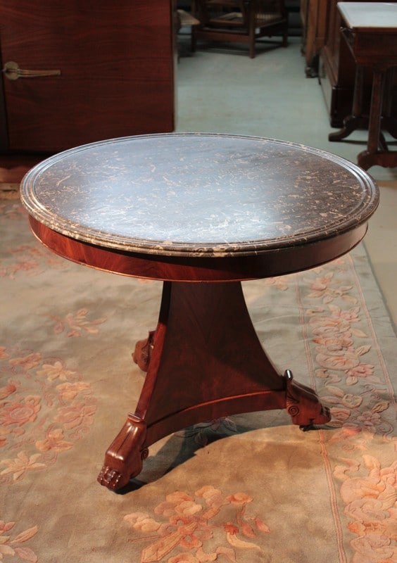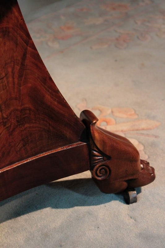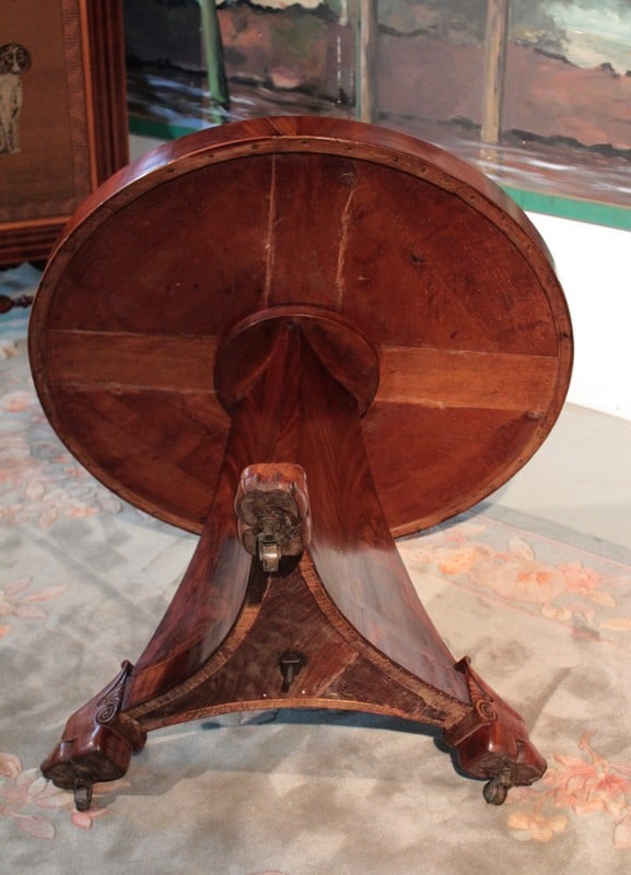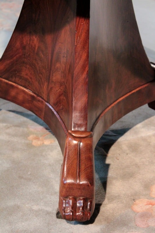 Il repose sur un fût pyramidal posé sur 3 pieds en griffes de lion massifs sur roulettes. Époque : début XIXe (1820).