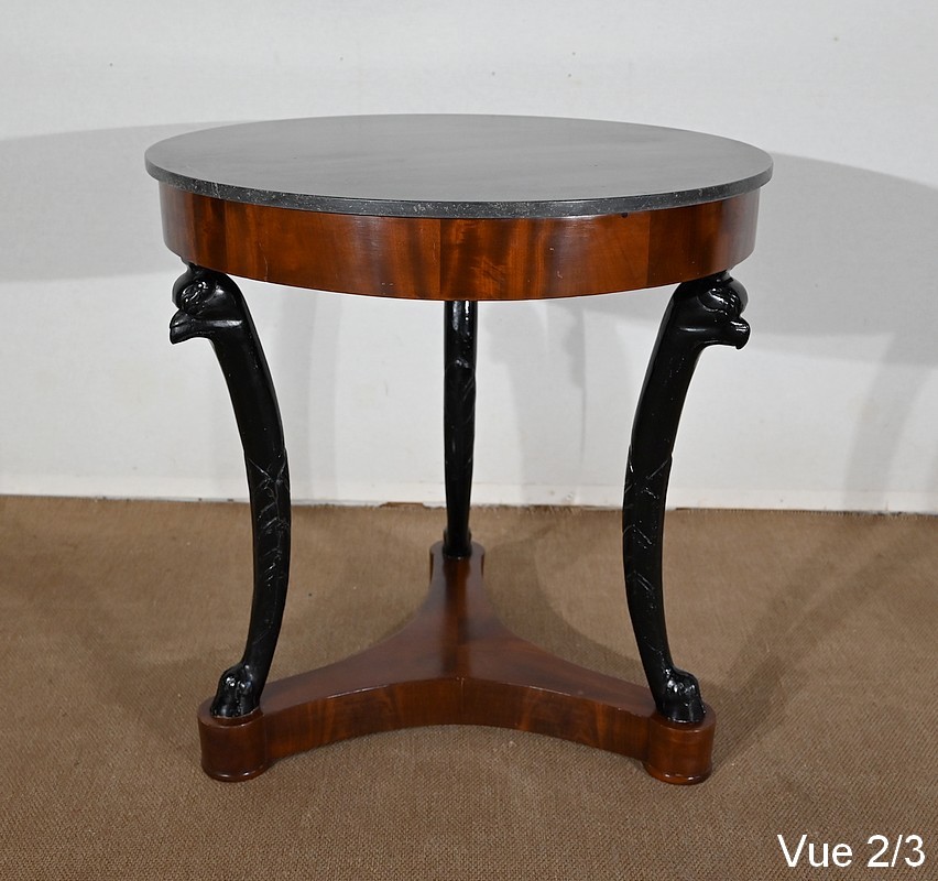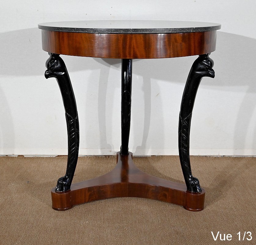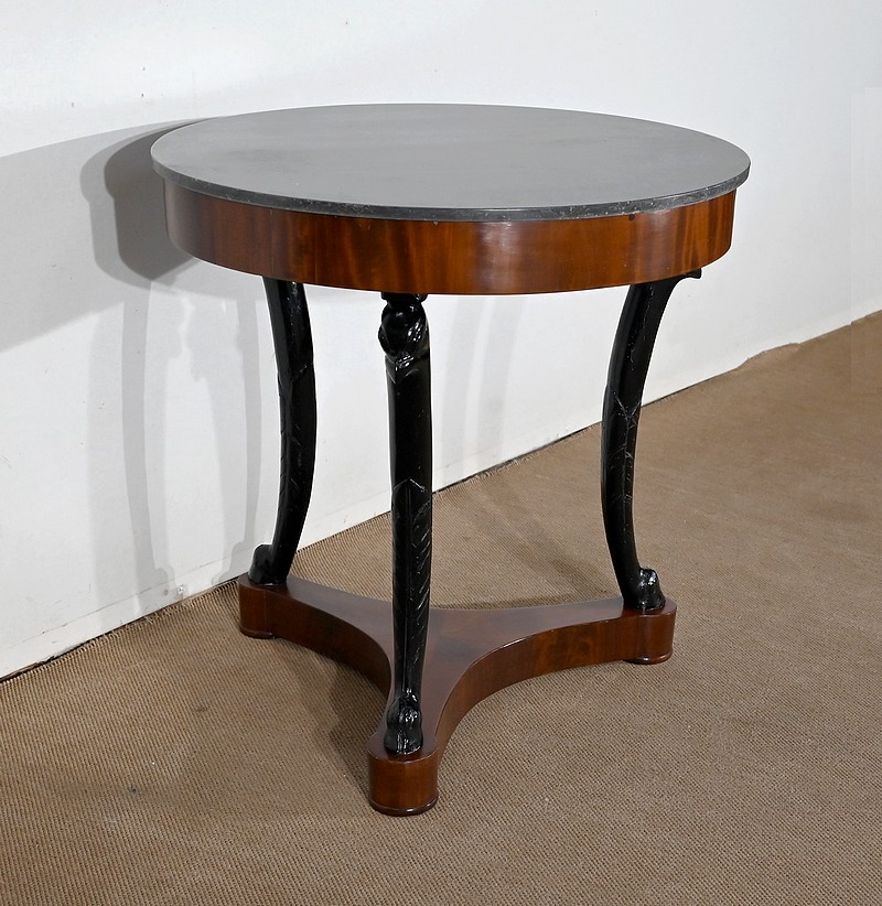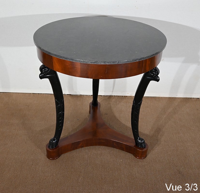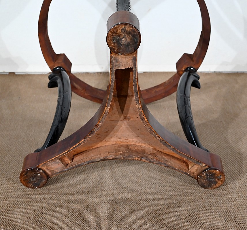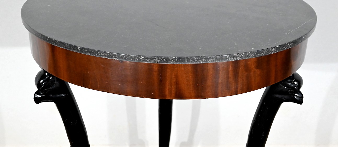 Guéridon circulaire Retour d’Égypte dont la ceinture est en placage d’acajou en fil tombant, surmonté d’un marbre granité belge.