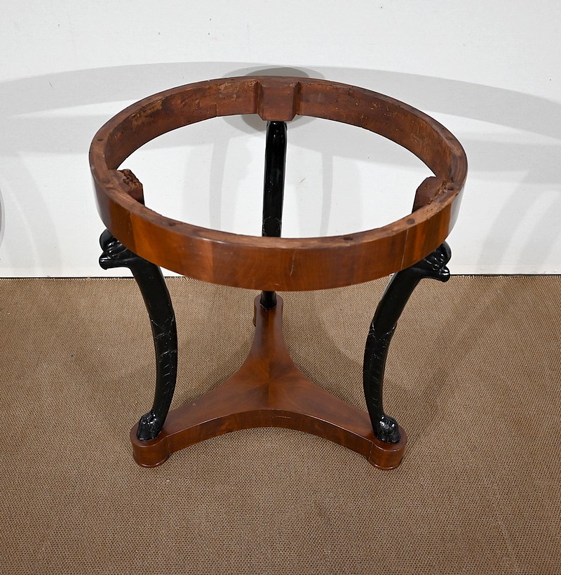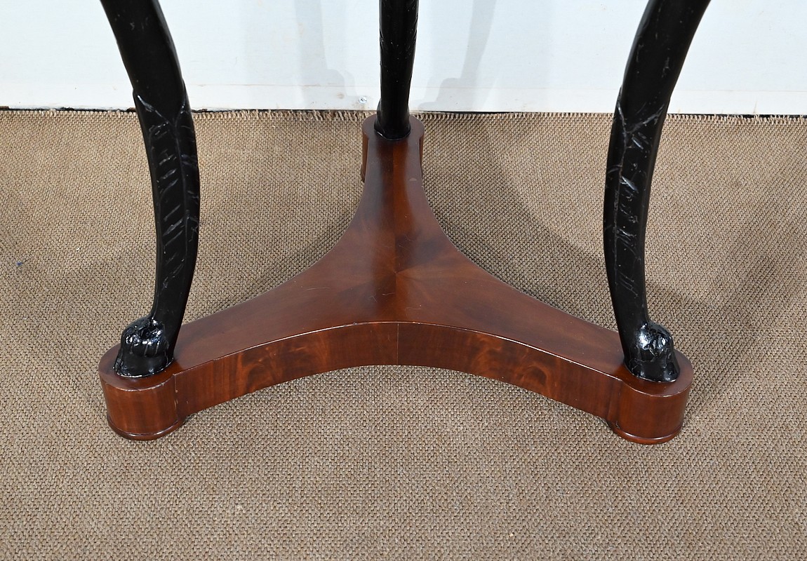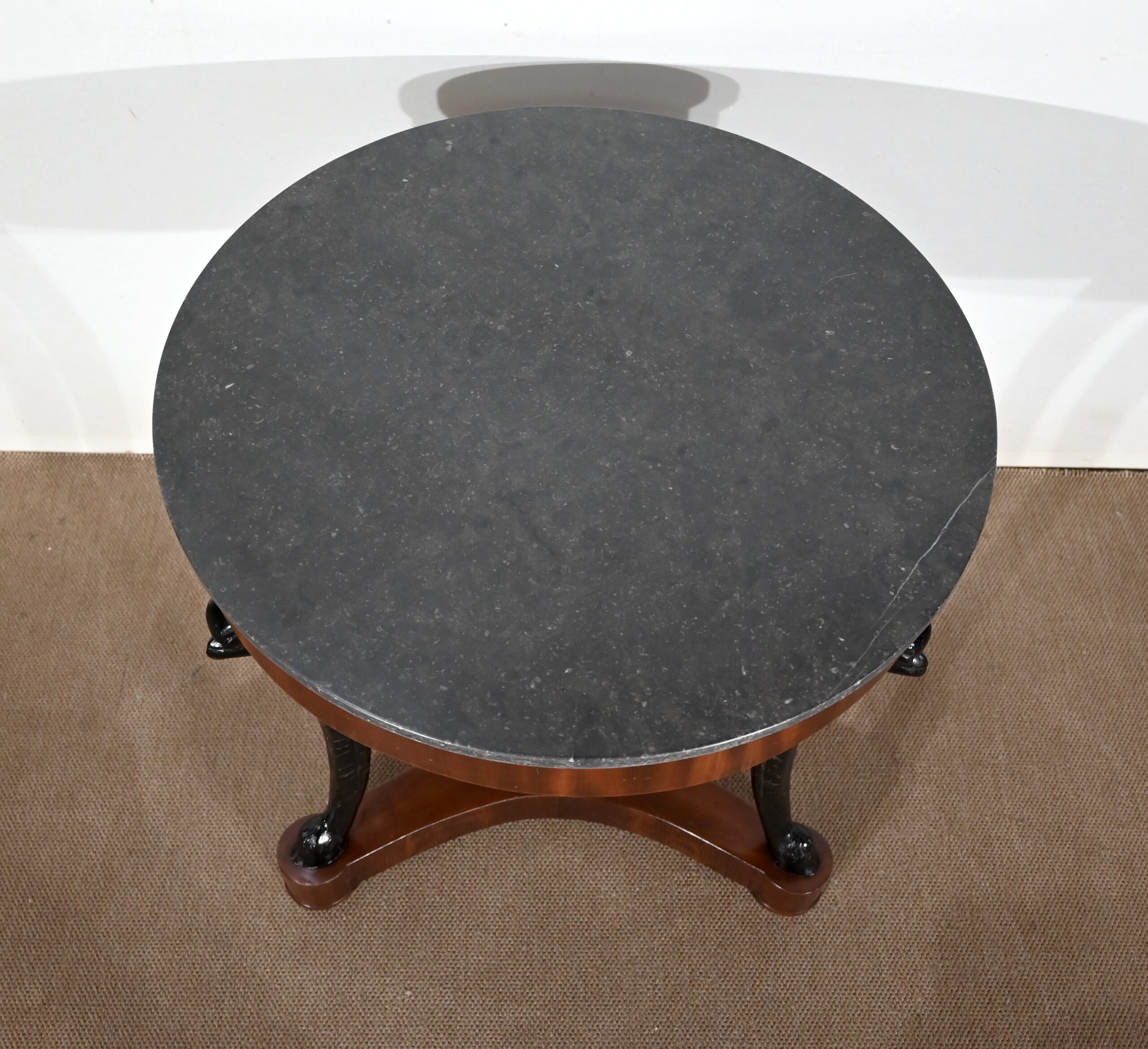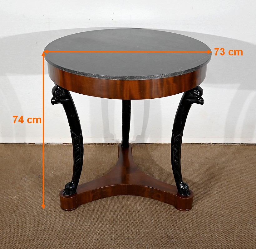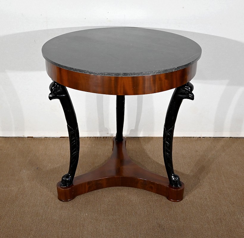 Guéridon circulaire Retour d’Égypte dont la ceinture est en placage d’acajou en fil tombant, surmonté d’un marbre granité belge.