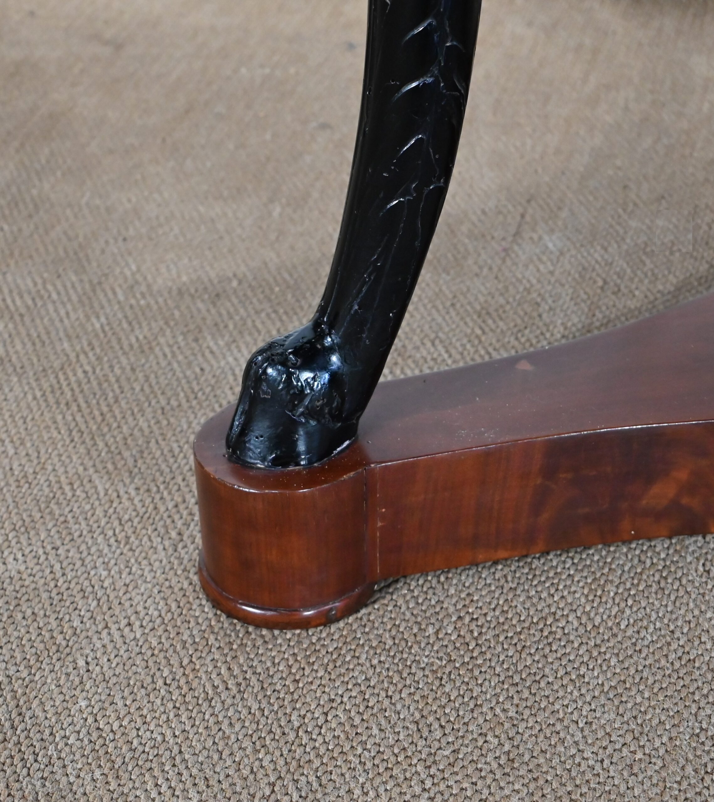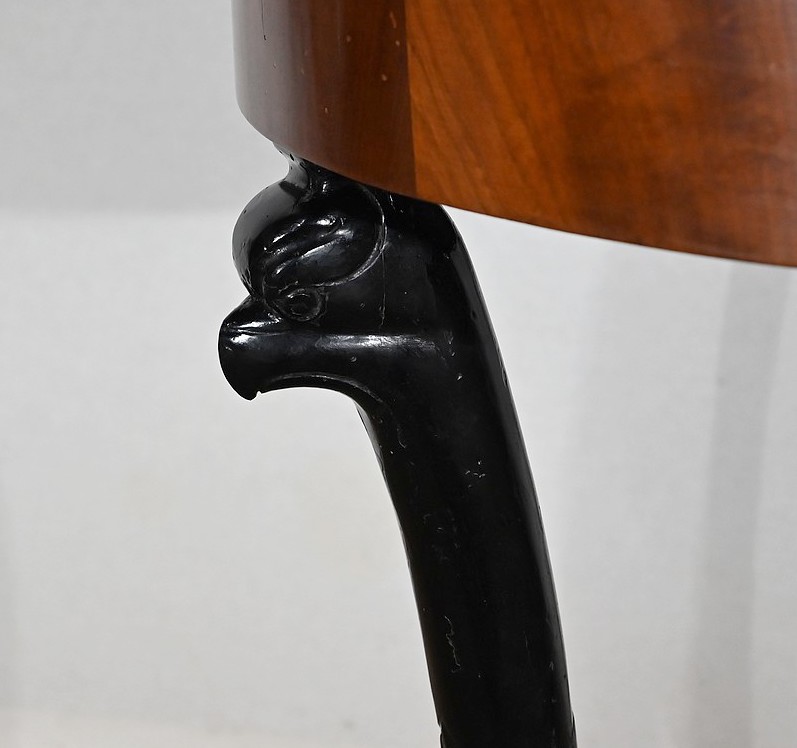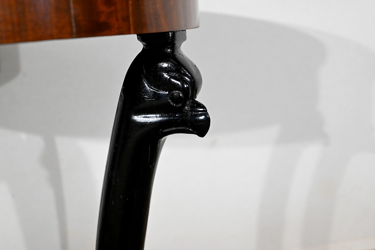 Cette petite table repose sur trois pieds en vernis noir. Ceux-ci sont sculptés en forme d’Horus élancés. Ils reposent sur une base constituée de trois côtés concaves dont le dessus en placage d’acajou est travaillé en étoile.