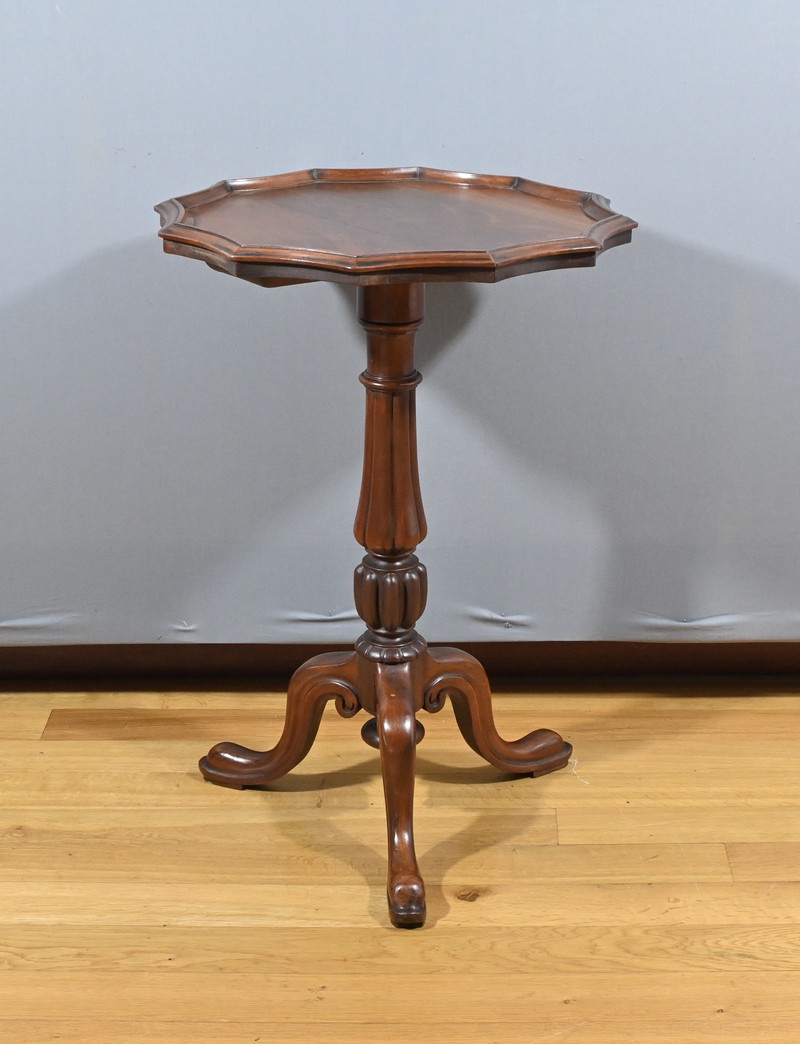 Guéridon circulaire doté d’un plateau mouvementé, entouré de moulures et muni de rebords (en cabaret).