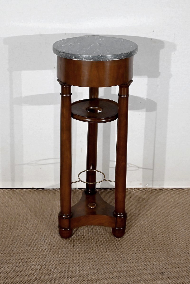 Utilisée durant l’empire comme barbière, cette élégante athénienne, se distingue par la petite dimension de son plateau circulaire et son beau marbre bleu d’Aspin. La ceinture en placage de merisier roux au veinage subtil est soutenue par trois pieds tournés en merisier massif s’affinant vers le haut et munis de collerettes en bois et de chapiteaux. Ceux-ci reposent sur une base en merisier massif aux trois côtés concaves. Enchâssés entre les pieds, nous retrouvons une tablette à cuvette moulurée sur le chant et en partie inférieure, une structure circulaire en laiton attachée par trois tiges.