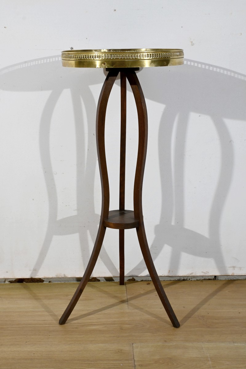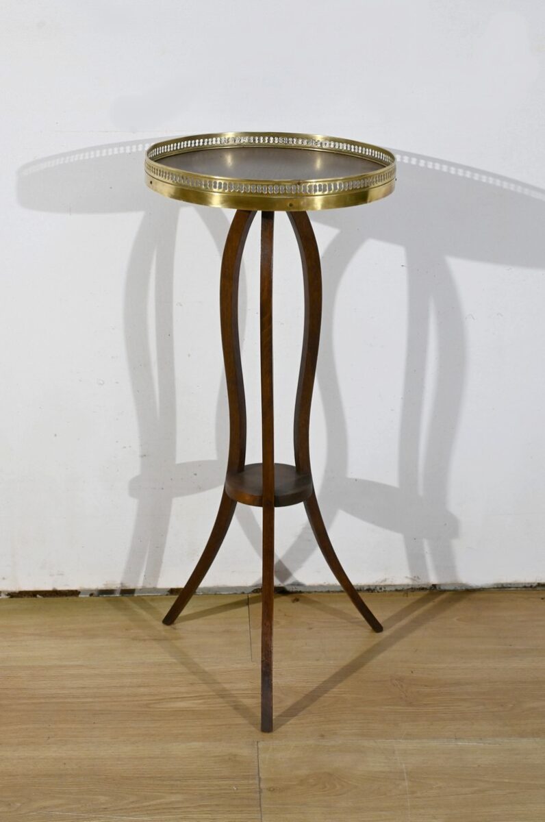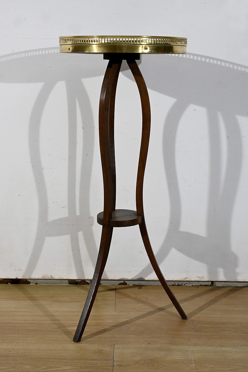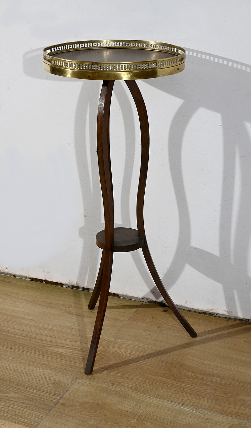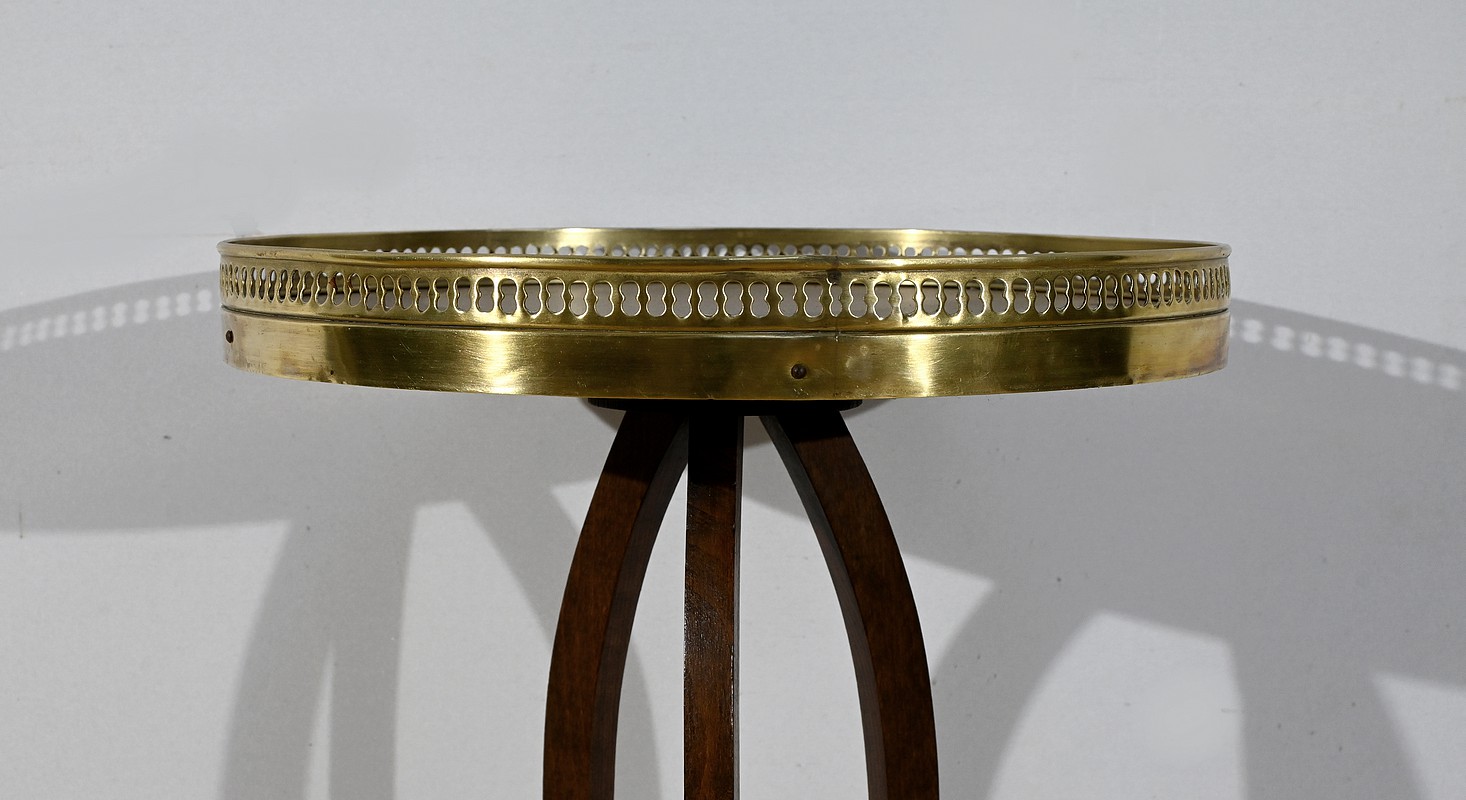 Charmant guéridon en acajou de style Louis XVI, dont le plateau est ceinturé d’une galerie ajourée en laiton. Le piétement tripode est composé de trois pieds évasés reliés à une tablette d’entrejambes circulaire également. Un petit mobilier élégant aux dimensions idéales pour les petits espaces.
