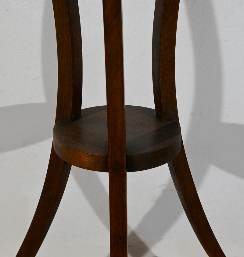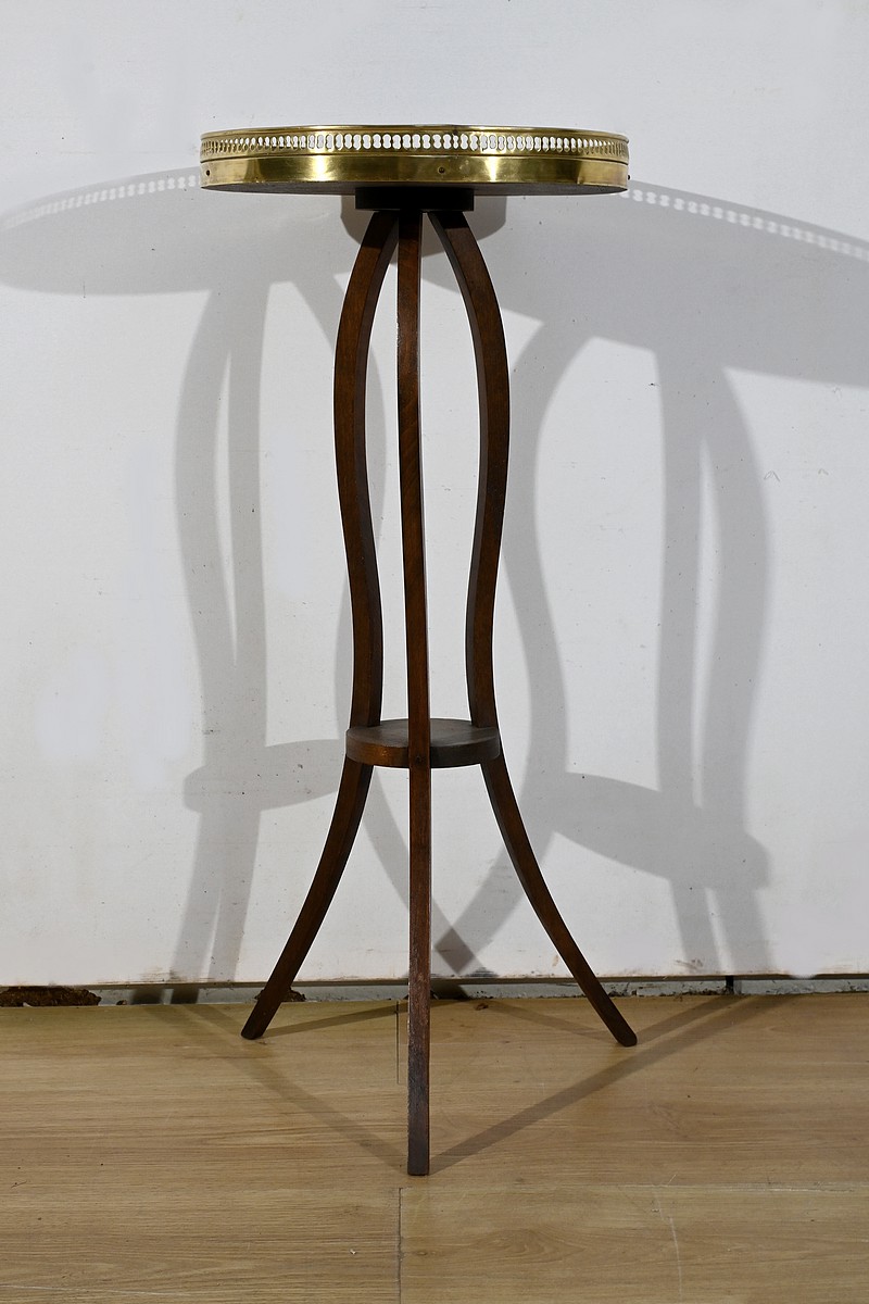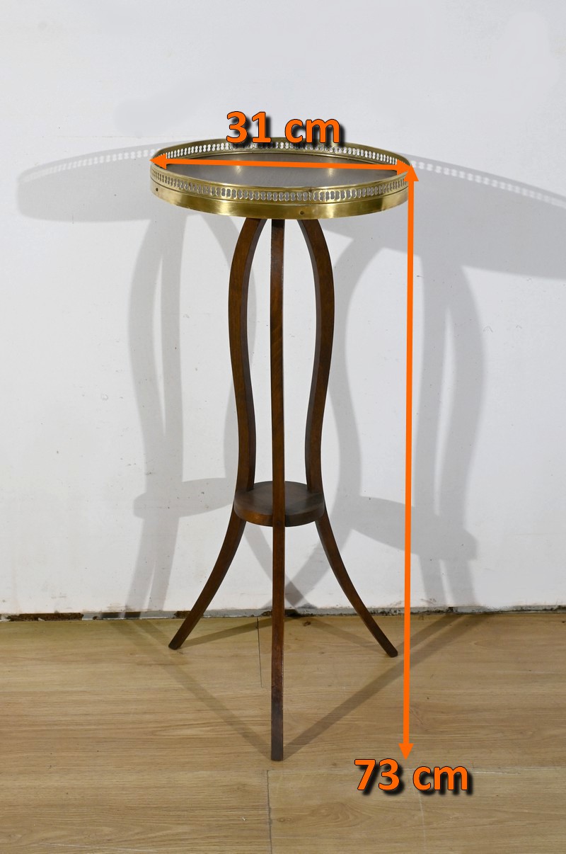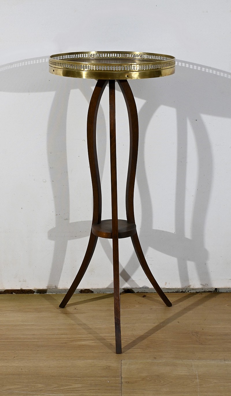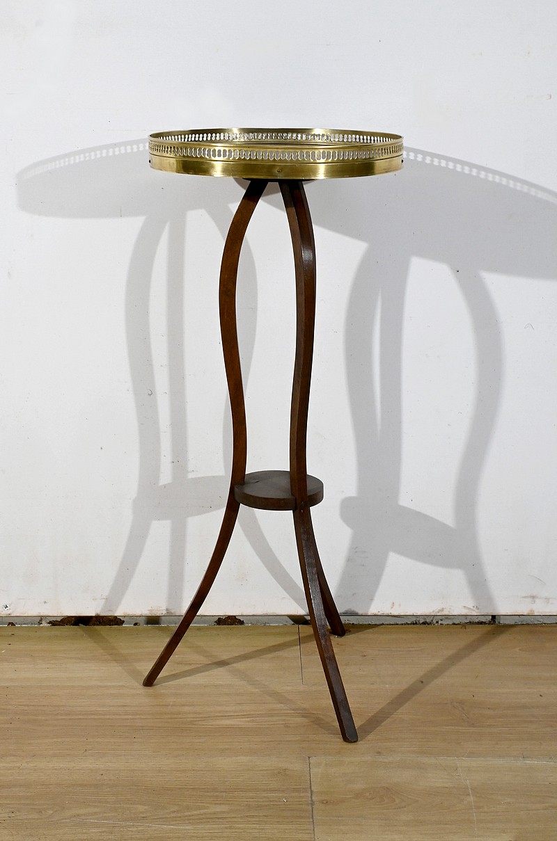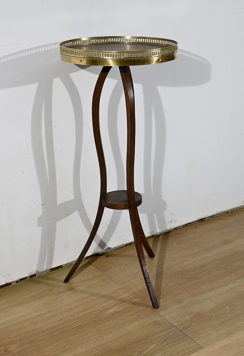Charmant guéridon en acajou de style Louis XVI, dont le plateau est ceinturé d’une galerie ajourée en laiton. Le piétement tripode est composé de trois pieds évasés reliés à une tablette d’entrejambes circulaire également. Un petit mobilier élégant aux dimensions idéales pour les petits espaces.