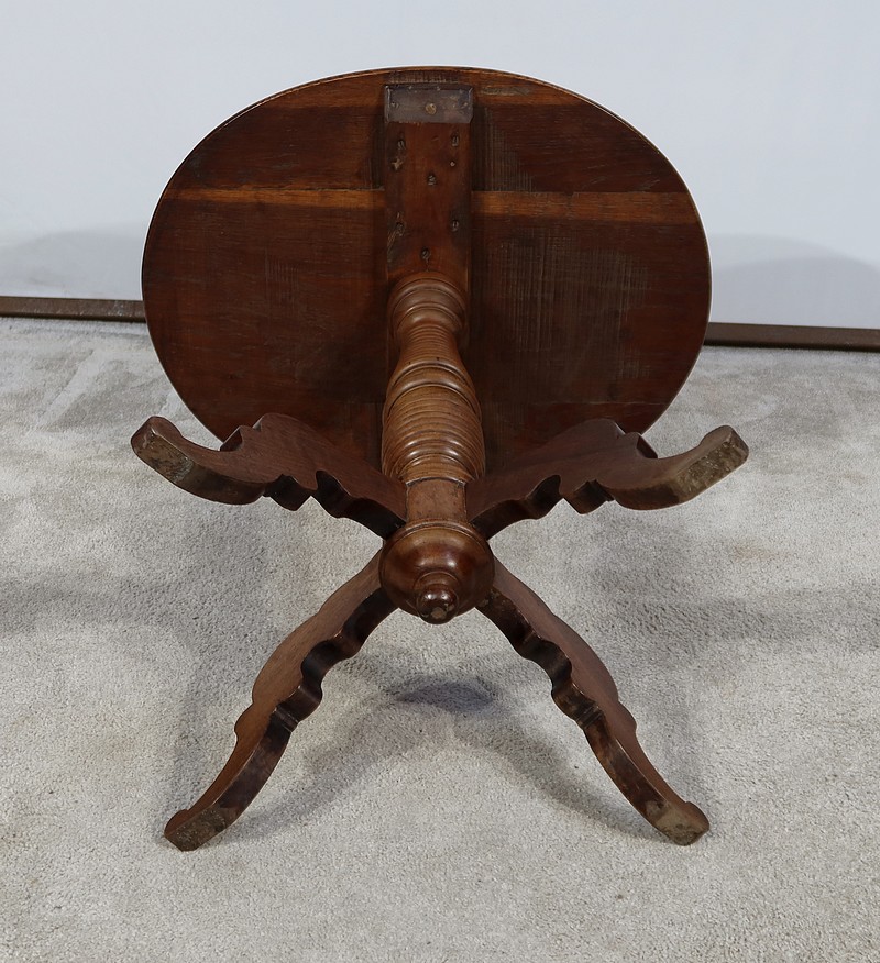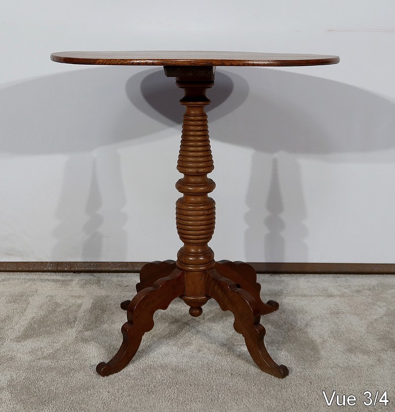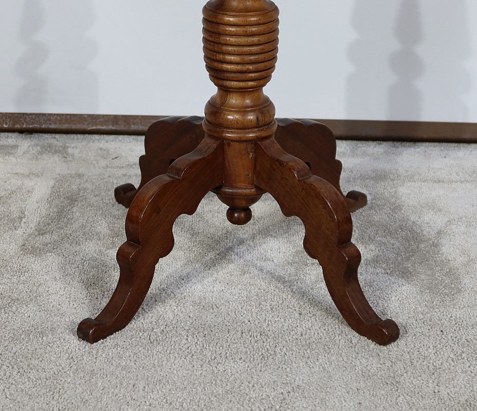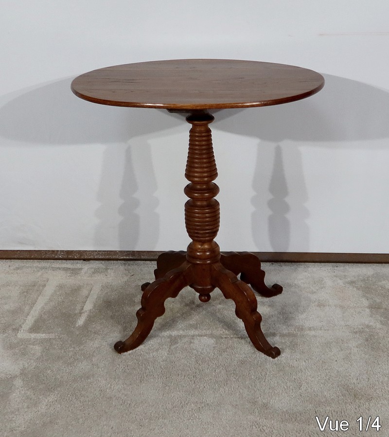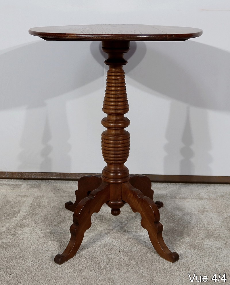 Cette petite table vous charmera par son fût tourné en chapelet se terminant par quatre pieds bas mouvementés en volute. Ces quatre pieds évasés à découpe apportent caractère à ce meuble datant du XIXe siècle.