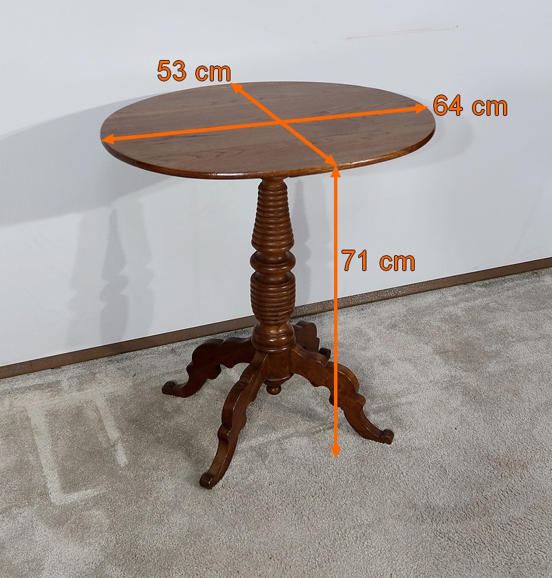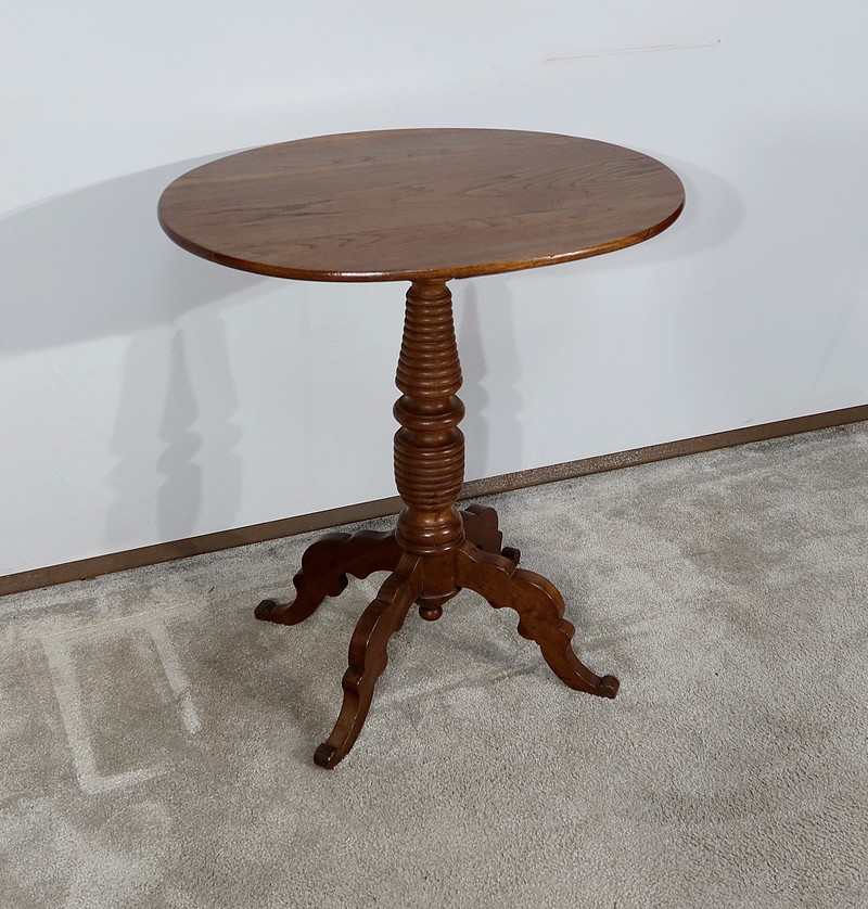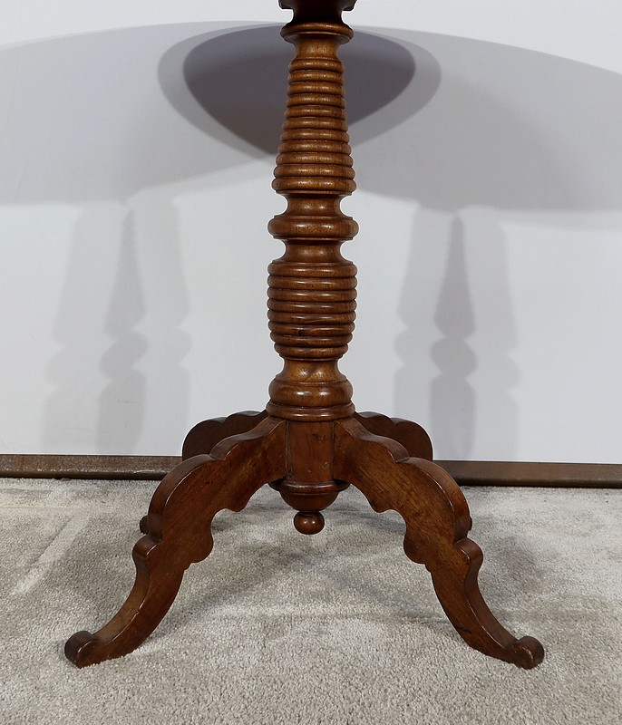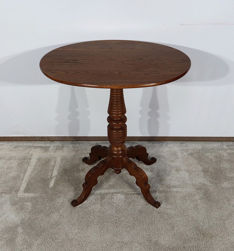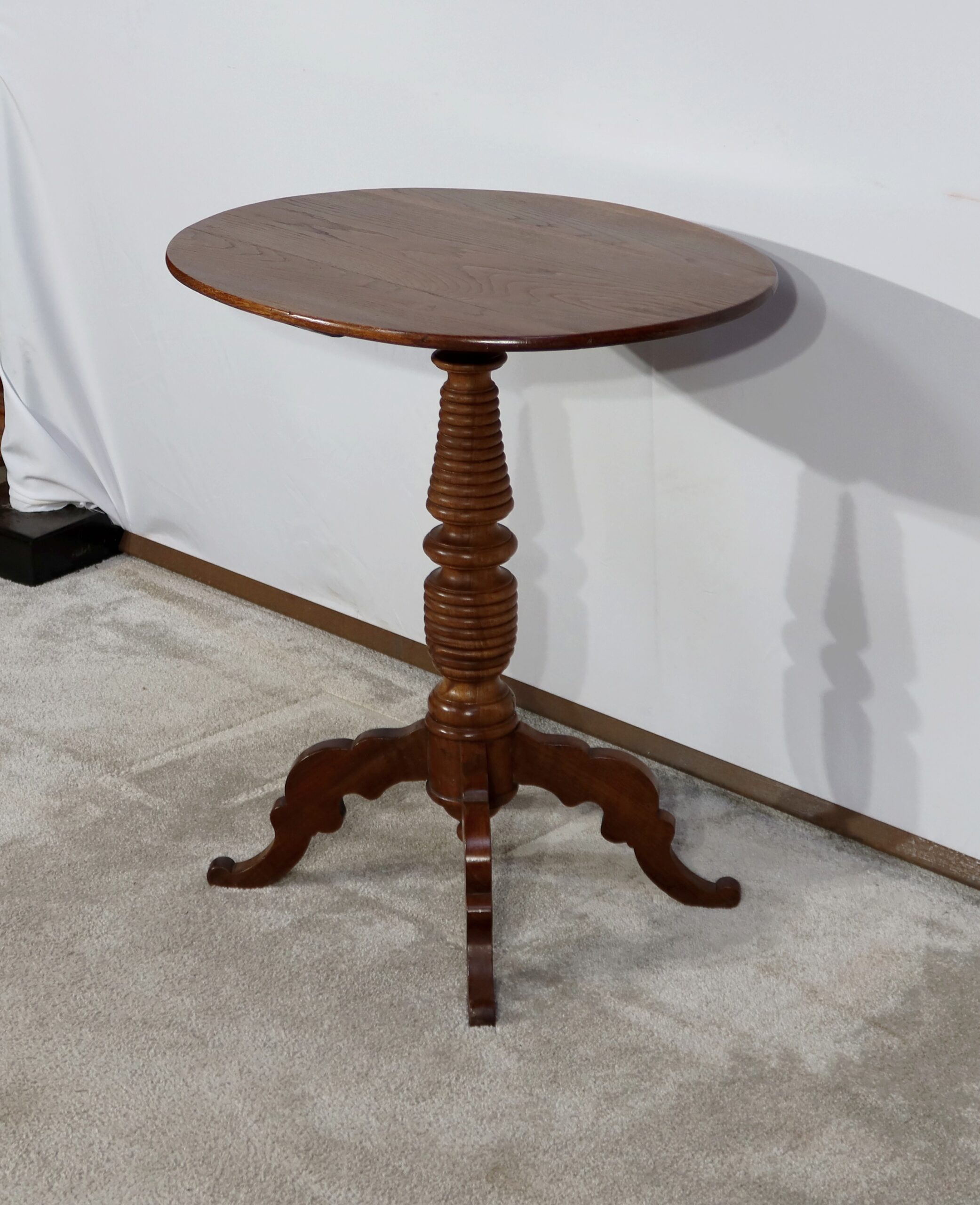 Cette petite table vous charmera par son fût tourné en chapelet se terminant par quatre pieds bas mouvementés en volute. Ces quatre pieds évasés à découpe apportent caractère à ce meuble datant du XIXe siècle.
