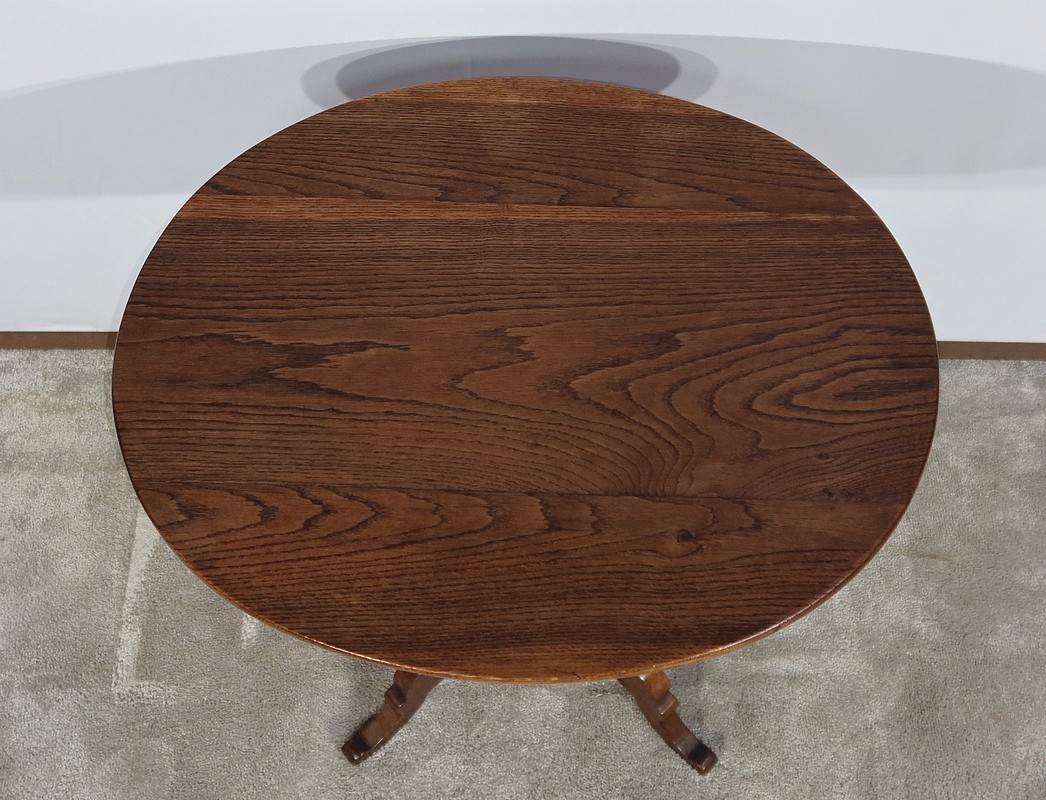 Charmant guéridon de forme oblongue constitué d’un dessus en chêne massif et d’un piétement en noyer.