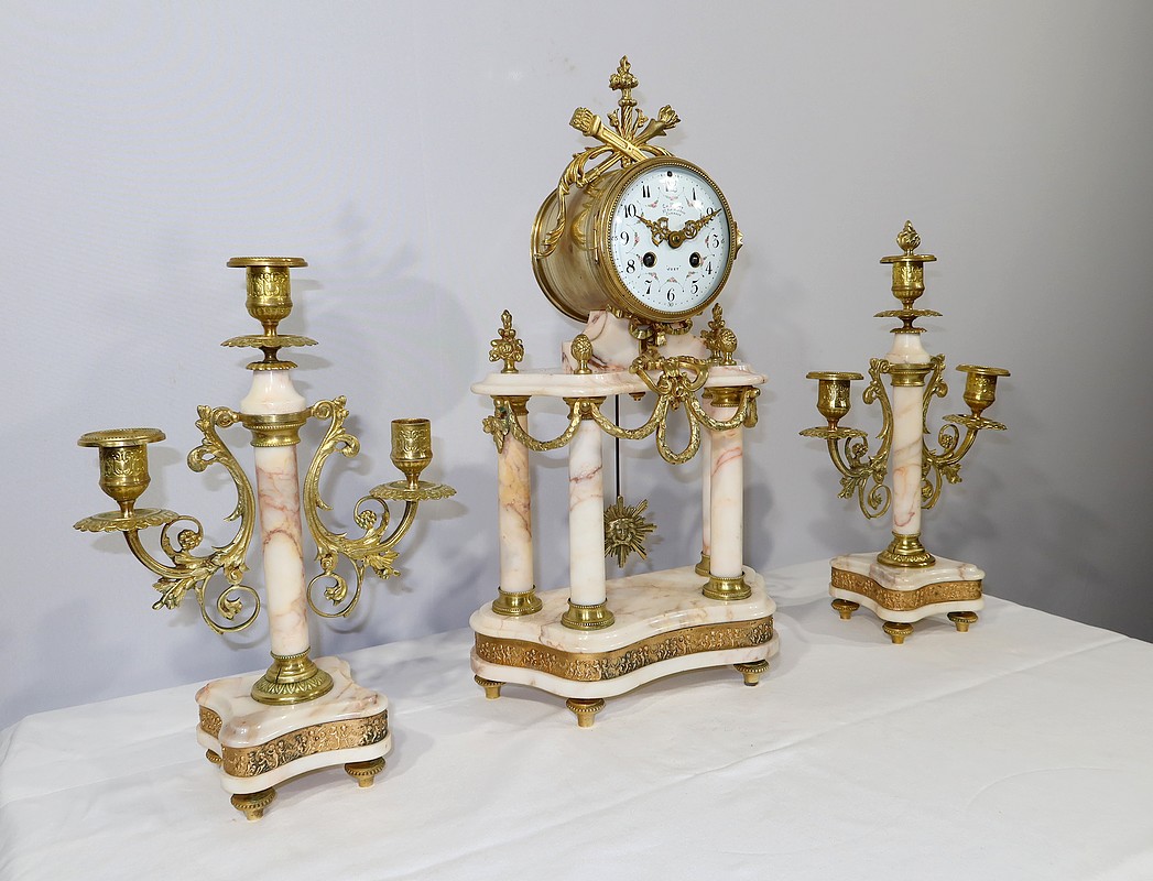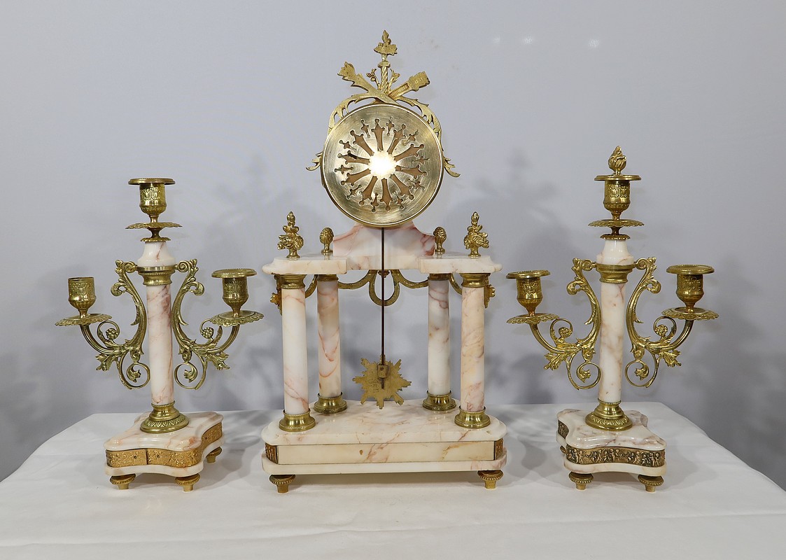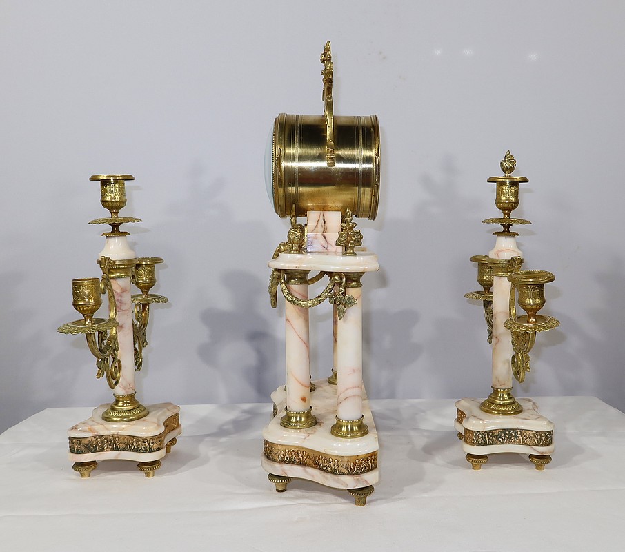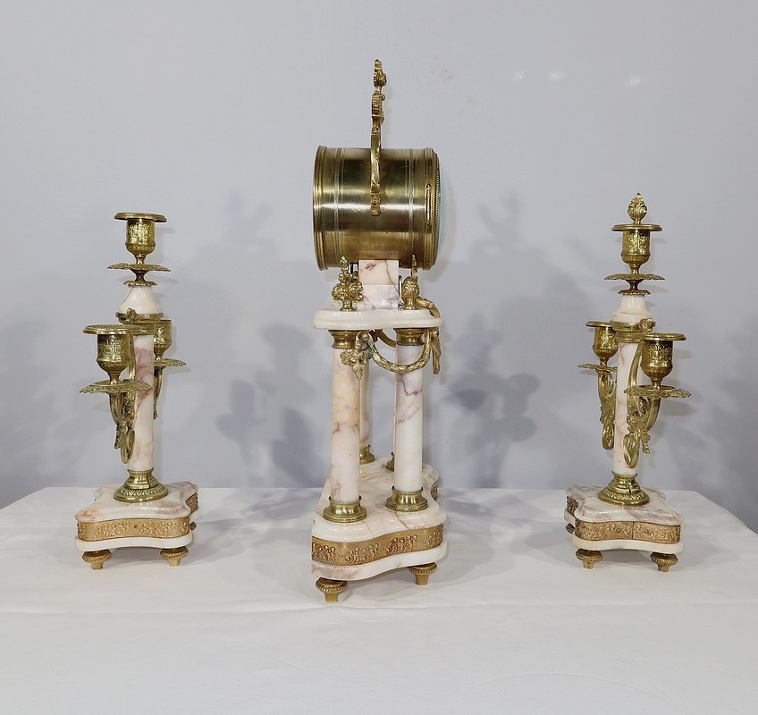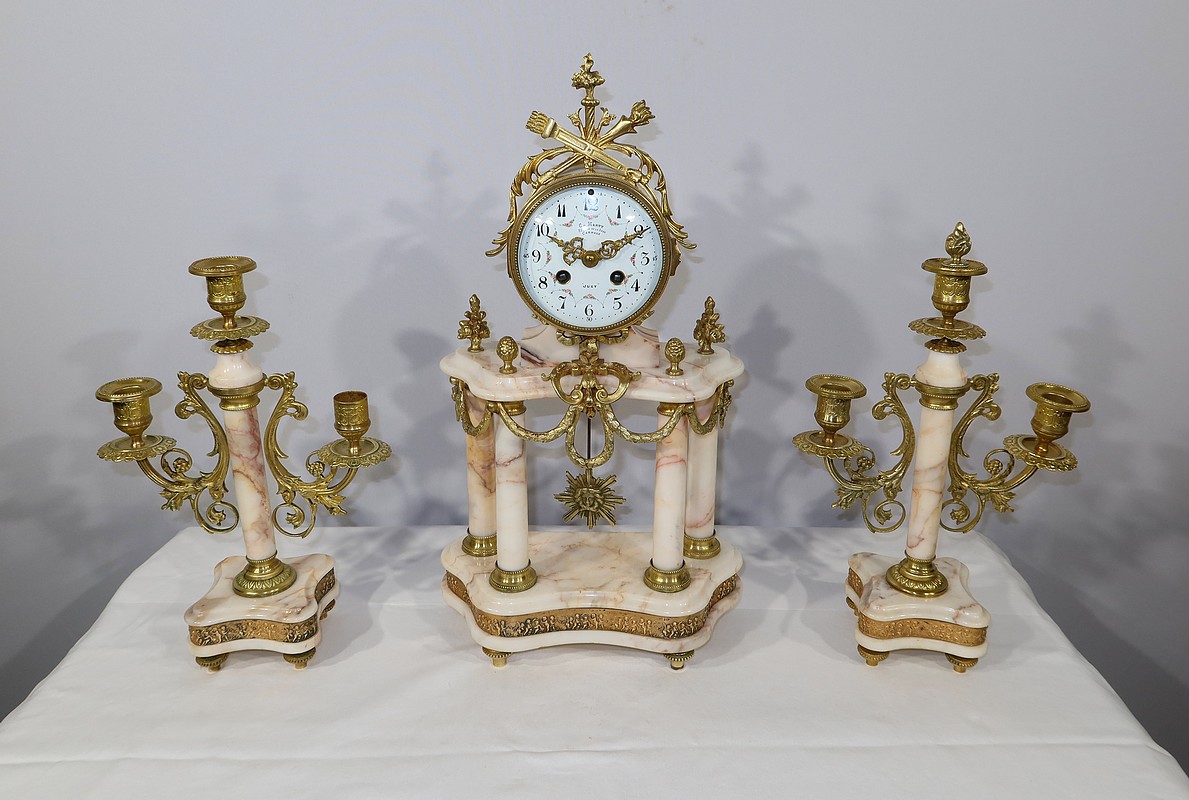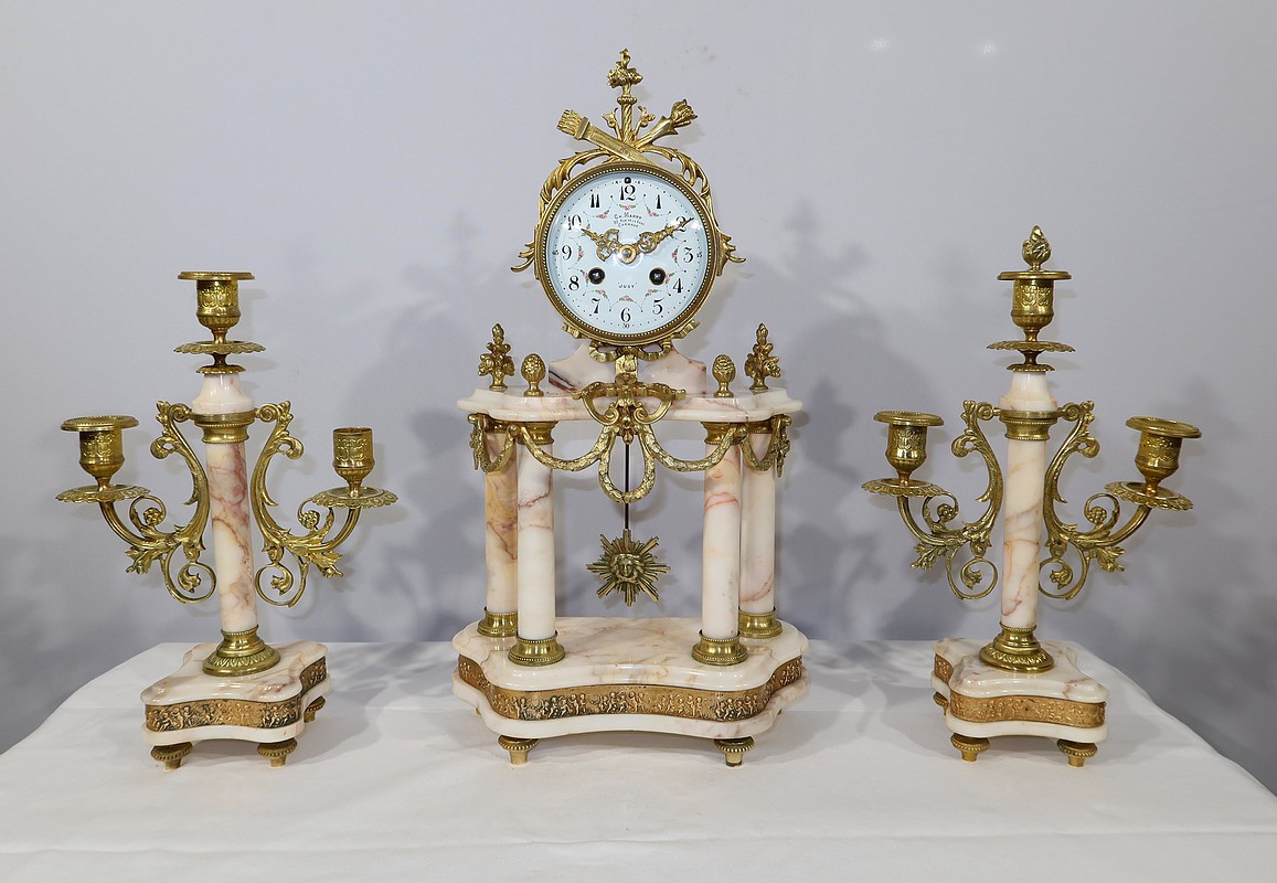 Bel ensemble trois pièces en marbre et bronze, constitué d’une pendule et de deux candélabres assortis.
