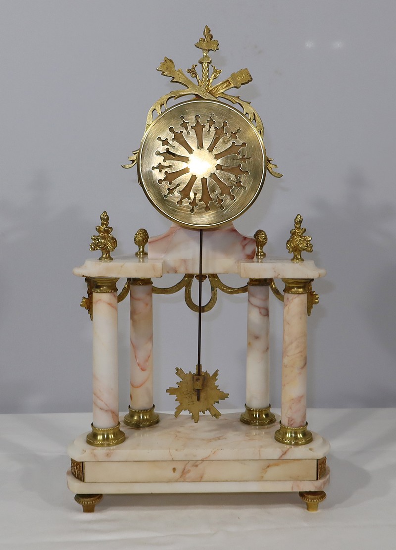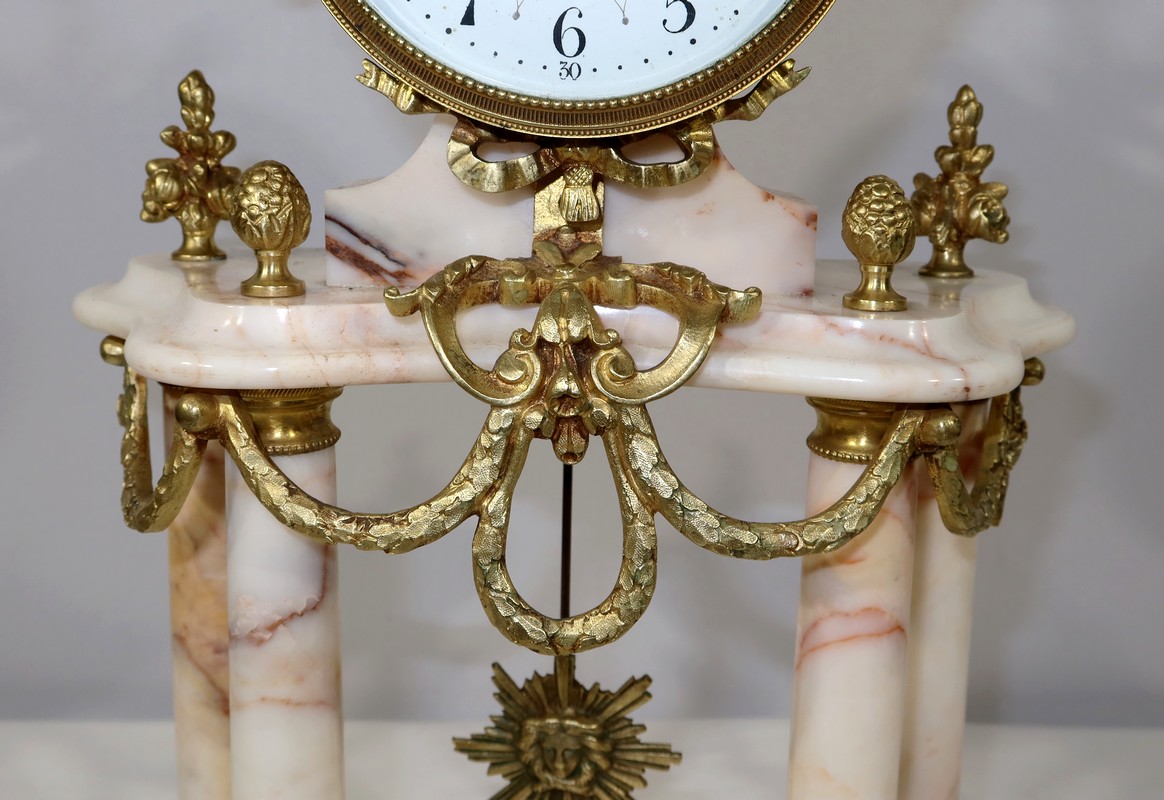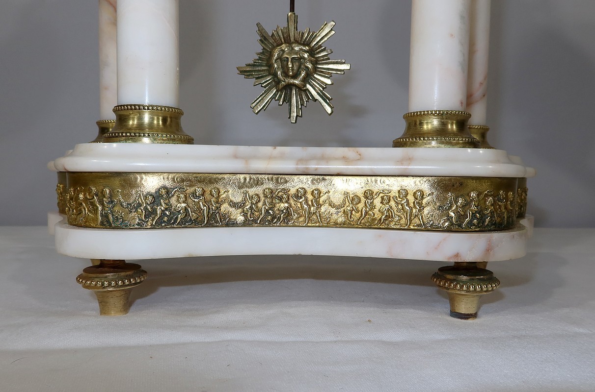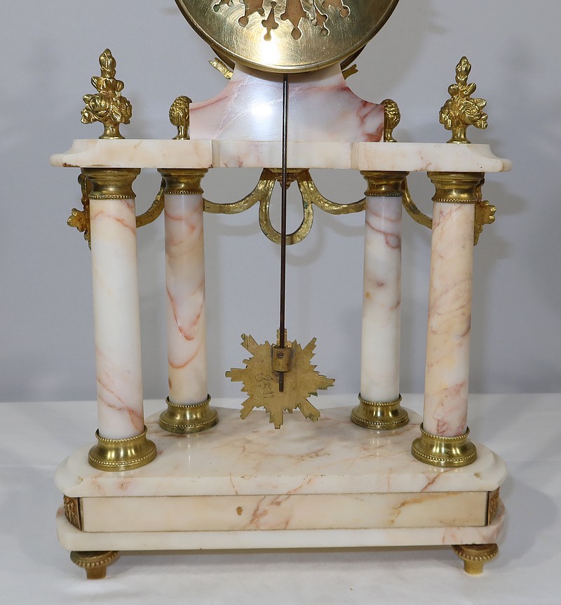 Quatre colonnes cylindriques en marbre sont agrémentées de collerettes en partie haute et basse, et supportent un socle mouluré et le cadran. L’ensemble est ornementé de guirlandes, de volutes, de pommes de pin et de bouquets en bronze façonné.