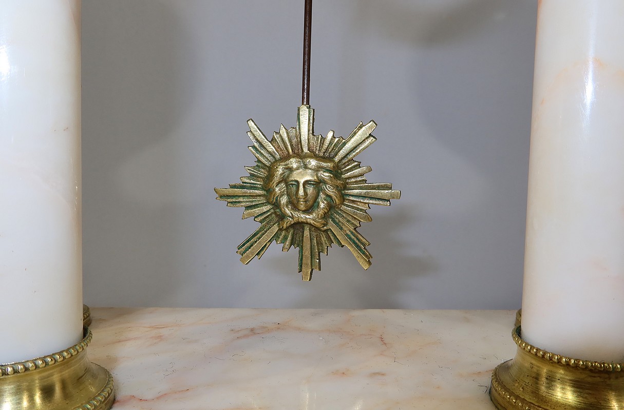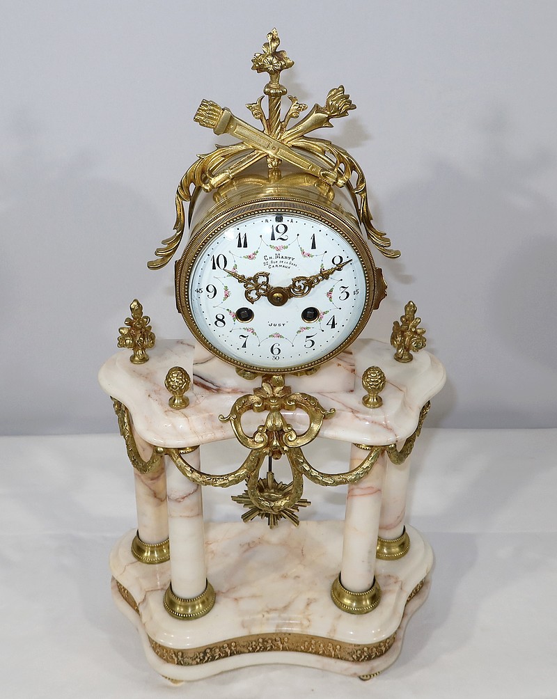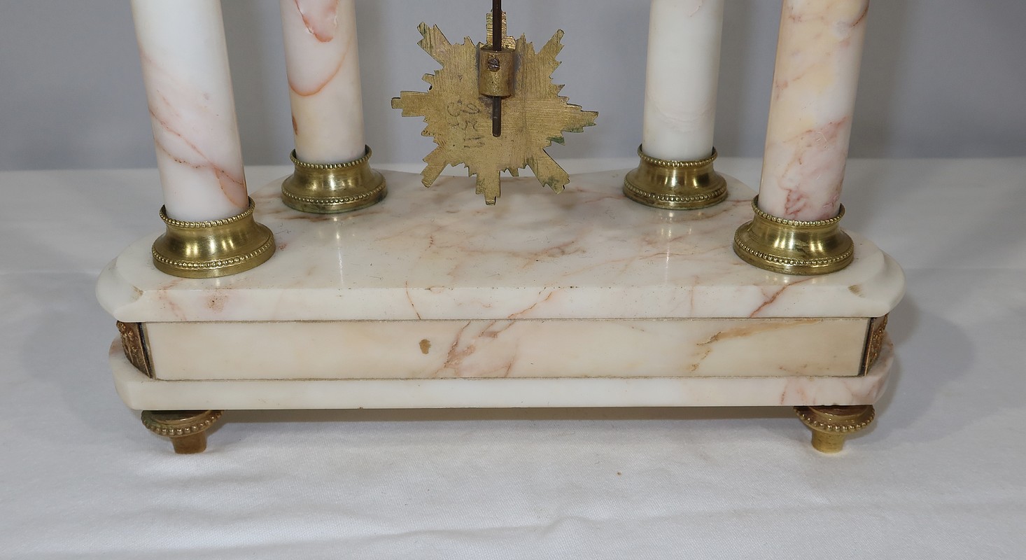 Quatre colonnes cylindriques en marbre sont agrémentées de collerettes en partie haute et basse, et supportent un socle mouluré et le cadran. L’ensemble est ornementé de guirlandes, de volutes, de pommes de pin et de bouquets en bronze façonné.