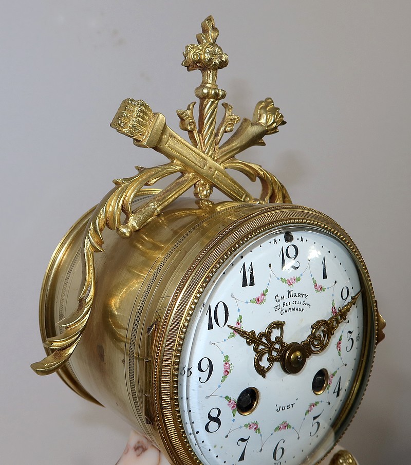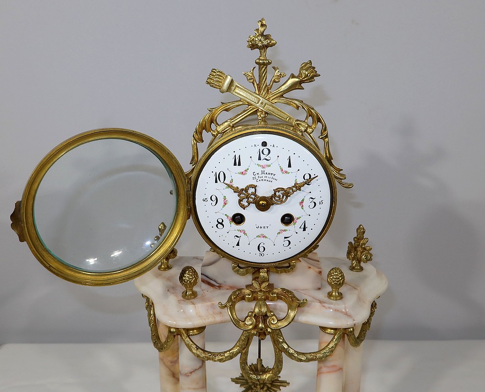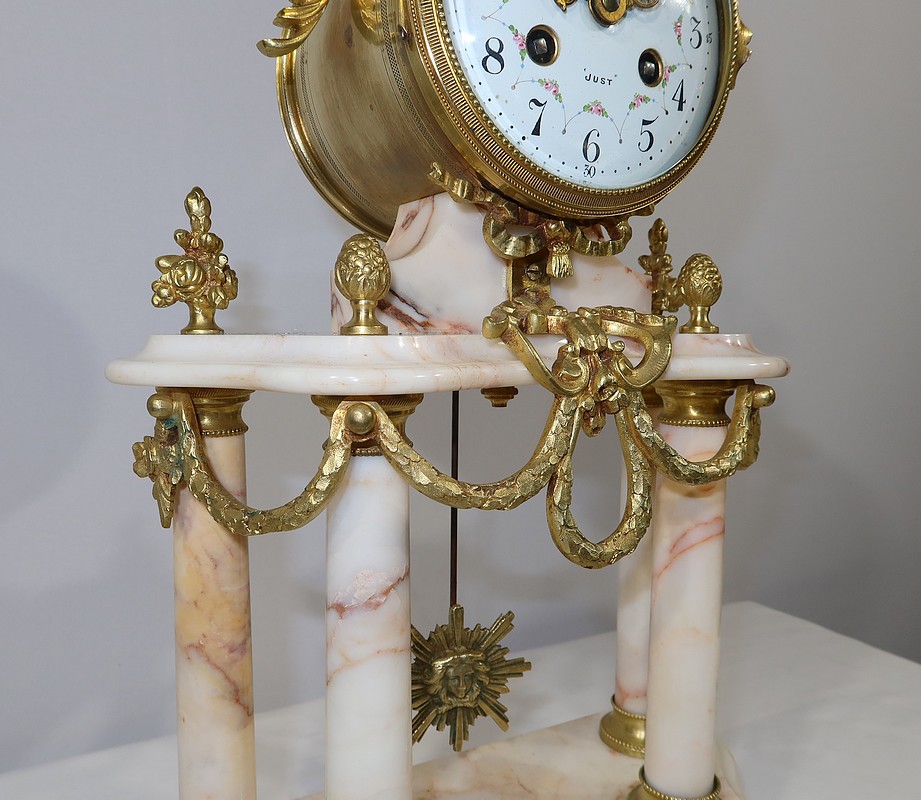 Cette pendule en bronze doré Louis XVI vous ravira par sa finesse, son marbre lumineux et ses ornementations.