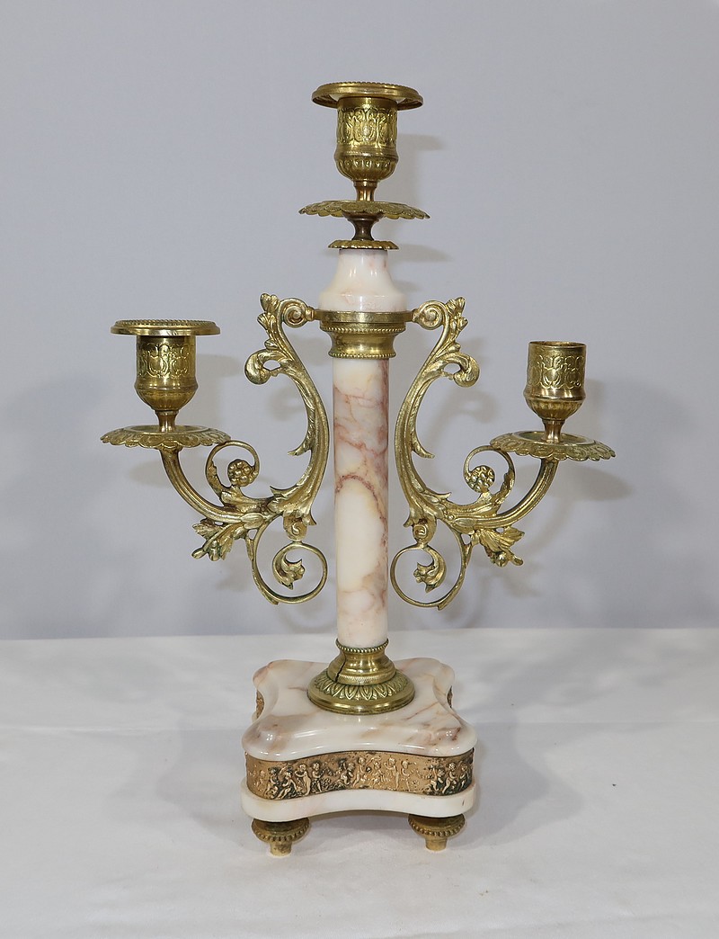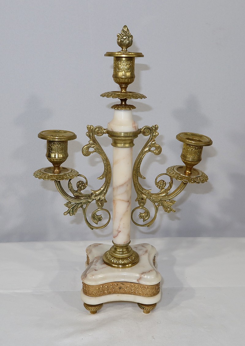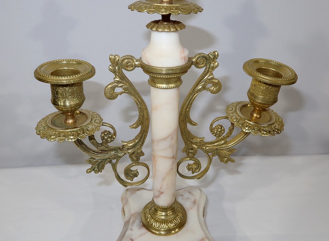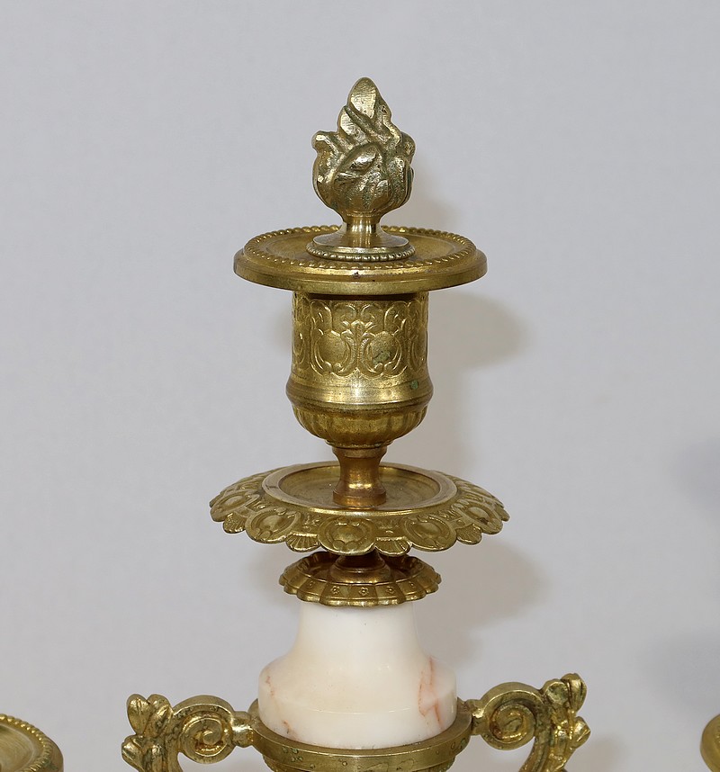 Deux candélabres assortis complètent l’ensemble. Ils ont un socle de section carrée et le fût cylindrique est agrémenté de collerettes ciselées. De chaque côté, un élément en volute forme une branche supportant la bobèche.